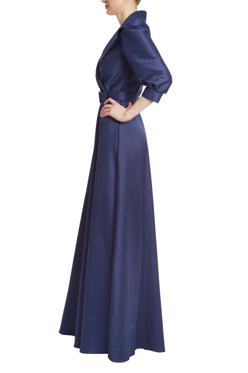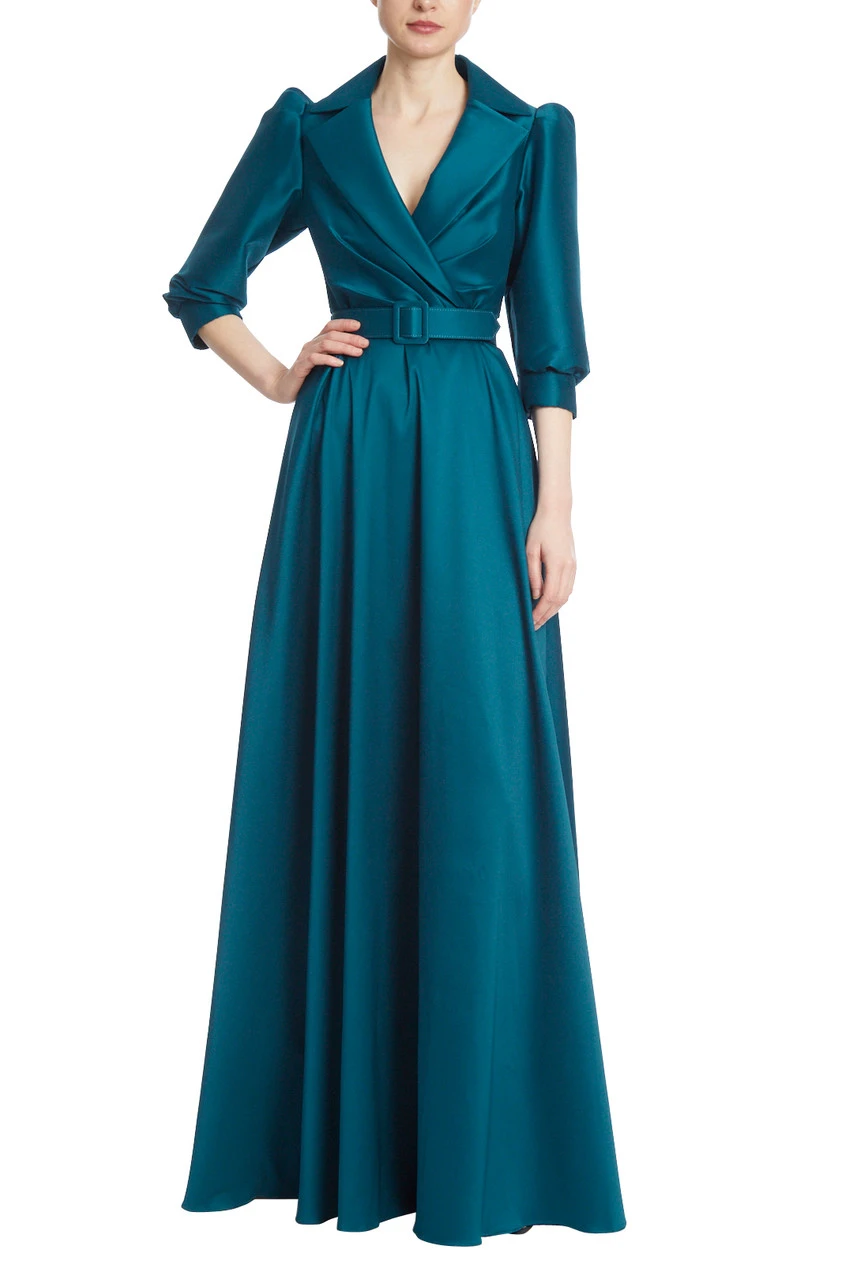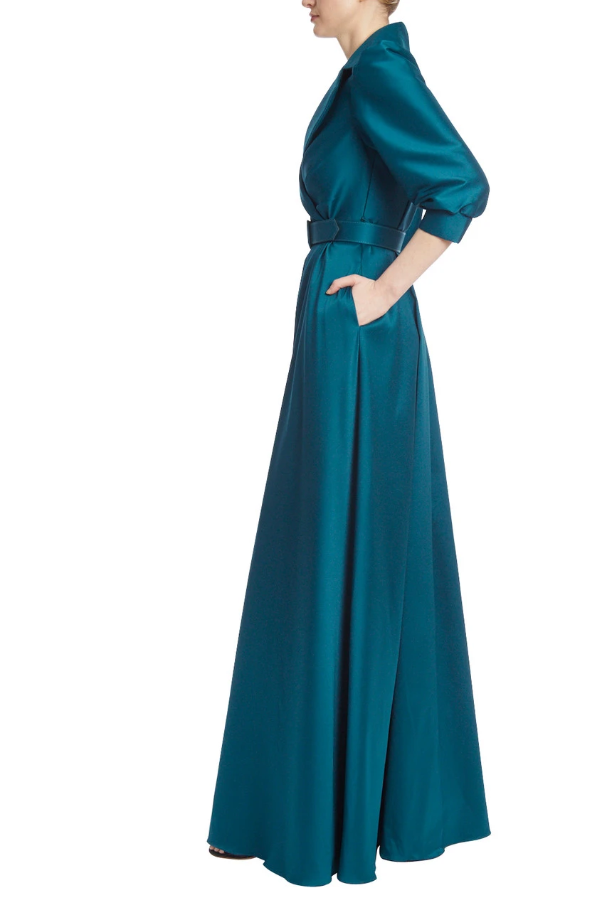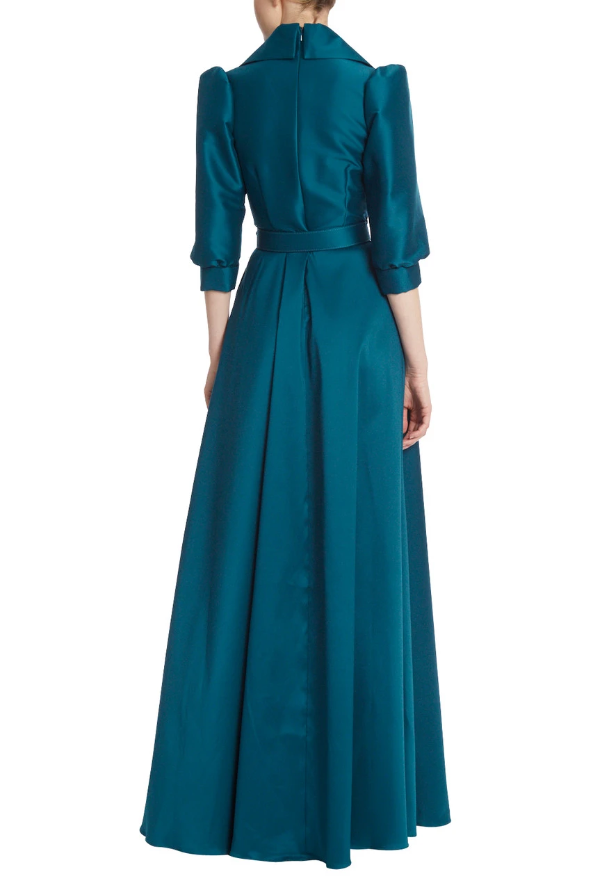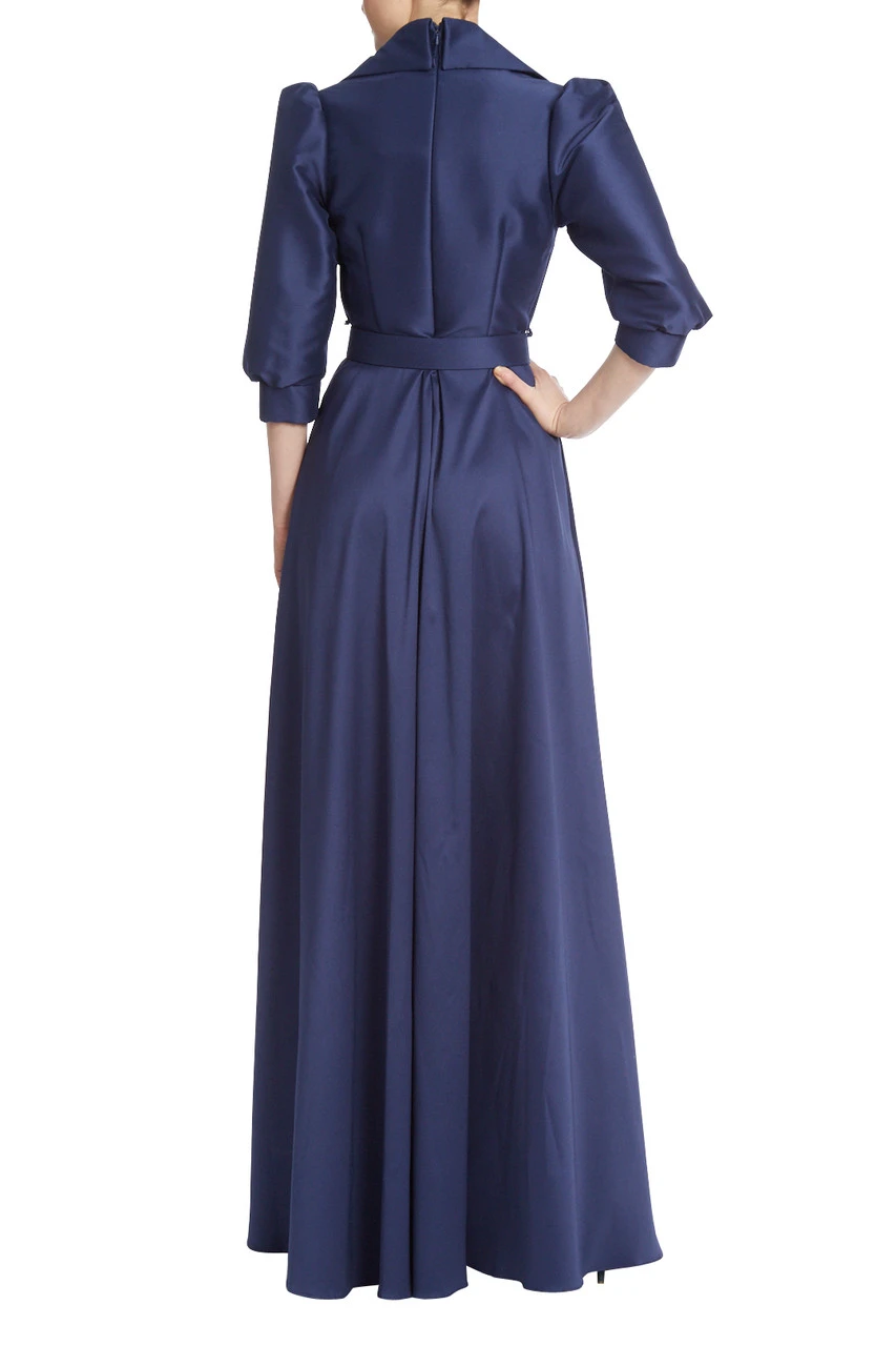 This floor-length gown is fitted to create an hourglass silhouette, with a belt perfectly placed at the waist. Puffed sleeves and a deep V-neck add an avant-garde and alluring twist to this look. Combined with the feminine, cascading full-length skirt, the perfect dynamic of femininity and power is achieved.
