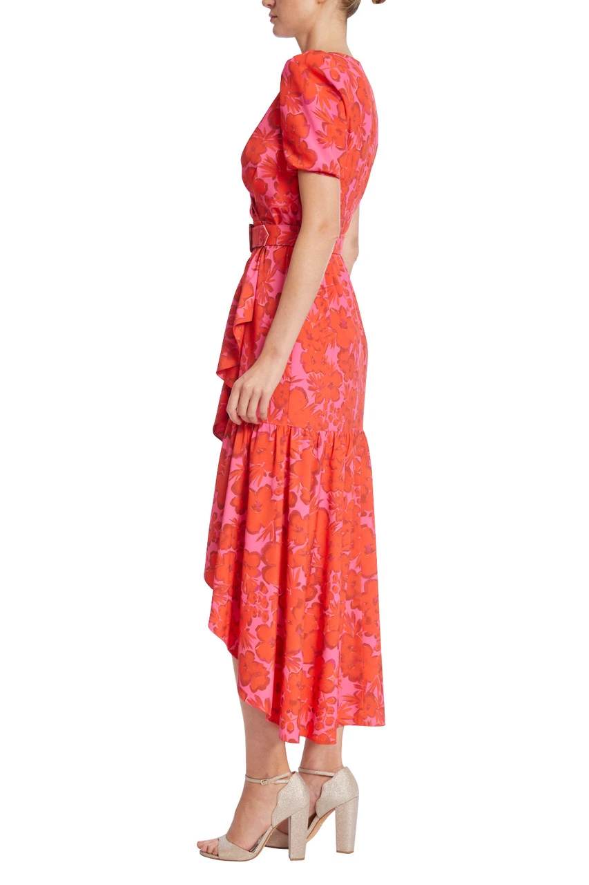 This midi-length dress is a wardrobe staple you’ll want to wear all season long. It expertly incorporates pretty, feminine details—like the V-shaped neckline, short sleeves, and an allover floral print—with edgy elements—like the waist-cinching belt and asymmetrical, ruffled skirt. Made of luxuriously soft crepe de chine, it is sure to be one of those pieces that gets worn again and again!
