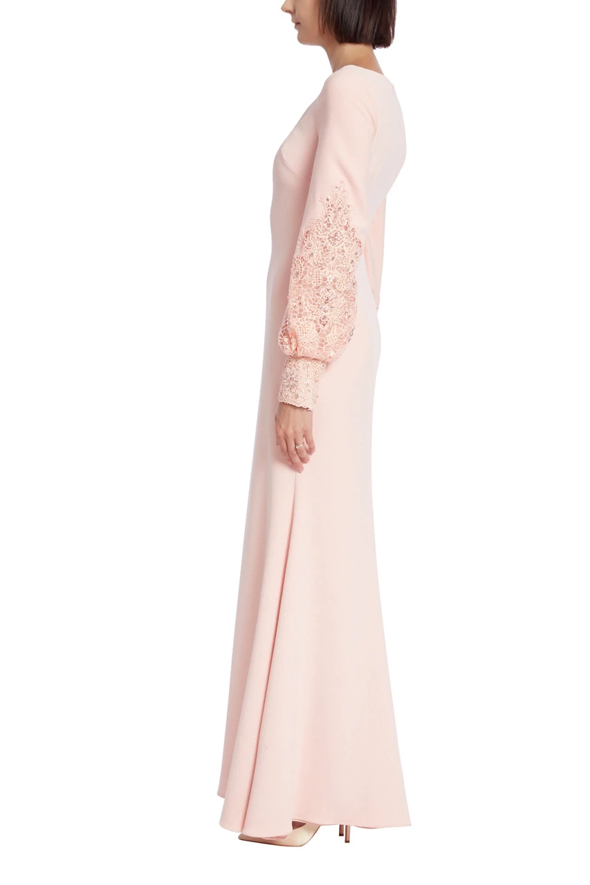 This gown embodies an undeniable feminine, romantic style that will make you feel like the belle of the ball any time of the year. This stunning piece features delicate floral lace details along the bishop sleeves, which pair beautifully with the sequins that also adorn the sleeves. The result is a dress that is both timeless and flattering, making it a perfect choice for a night out or an evening soiree.