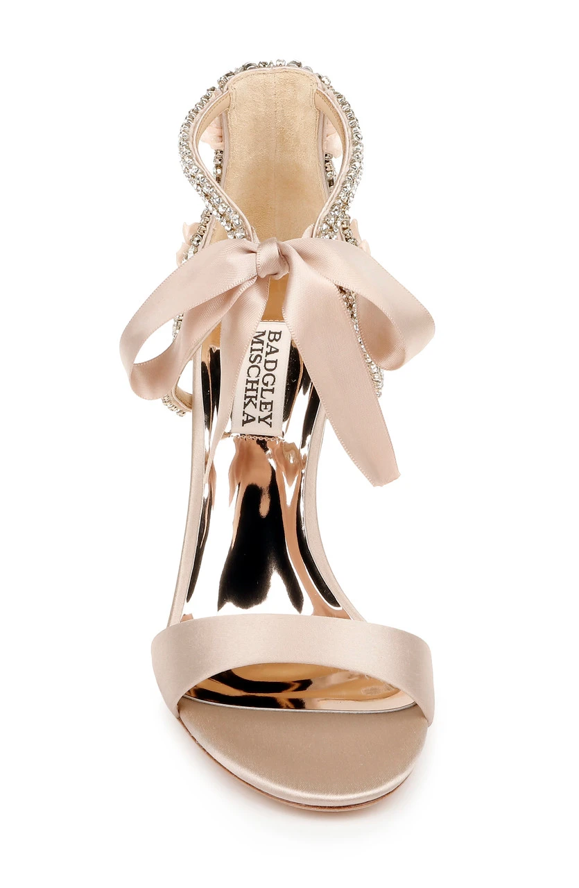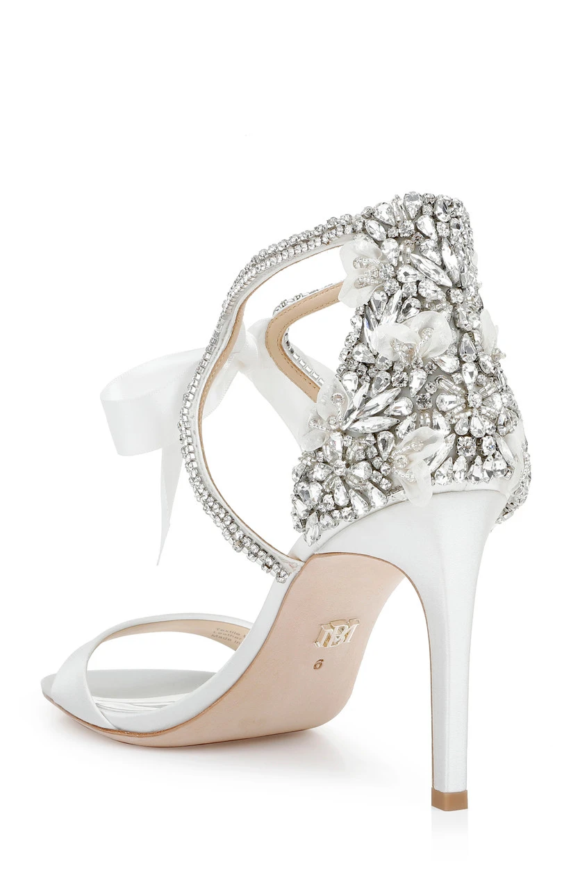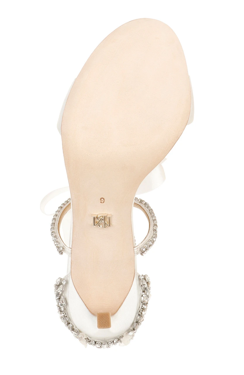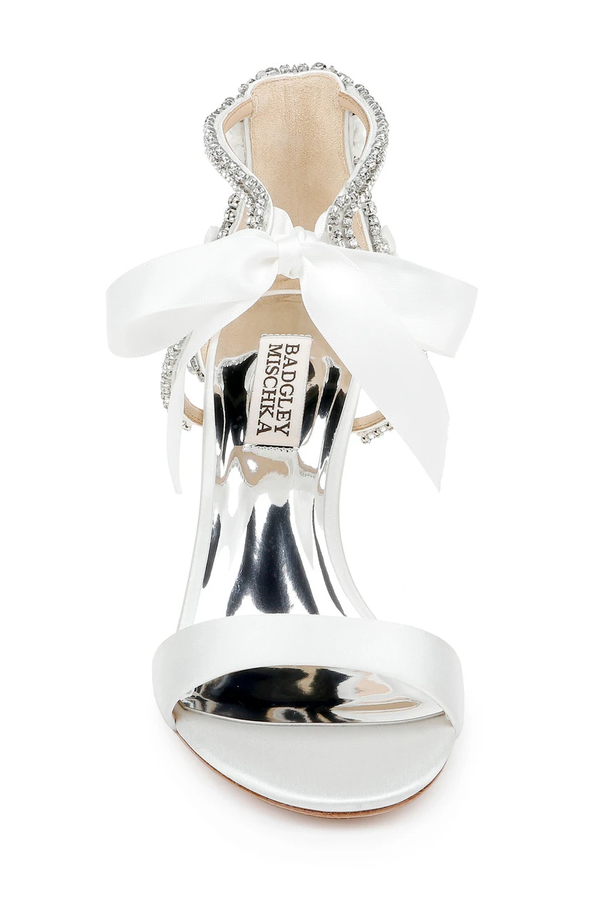 The beauty of the simple vamp is outshone only by the rhinestone-encrusted back and ankle straps. A whimsical bow balances this style; a delicate detail that stands out on its own.