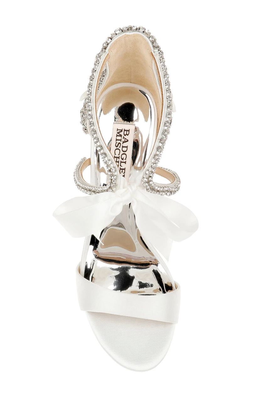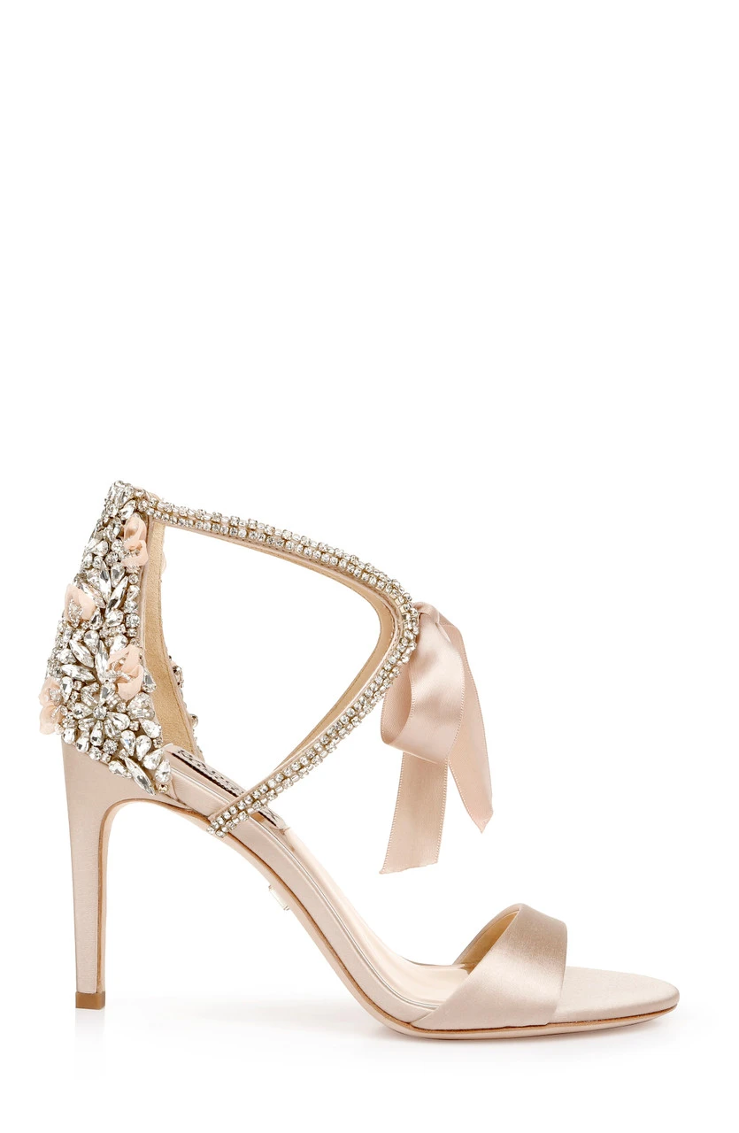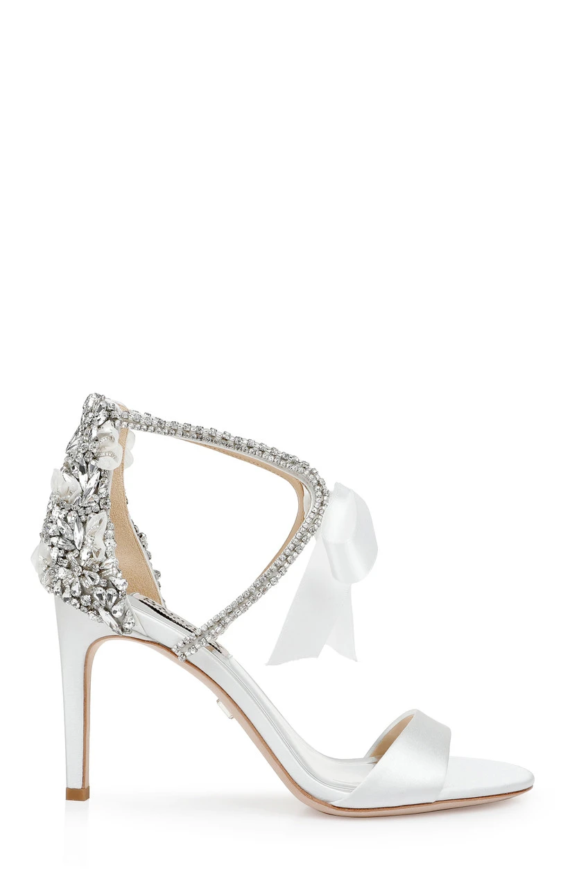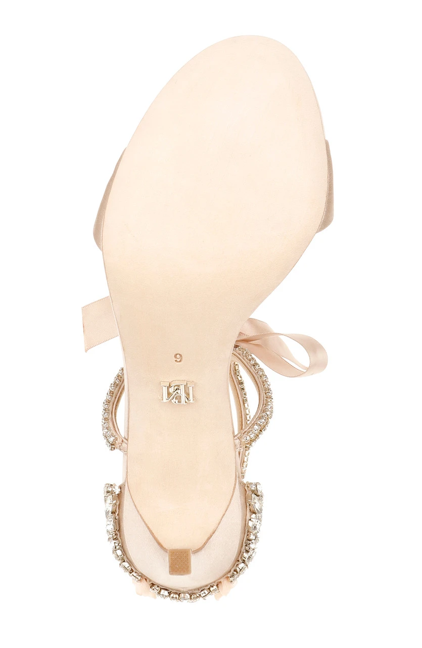 The beauty of the simple vamp is outshone only by the rhinestone-encrusted back and ankle straps. A whimsical bow balances this style; a delicate detail that stands out on its own.