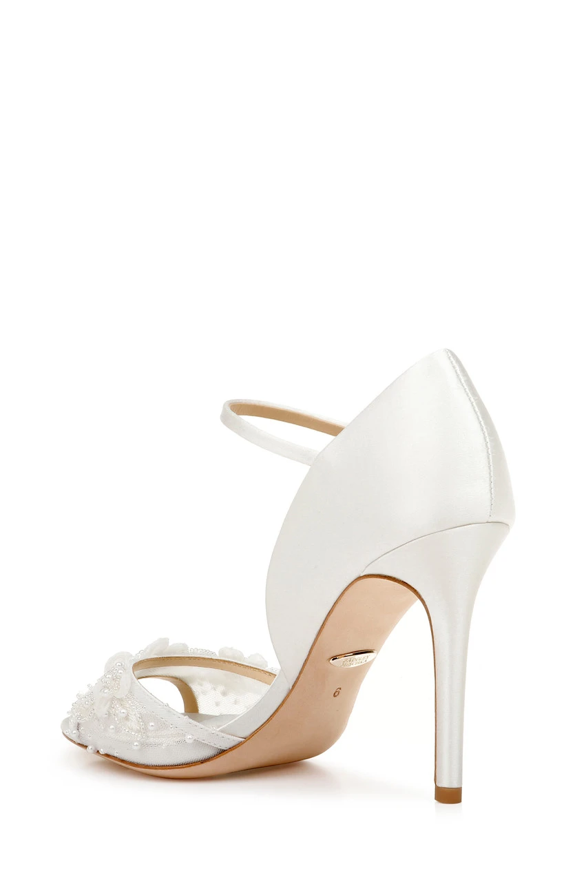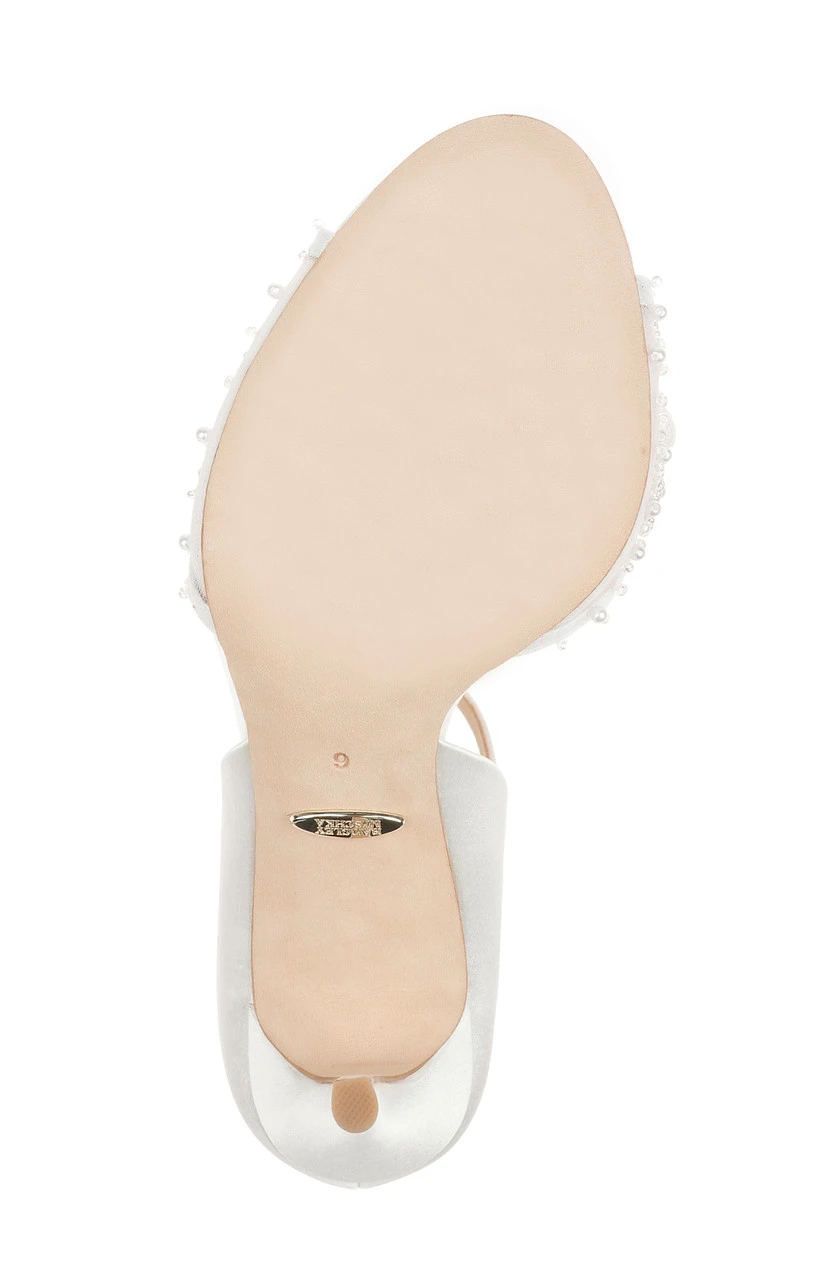 We always have a soft spot for an elegant D’Orsay. The soft yet sophisticated Carter D’Orsay peep toe with ivory glass seed beads and crystal flower details along the mesh strap is a beautiful choice for any bride to be. A classic satin ankle strap and a high counter back heel provide extra support for your big day.