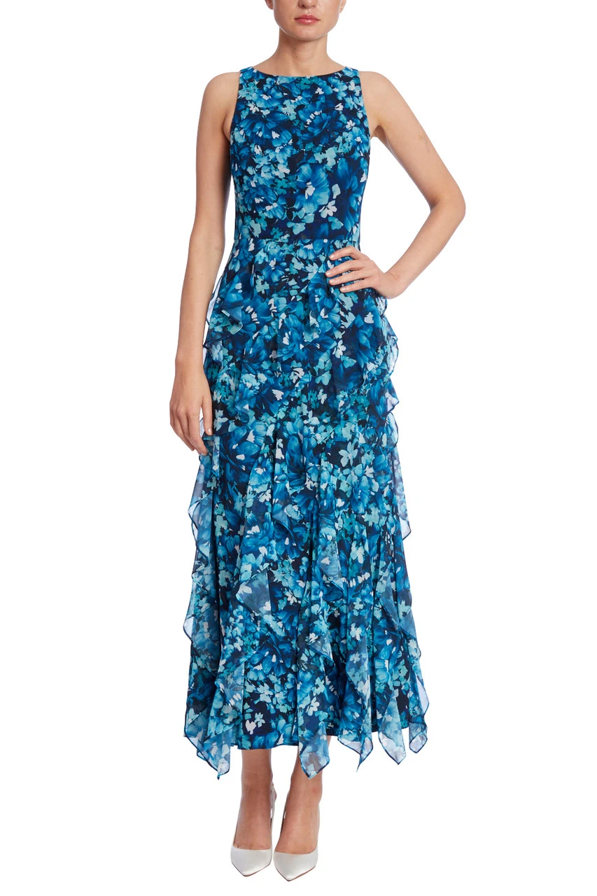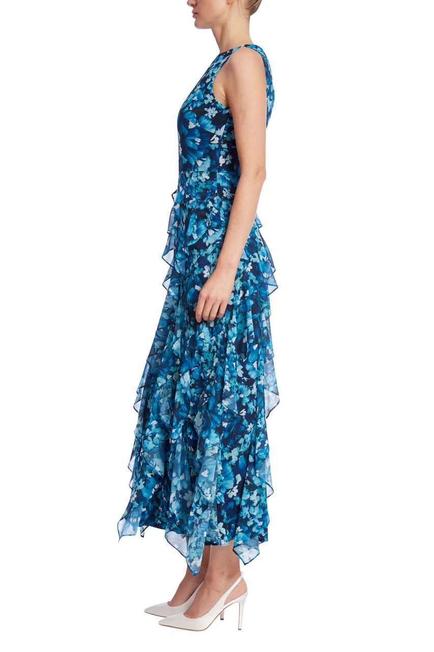 The sleeveless design offers an element of comfort, while the boat neckline and cascades rows of ruffles add feminine charm. Made from georgette fabric with an all-over floral print, this dress is not only incredibly comfortable and fashionable, but also versatile enough to be worn for formal occasions or more casual get-togethers.