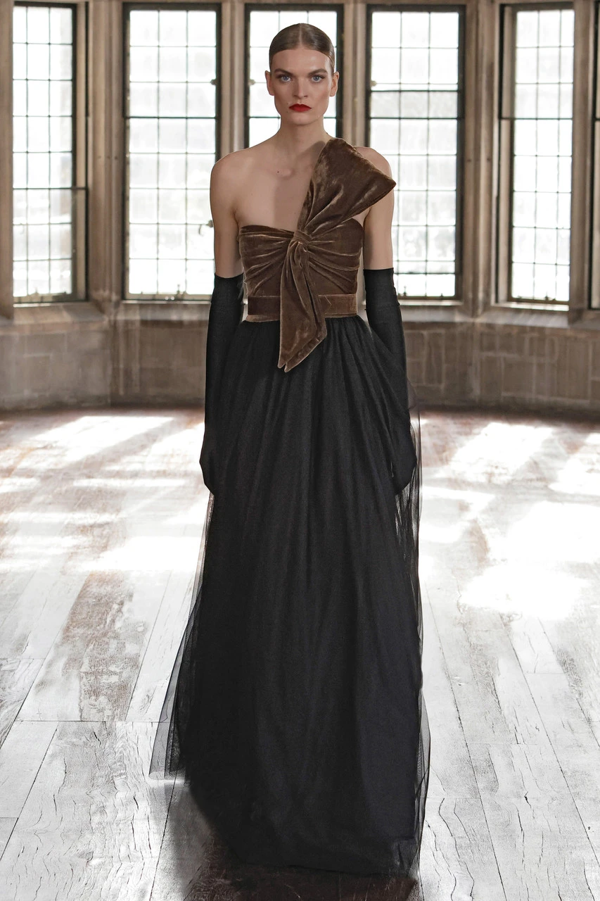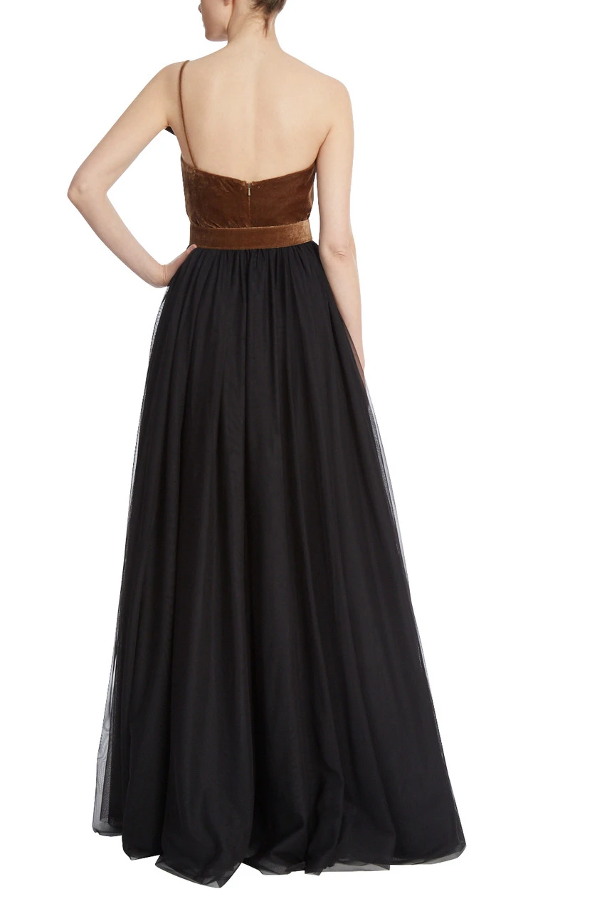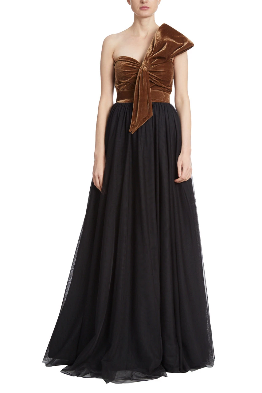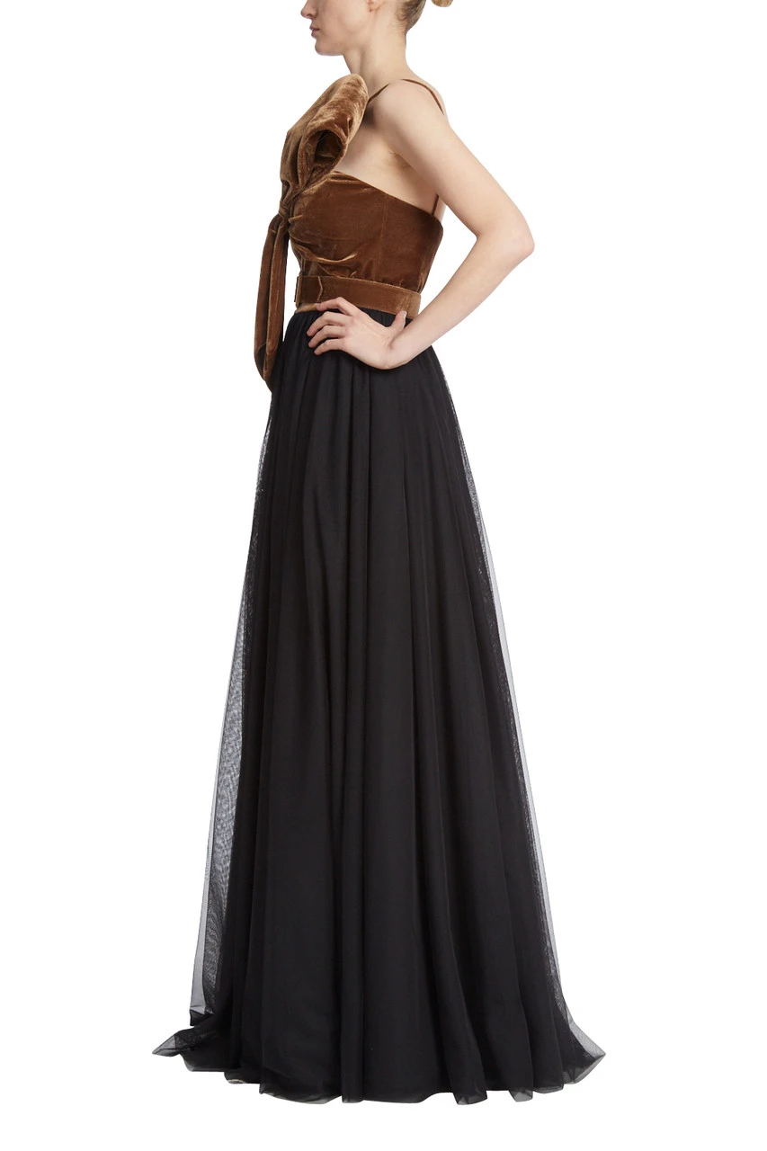 This stunning gown is supported by a thin strap connected to the oversized asymmetrical bow; a reminder that your vulnerability can be your biggest strength and bring forth unexpected beauty. The velvet bodice perfectly balances out the full tulle skirt, creating a classic silhouette.