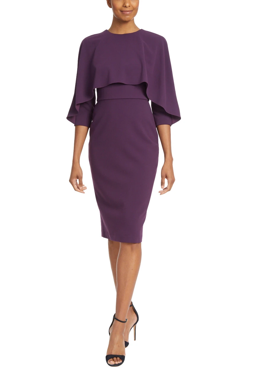 This layered design creates an hourglass silhouette with a capelet across the shoulders, a fitted waist, and a pencil skirt.