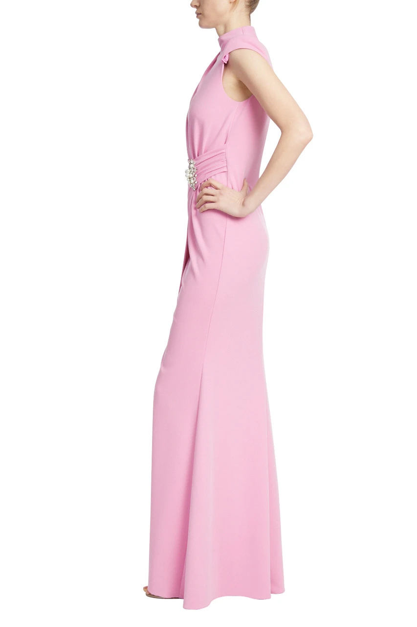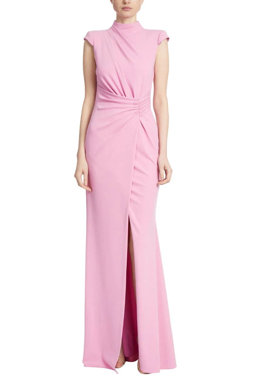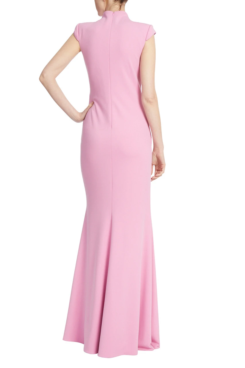 This look features a mock neck and delicate cap sleeves, subtle details that add to an elegant ensemble. A flirtatious slit reveals long legs and your favorite Badgley Mischka stilettos as you walk.