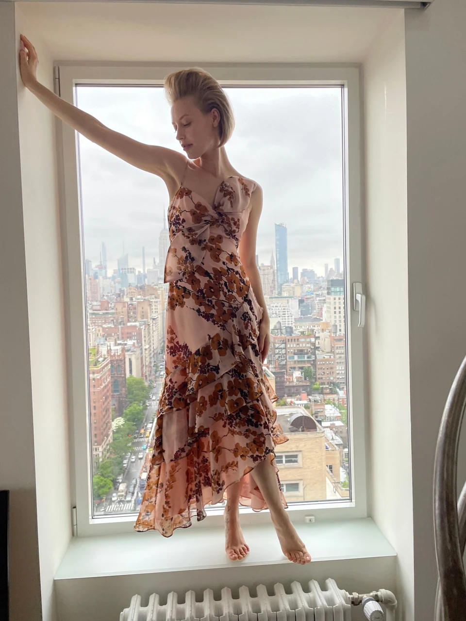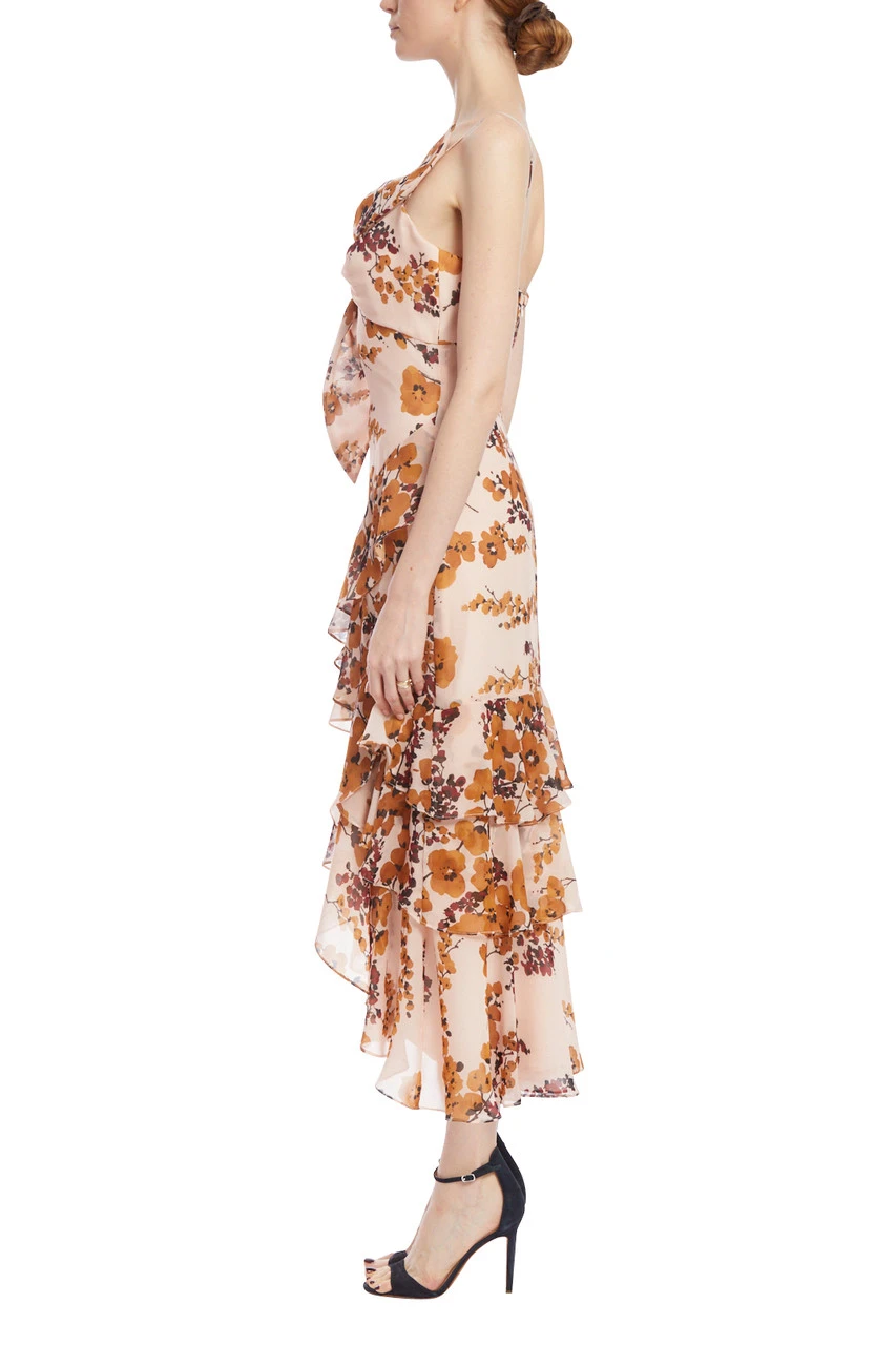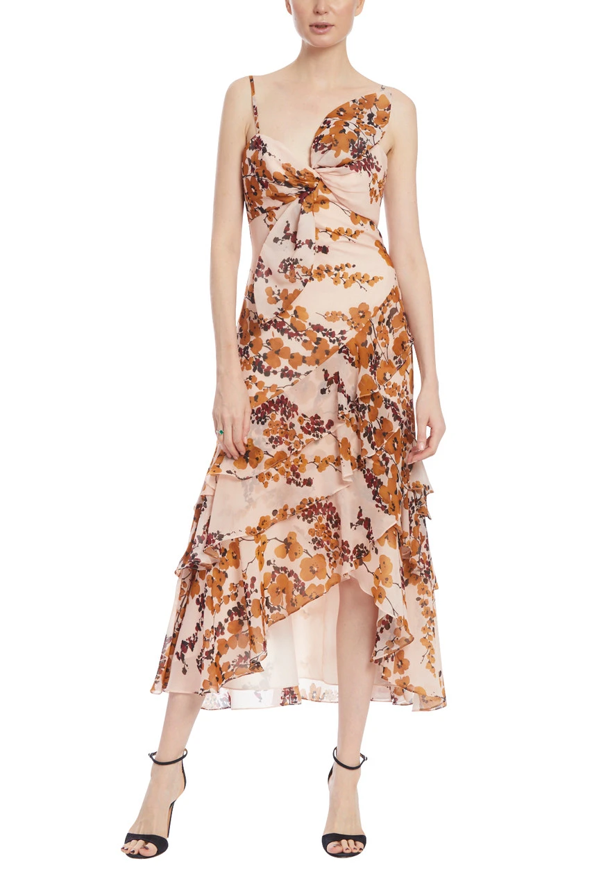 Sienna orange flowers adorn this beautifully cut dress, with spaghetti straps, a tiered skirt, and an asymmetrical bodice, twisted to create the shape of a bow. Feminine and sophisticated, this look will be a favorite this season.