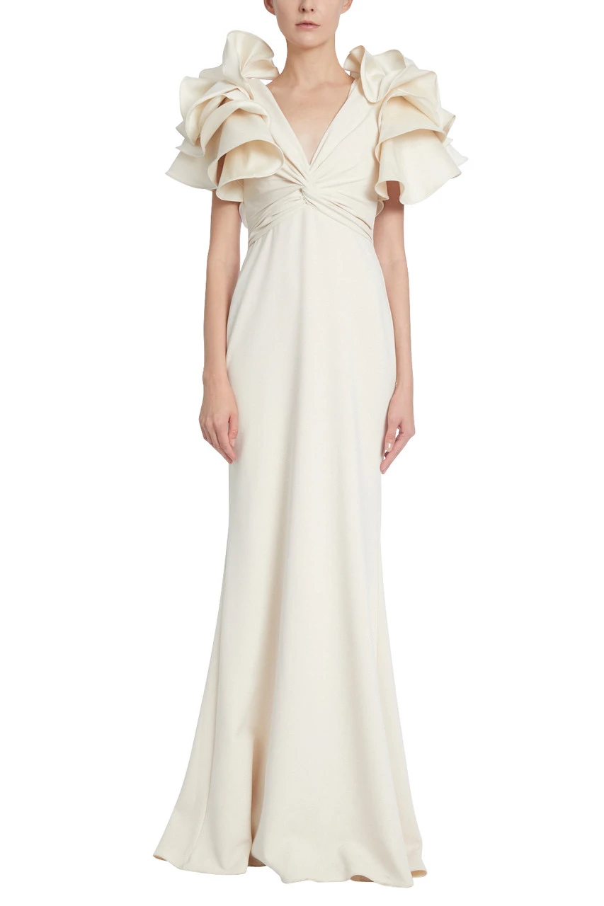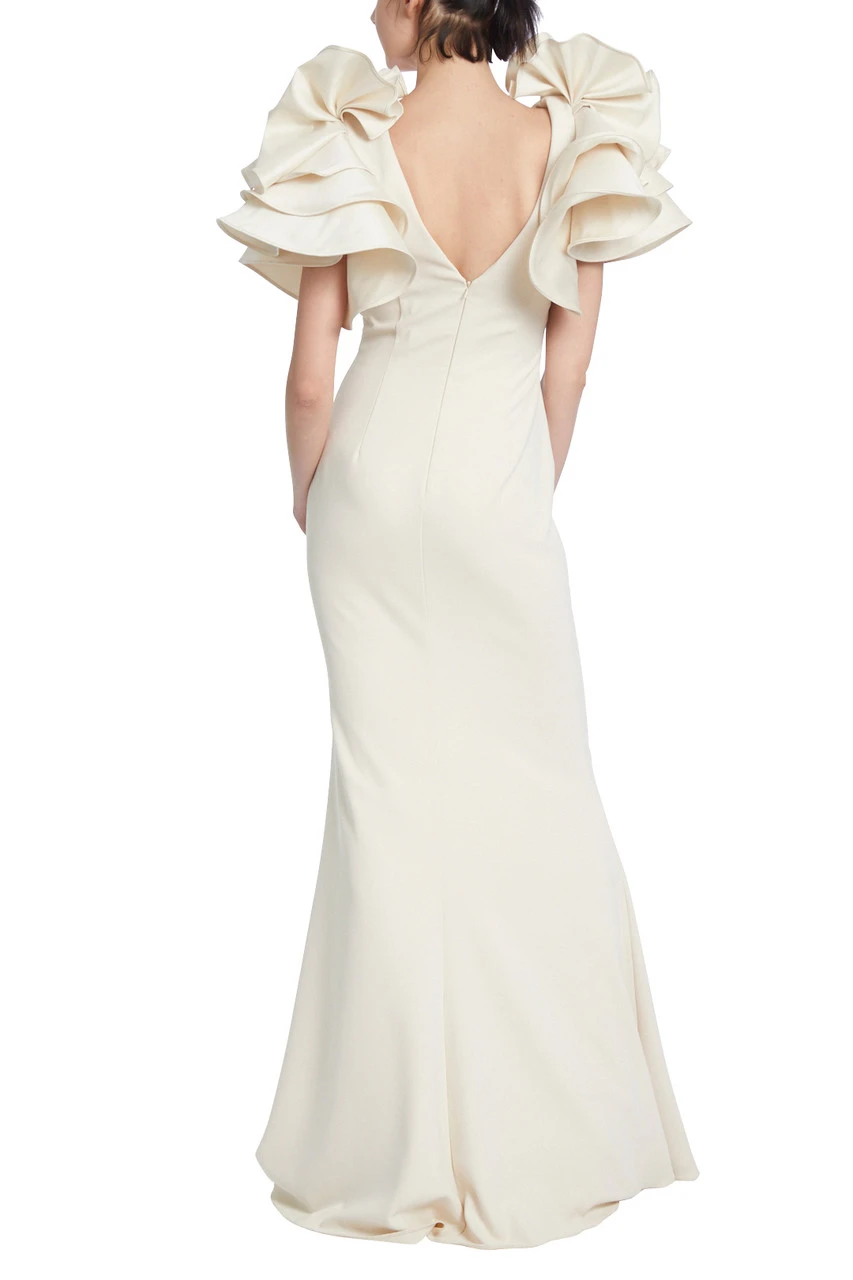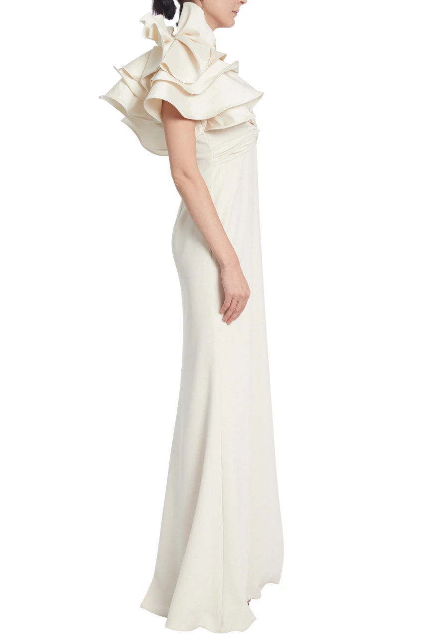 EG3842 | Ecru Column Gown with Ruffled Shoulders