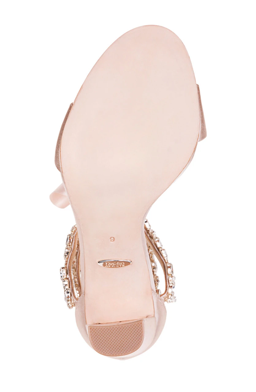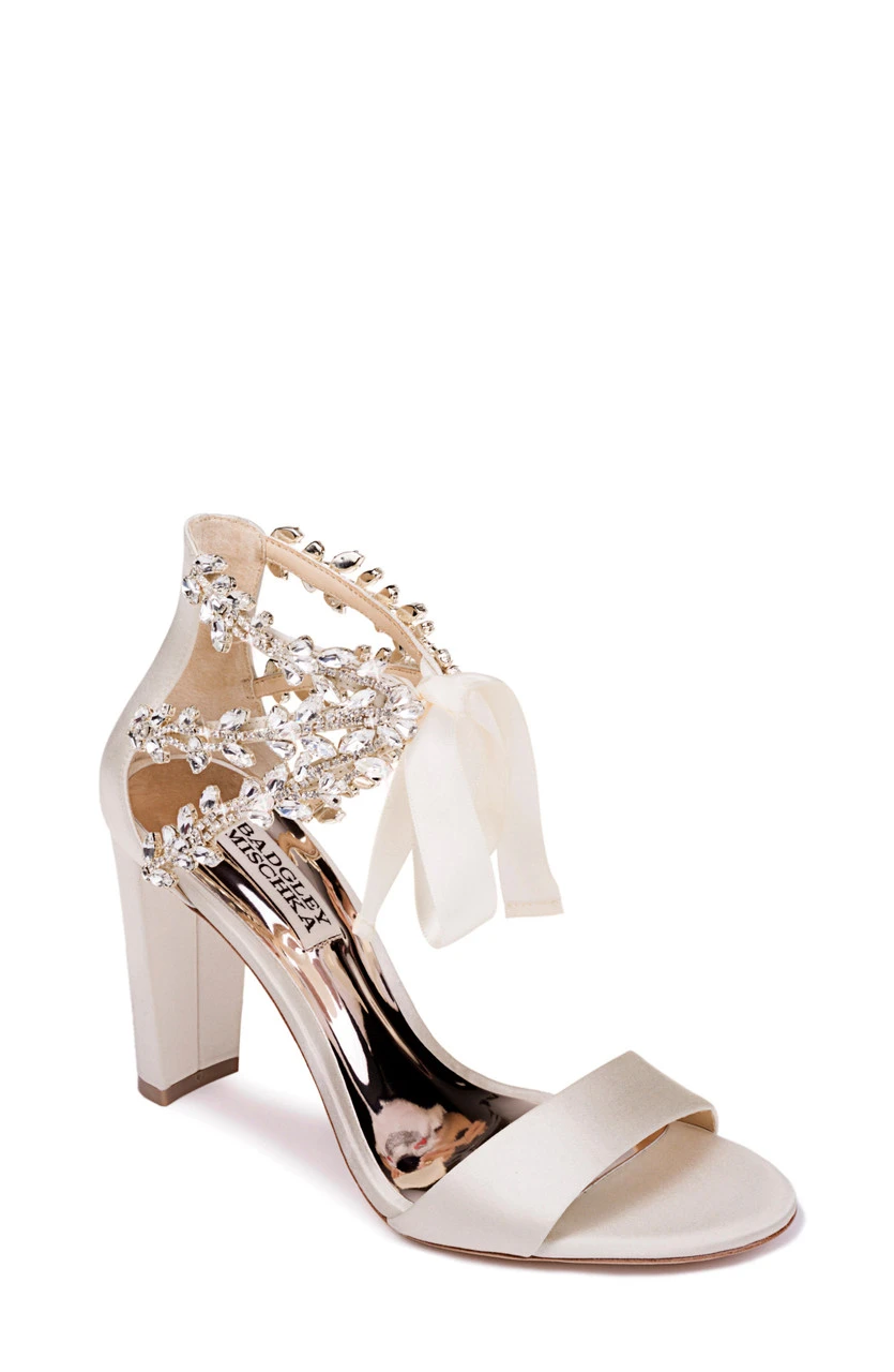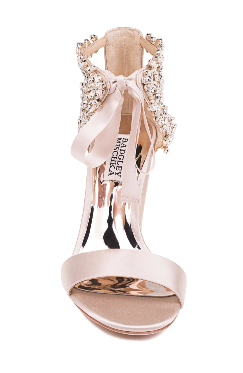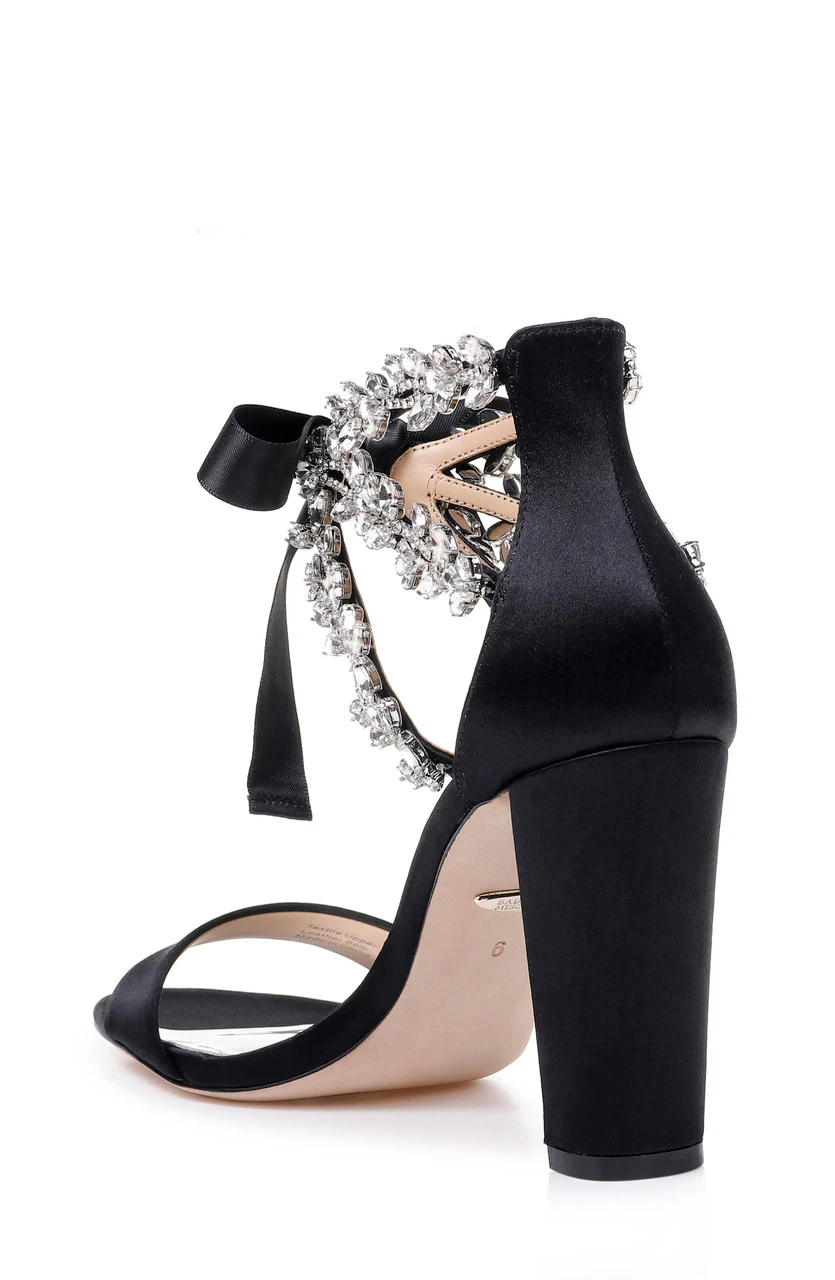 This stacked heel features a simple, open-toe, satin strap in the front, while the high-back ankle is adorned with three ornate, floral-inspired, crystal embellishments on each side. The straps come together to meet at a tie-front ribbon which gives this shoe a beautiful and dramatic uplift. The extra sparkle and beautiful bow make the Everafter look like it was designed in a modern day fairytale.