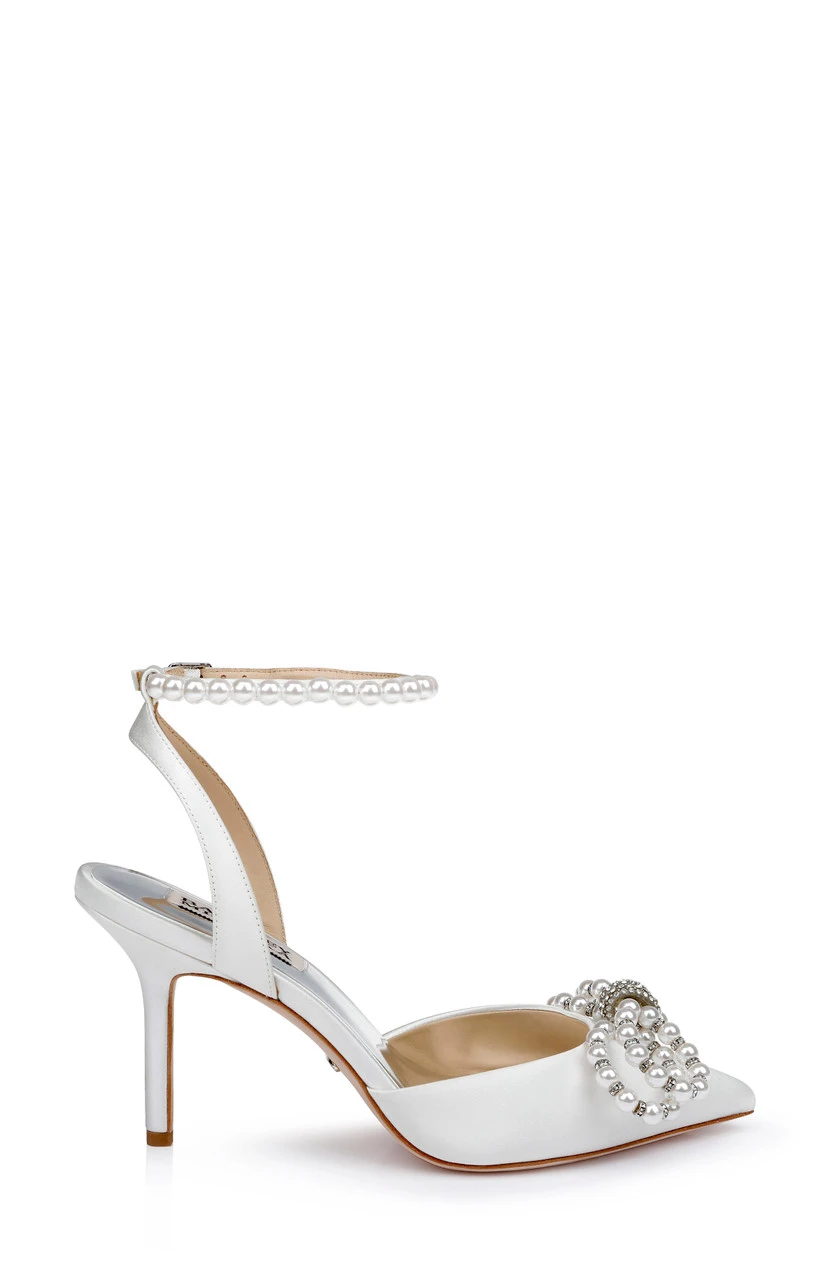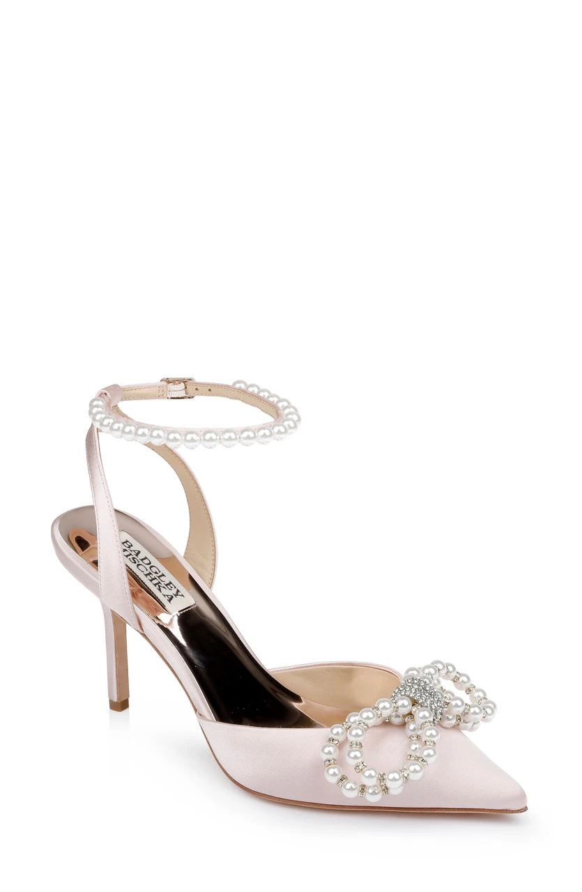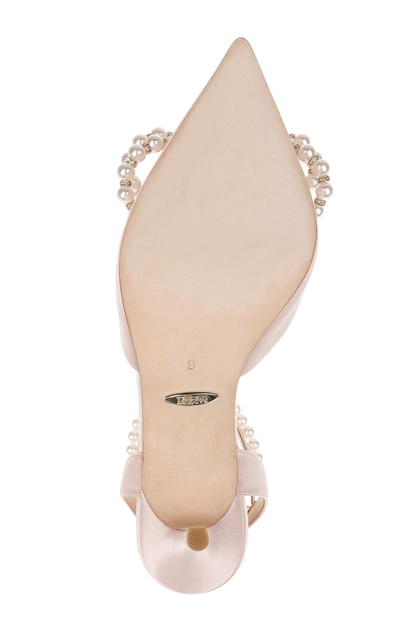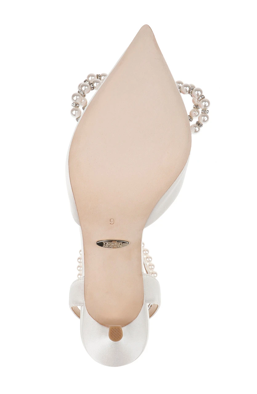 The pointed toe and silk satin upper pair with a stiletto heel for striking appeal, while the pearl-embellished ankle strap and exquisite pearl ornament on the toes add even more allure. The result is an elegant evening shoe that will make your look truly unforgettable.