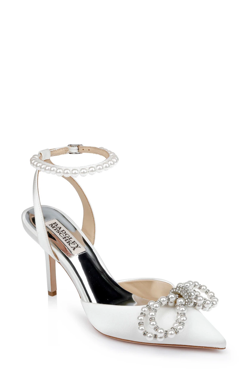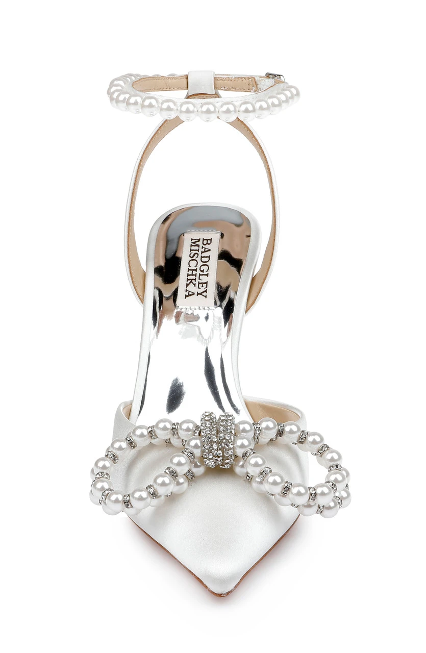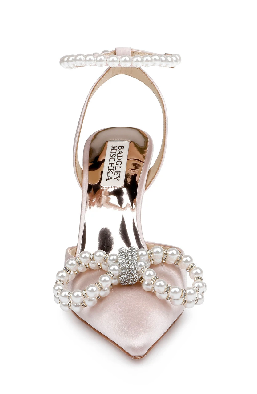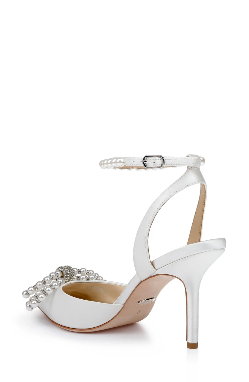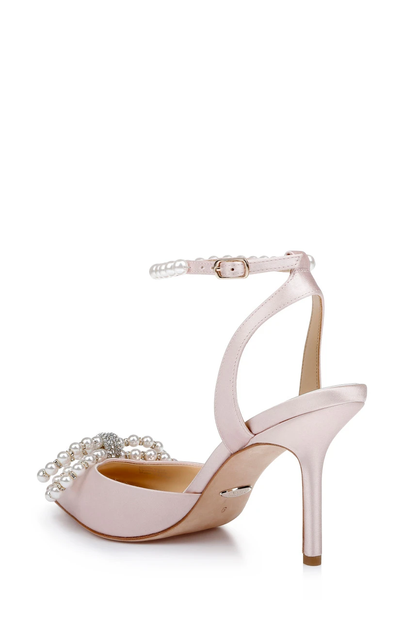 The pointed toe and silk satin upper pair with a stiletto heel for striking appeal, while the pearl-embellished ankle strap and exquisite pearl ornament on the toes add even more allure. The result is an elegant evening shoe that will make your look truly unforgettable.