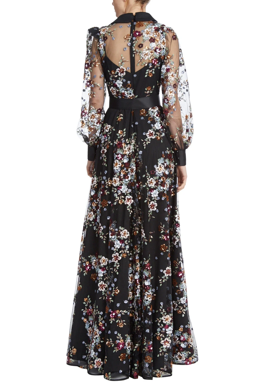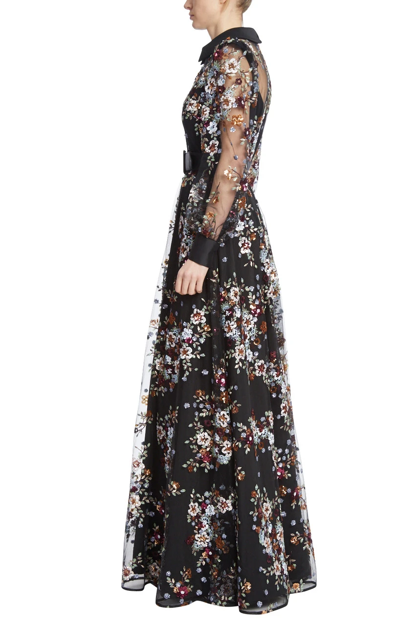 This timeless tulle gown features elegant floral embroidery against a simple black background. Long, sheer sleeves balance out the pointed collar and give the impression of a shirt dress. The discrete belt adds structure and accentuates your waist.