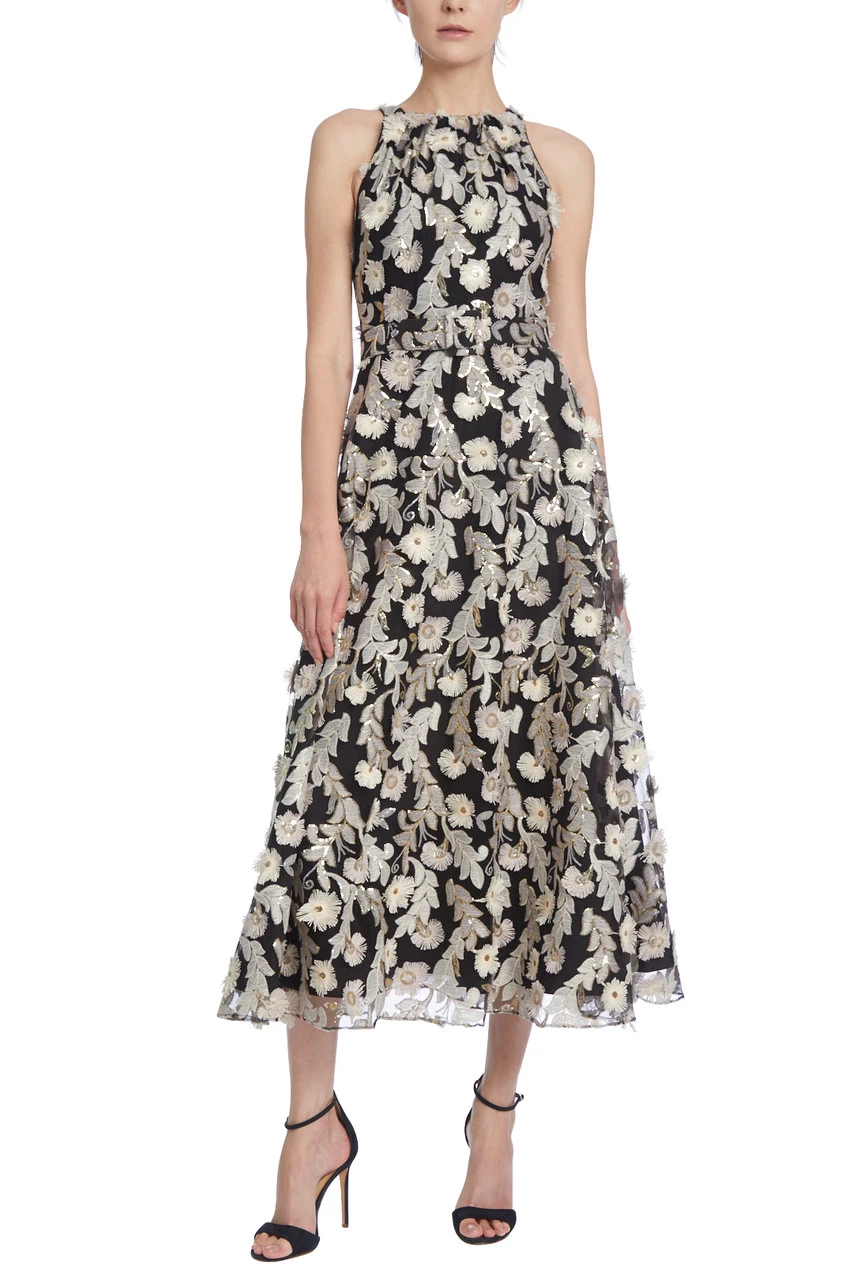 This midi-length dress, with its floral accents and gracefully draping fabric, exudes both elegance and femininity. The halter neck and belt at the waist enhance your curves while the skirt flares out below it in a delicate flair.
