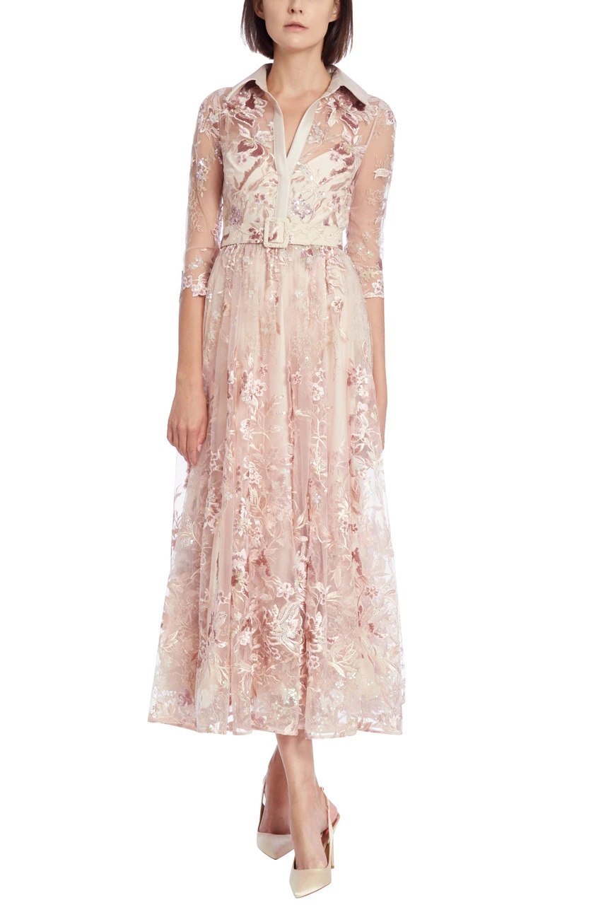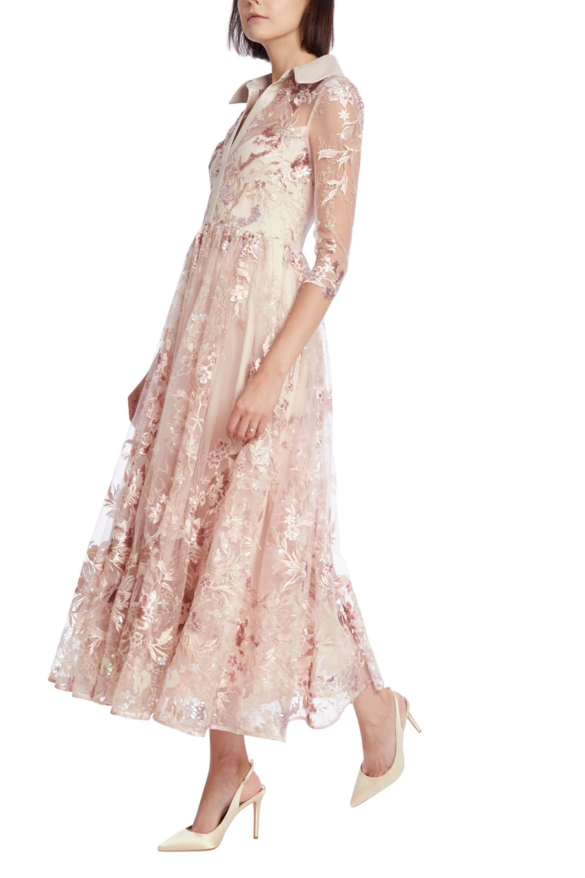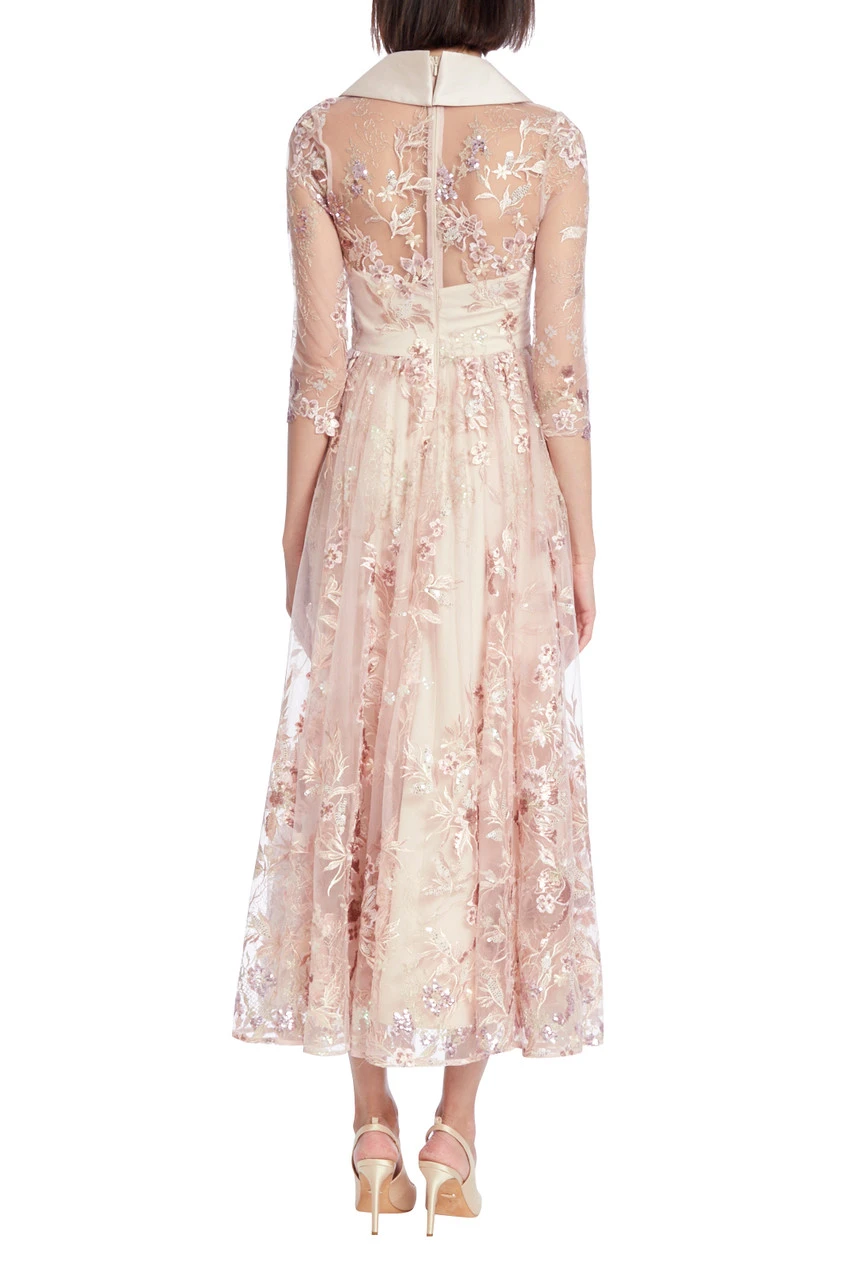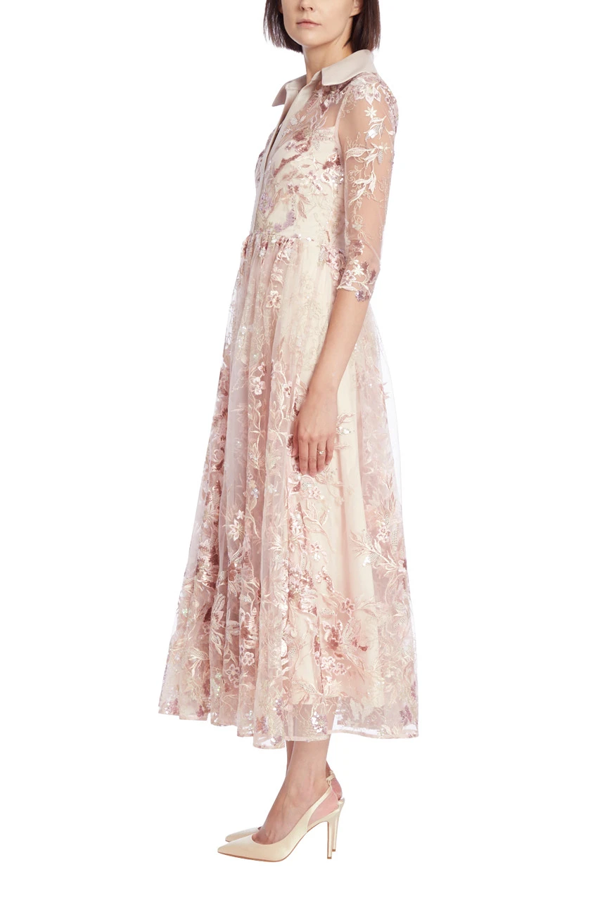 From its elegant tulle fabric to the feminine flowers embroidered along it, this dress is truly a masterpiece. The full skirt below will make you feel like you’re walking on air—while the belted waistline, notched collar, and 3/4 sleeves finish off the look with an added touch of classiness.