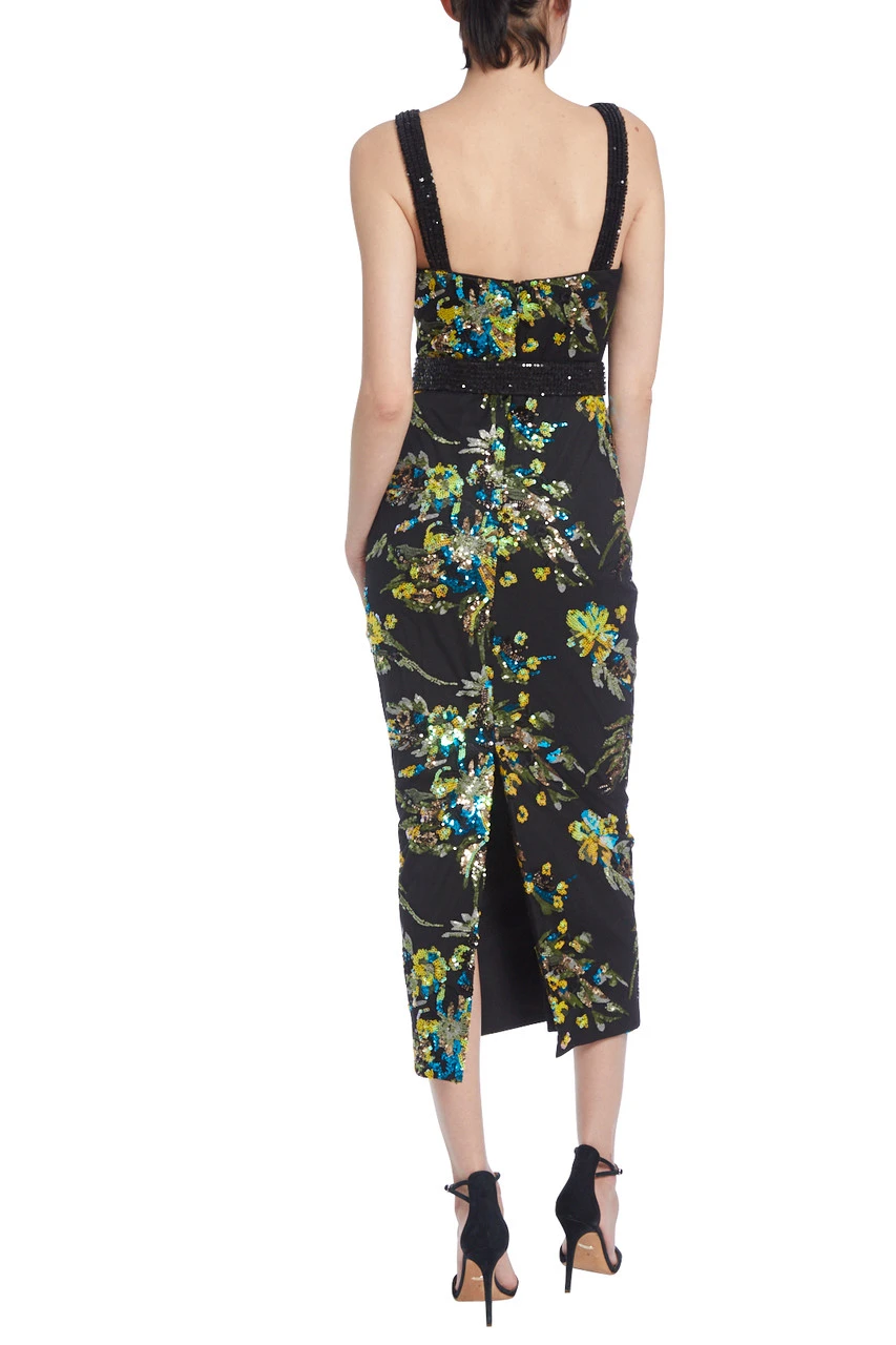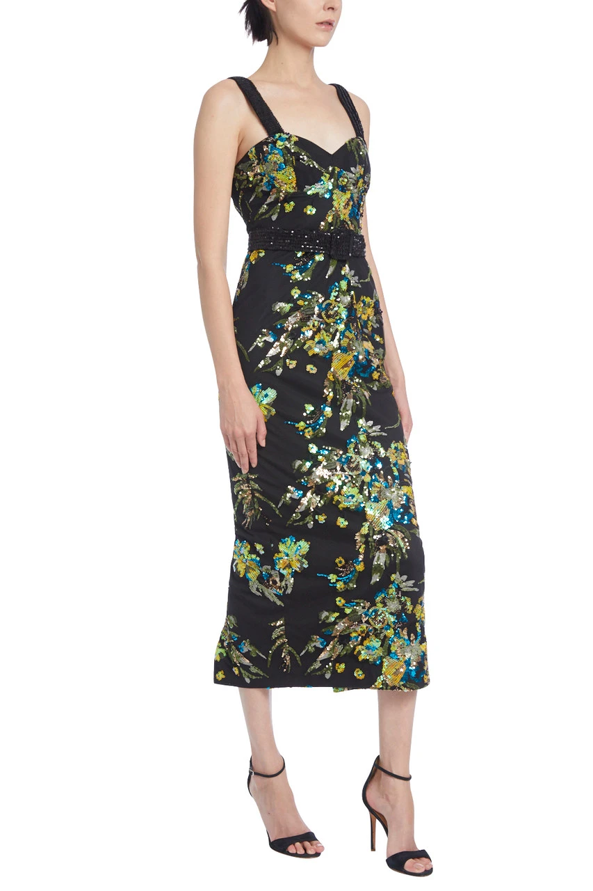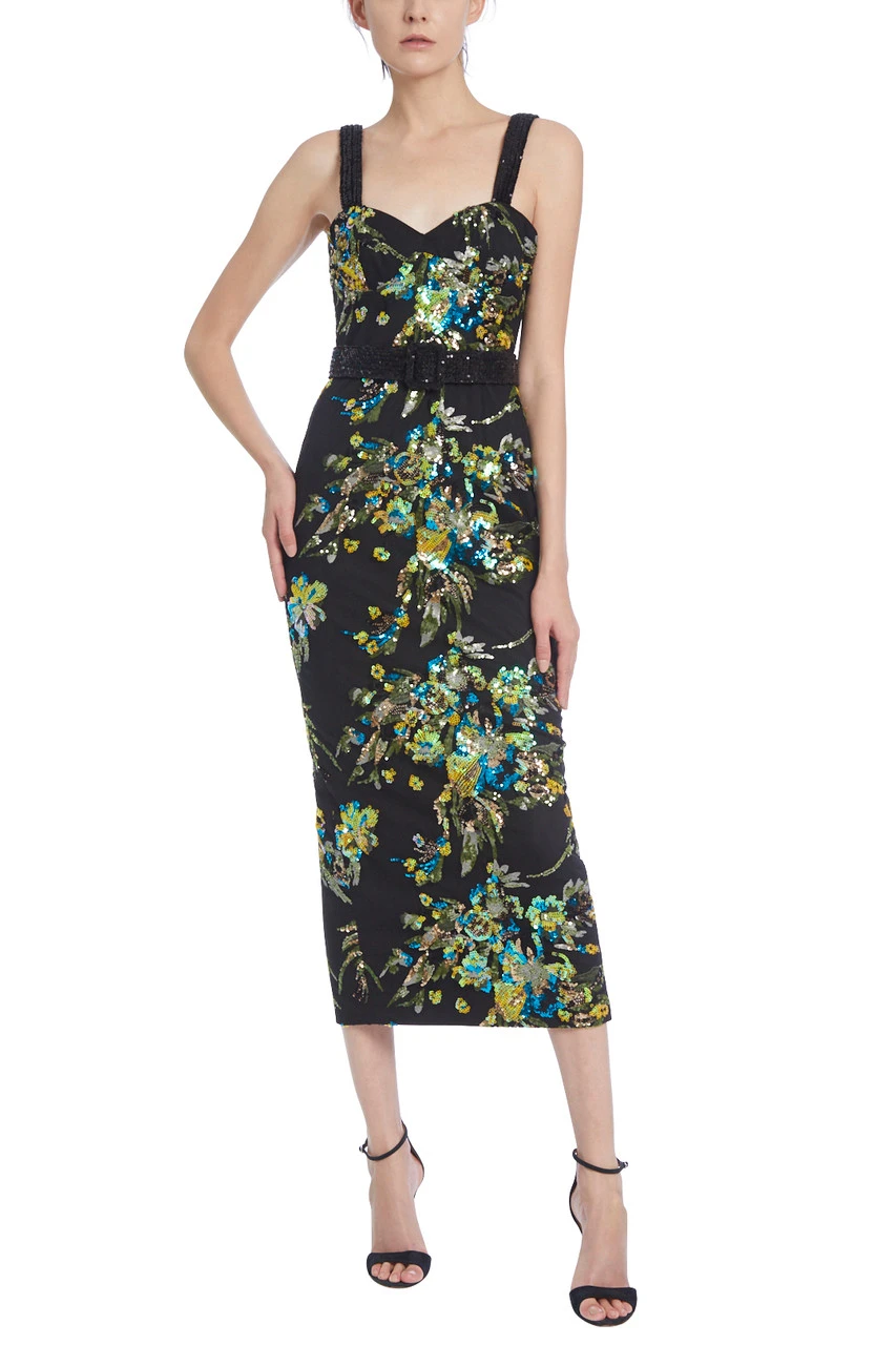 Luxurious and inimitable, this midi sheath dress is adorned with floral-embroidered tulle that’s covered in sequins. The sweetheart neckline and thick straps allow for easy movement, while the shimmering belt at the waist creates an elegant silhouette and allows you to accentuate your figure.