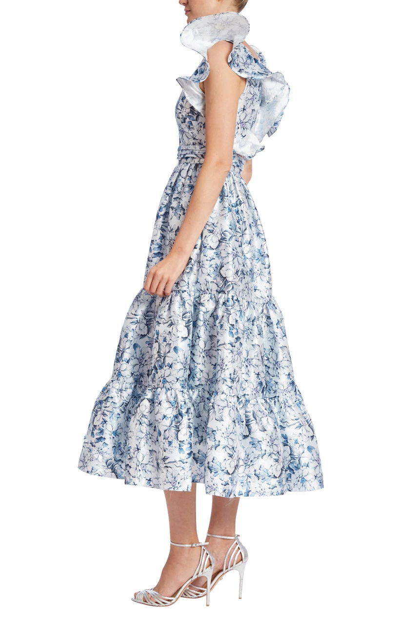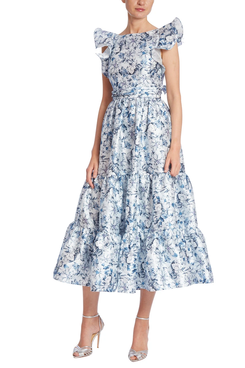 Product Features This gorgeous gown is a dream come true. The floral pattern and ruffles along the shoulder straps are nothing short of spectacular—and the tiered skirt below gives it a full, romantic feel at the same time that its open back lends drama. Together, these elements create a sophisticated look that will have you feeling like the belle of the ball. Also see our solid version.