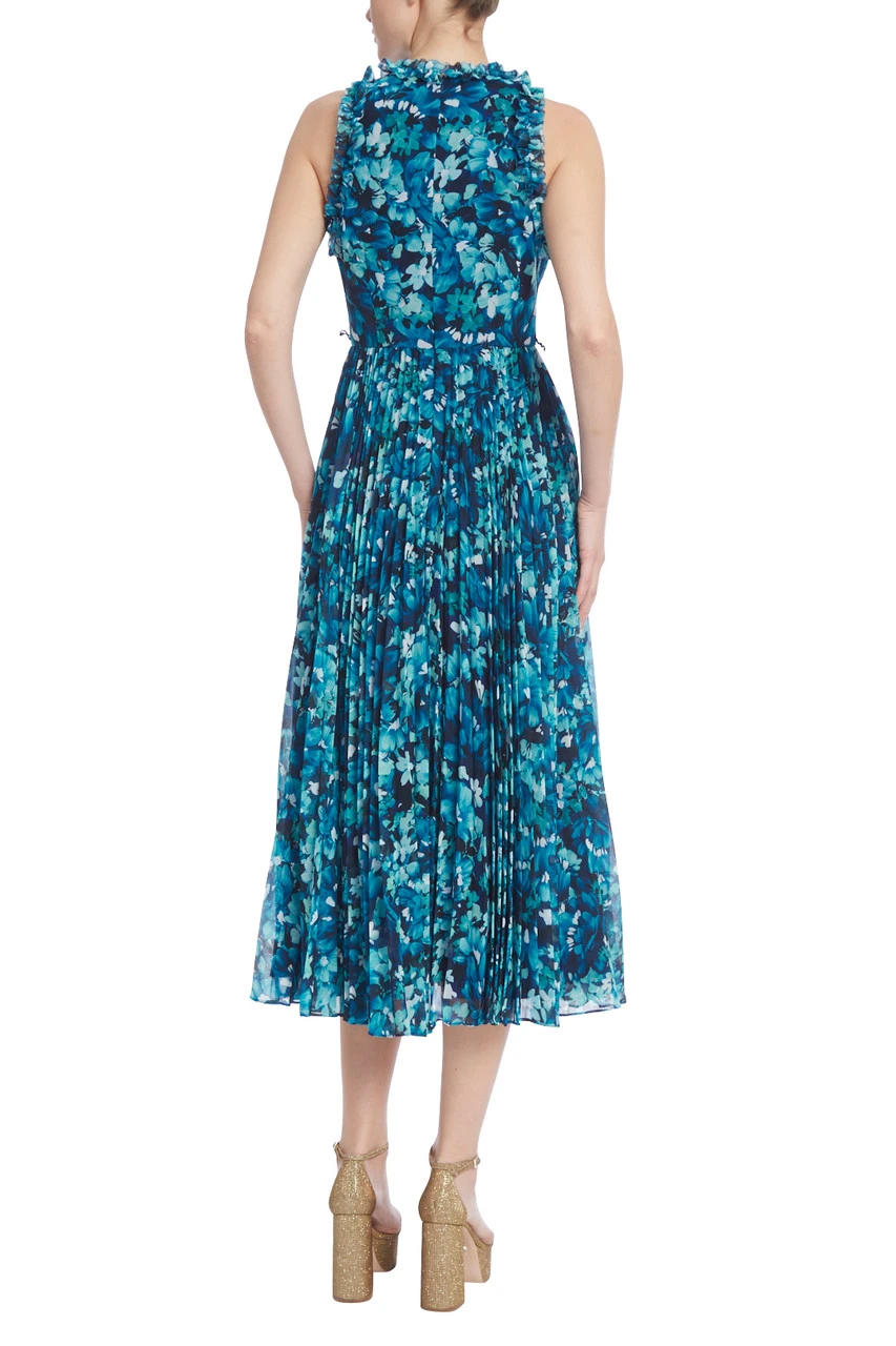 The high-neck style and ruffle detail along the neckline give this dress a romantic touch that’s perfect for showing off your shoulders and neck, while the long, flowy skirt is pleated for added flair. The all-over floral design printed on soft Georgette contributes to this dress’s versatility, making it perfect for an array of occasions from formal events to casual get-togethers. Based on a Badgley Mischka BEST SELLER!