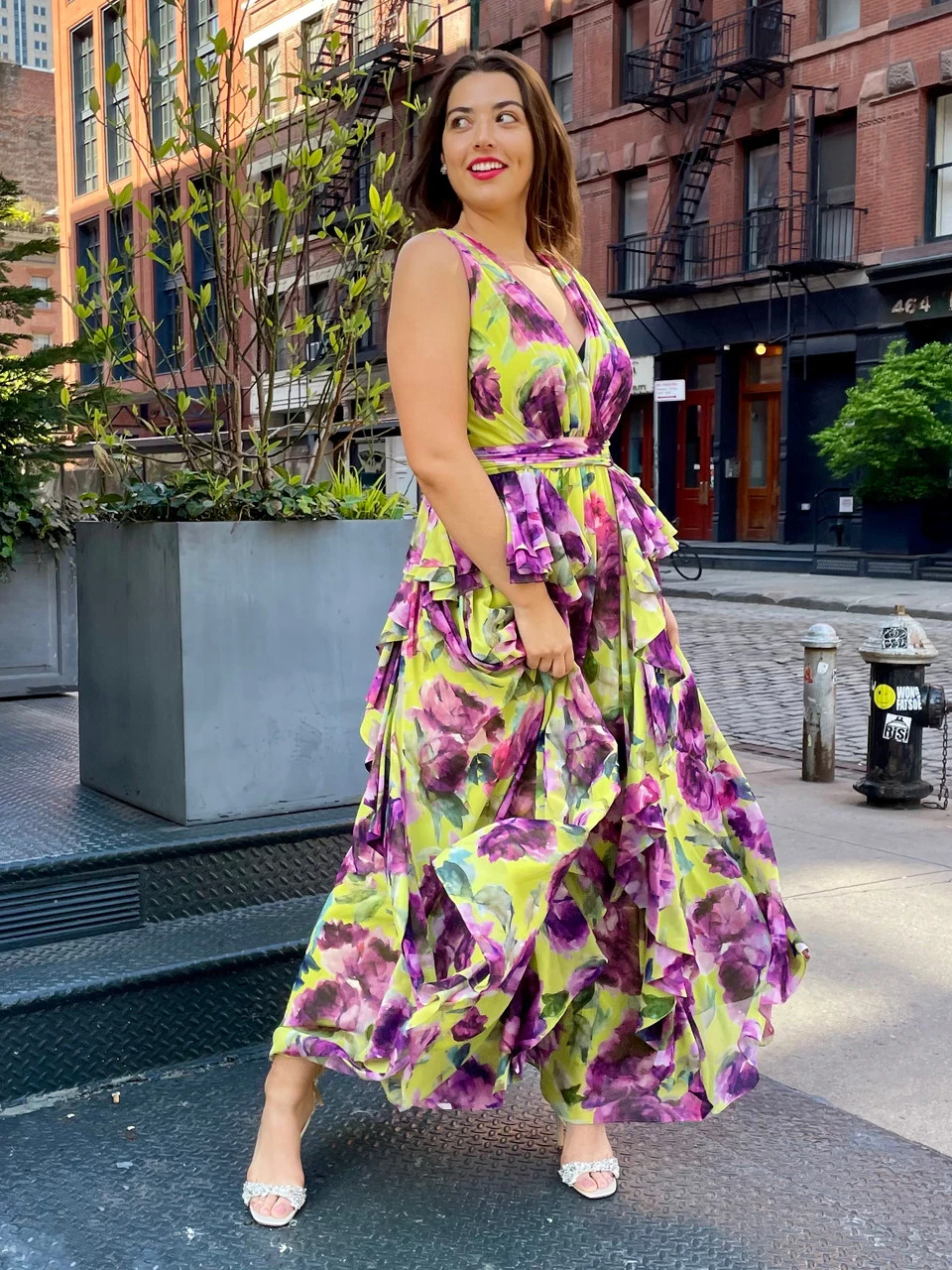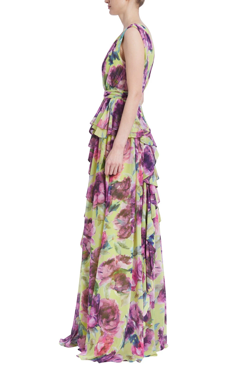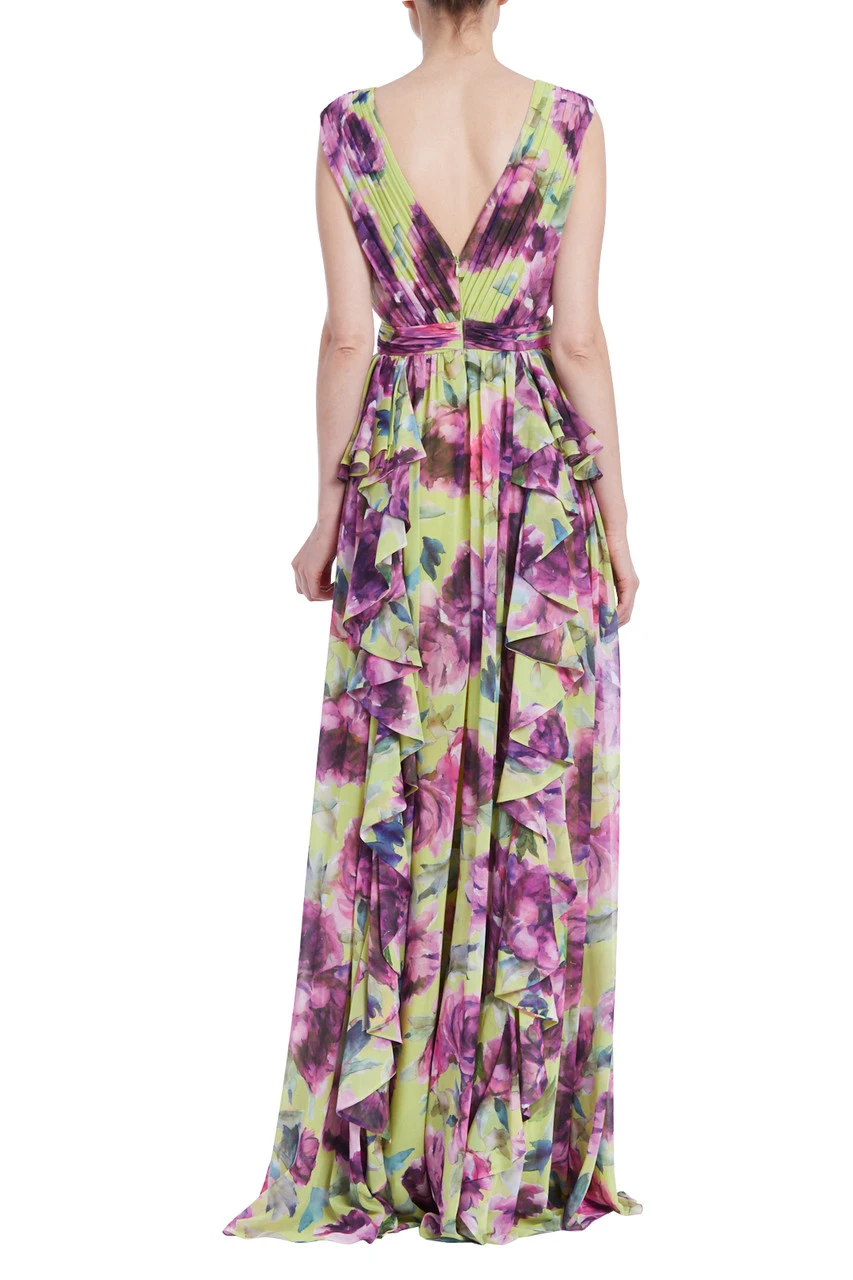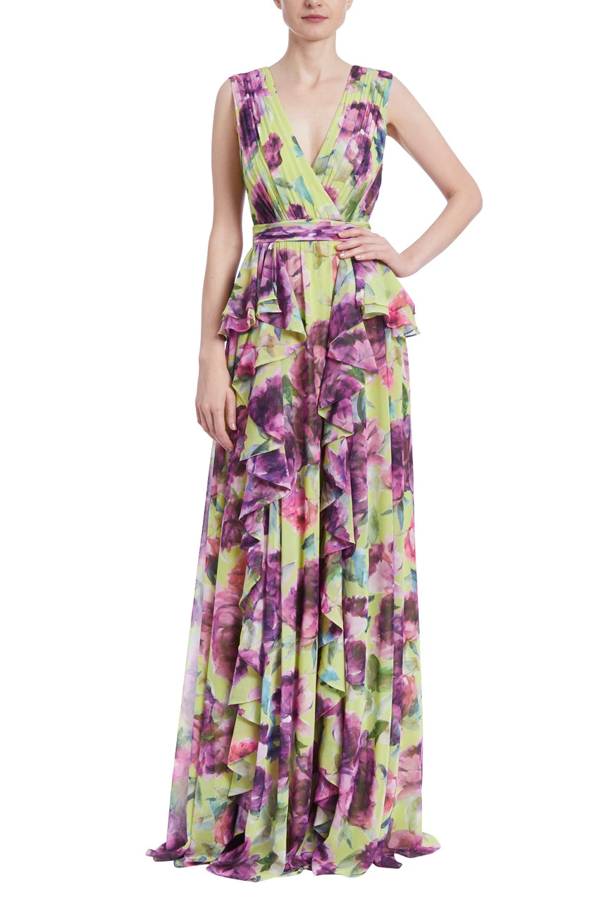 Cascading ruffles mimic the petals of favorite summer blooms, perfectly complementing the stunning floral print. The deep V-neck, wider straps, pleats, and waist tie add an air of relaxed, natural beauty to this look. Wear this style to blossom with effortless allure.
