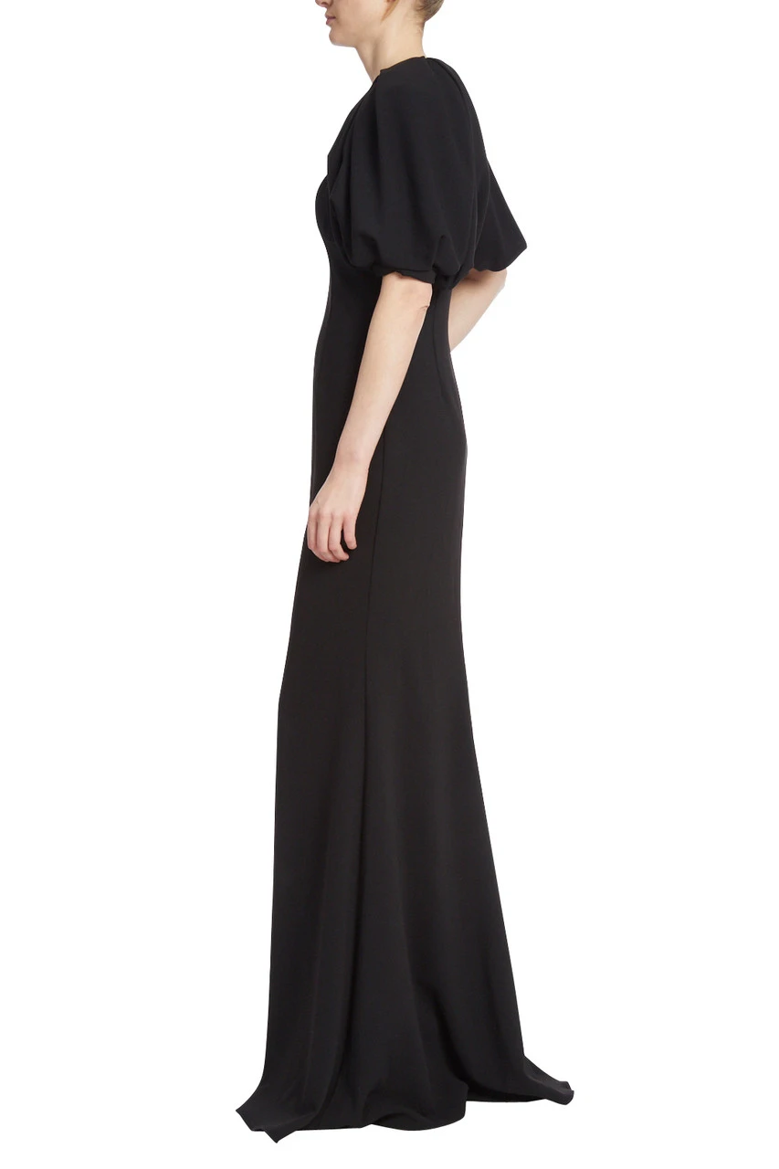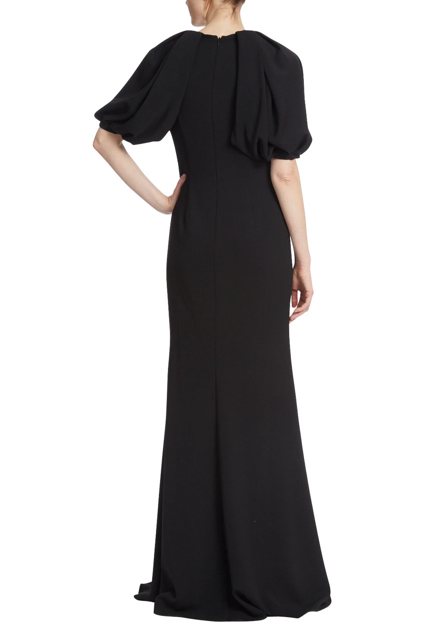 Expertly crafted from stretchy crepe knit fabric, this column gown is a timeless classic, with an elegant drape that moves beautifully as you walk. The floor-length silhouette offers elegant simplicity for a refined ball gown, while the drama sleeves and v neckline add just enough detail to keep it chic and modern.