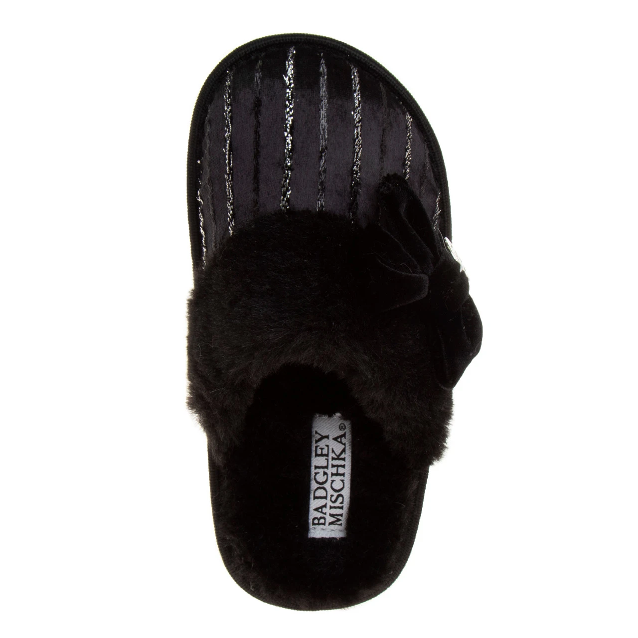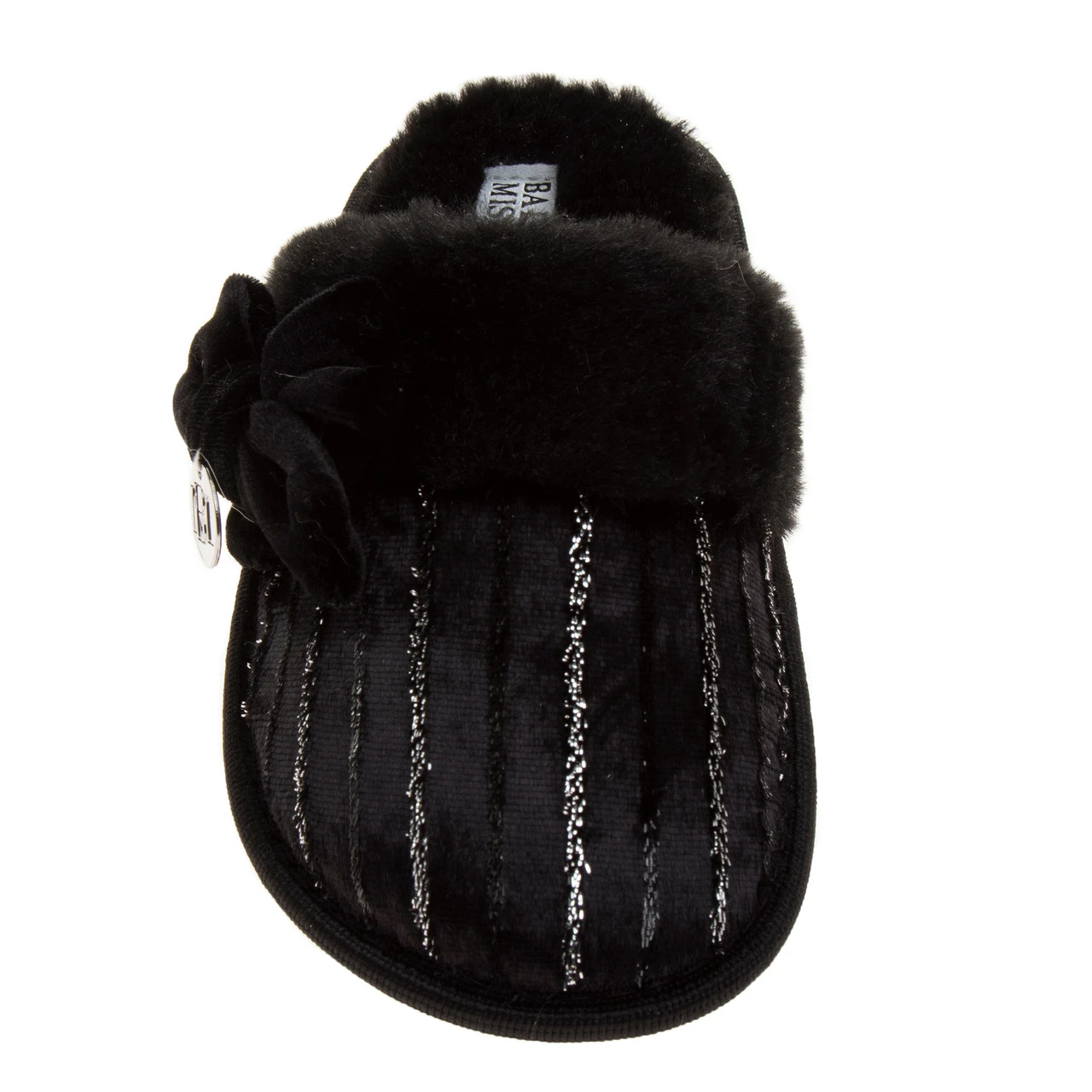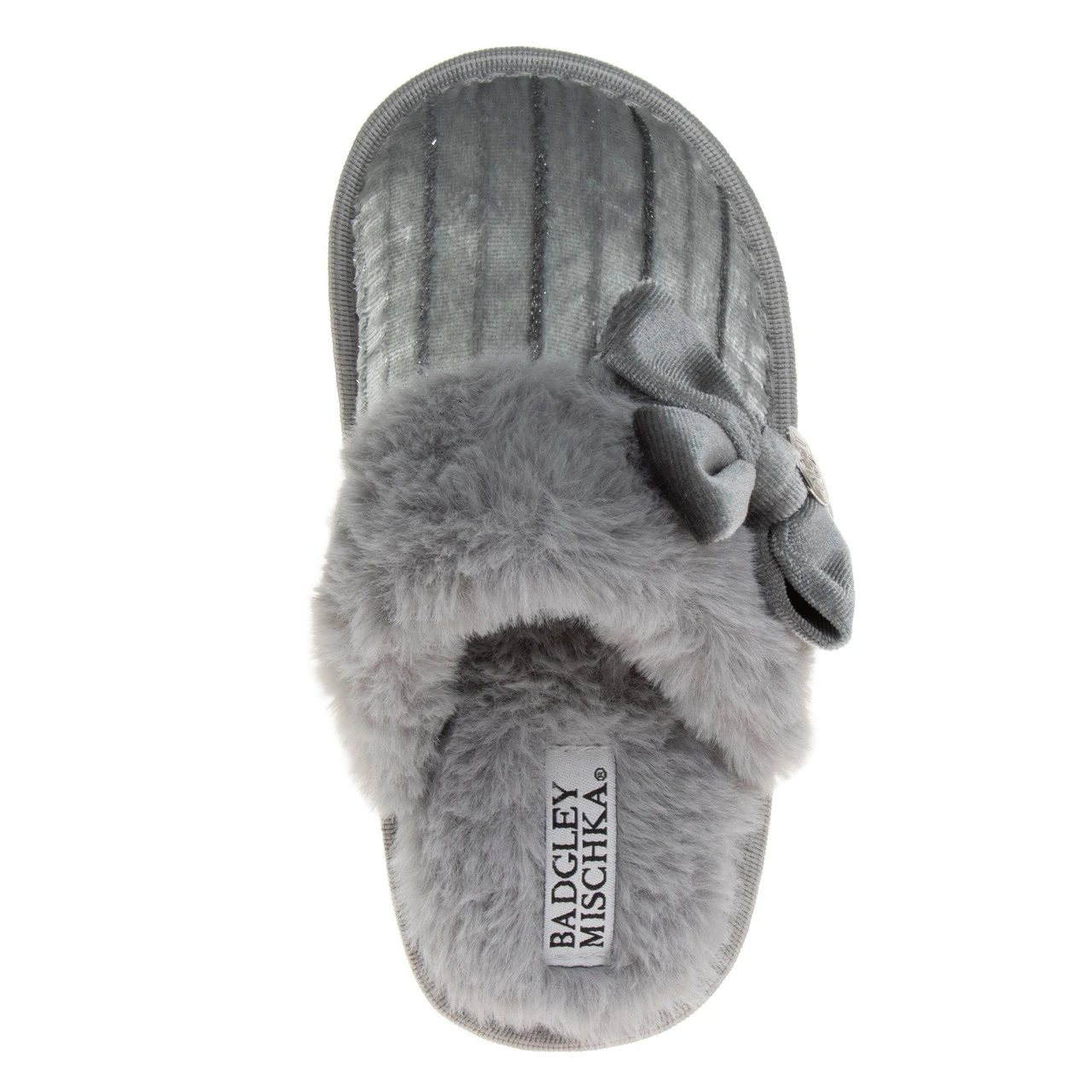 These slip-on scuff slippers feature a velvet upper with lines of glitter that shine in the light. The interior is made of faux fur for added warmth and coziness, while the padded footbed and textured sole ensure your little one will be comfortable walking around in these all day long.