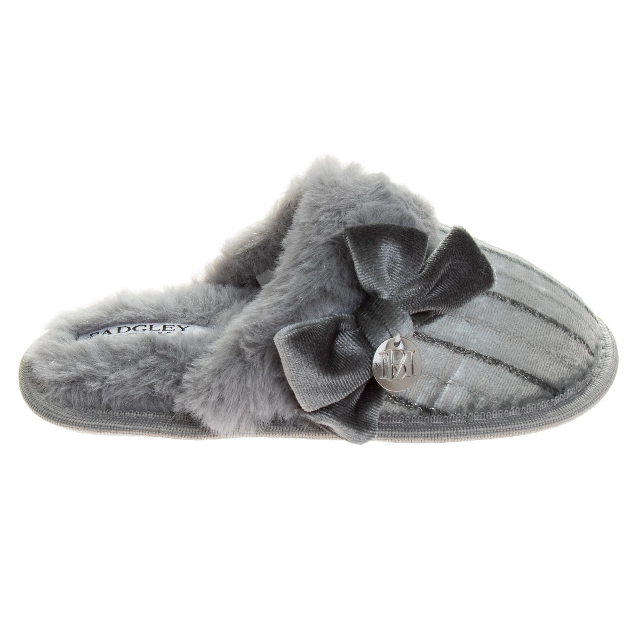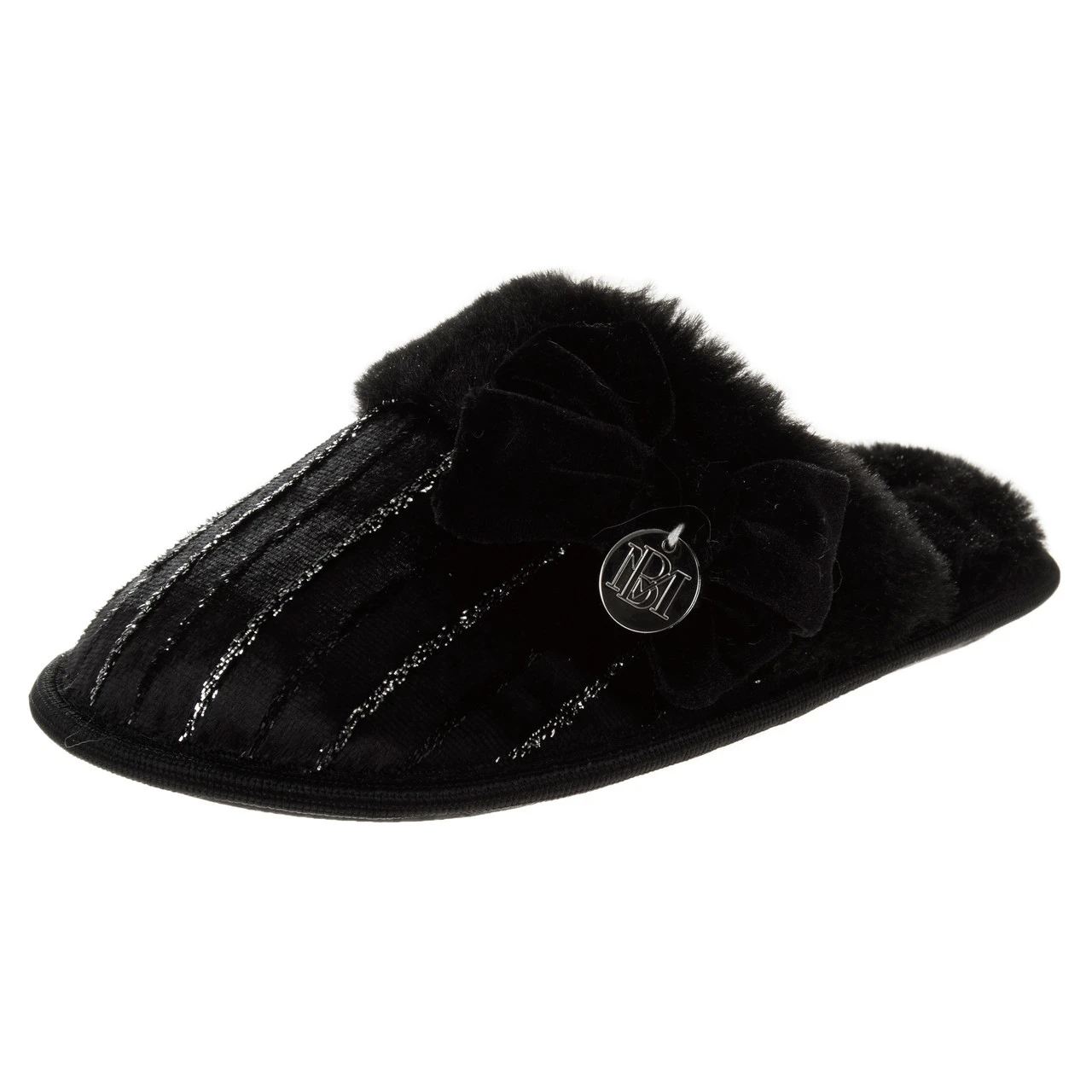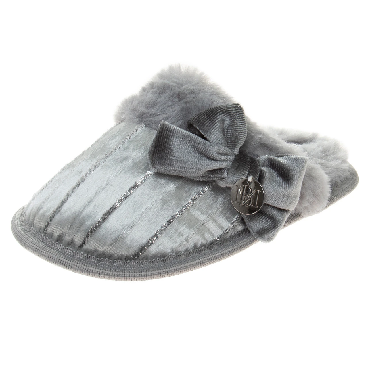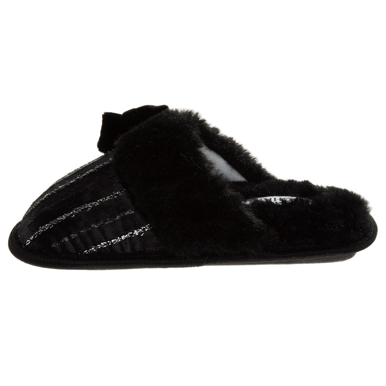 These slip-on scuff slippers feature a velvet upper with lines of glitter that shine in the light. The interior is made of faux fur for added warmth and coziness, while the padded footbed and textured sole ensure your little one will be comfortable walking around in these all day long.