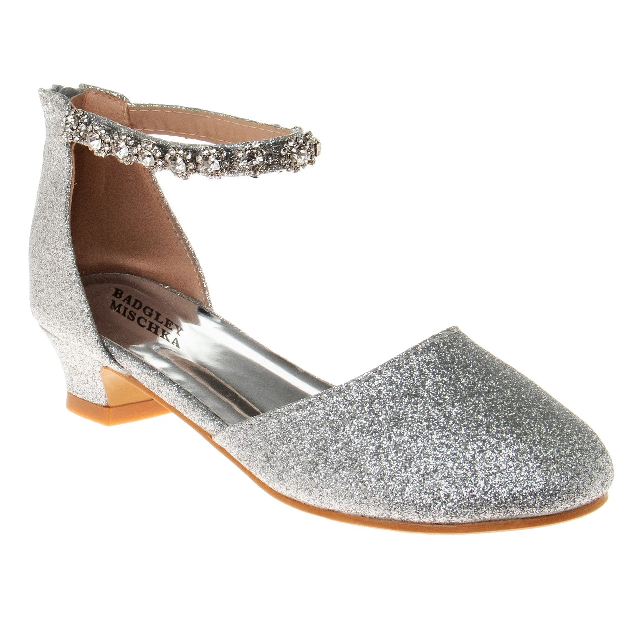 O-BM92459N | Girls’ Glittery Kitten Heeled Dress Shoes with Rhinestone Ankle Strap