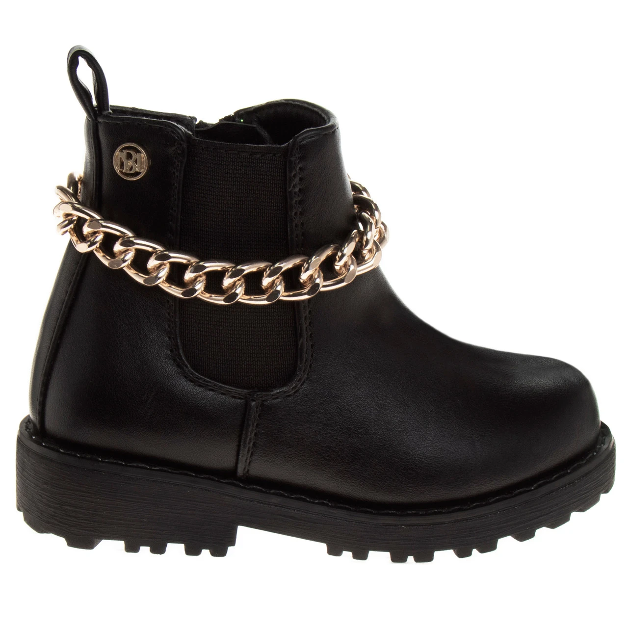Add these classic-style booties to your little girl’s outfit for a look that will make her stand out from the crowd! Made from buttery faux-leather and featuring a gold-tone chain for added interest, these booties are suitable for dress, casual or everyday wear. They’re easy to slip on with a side zip, making them perfect for busy little ones on the go.