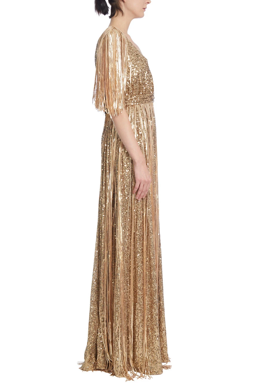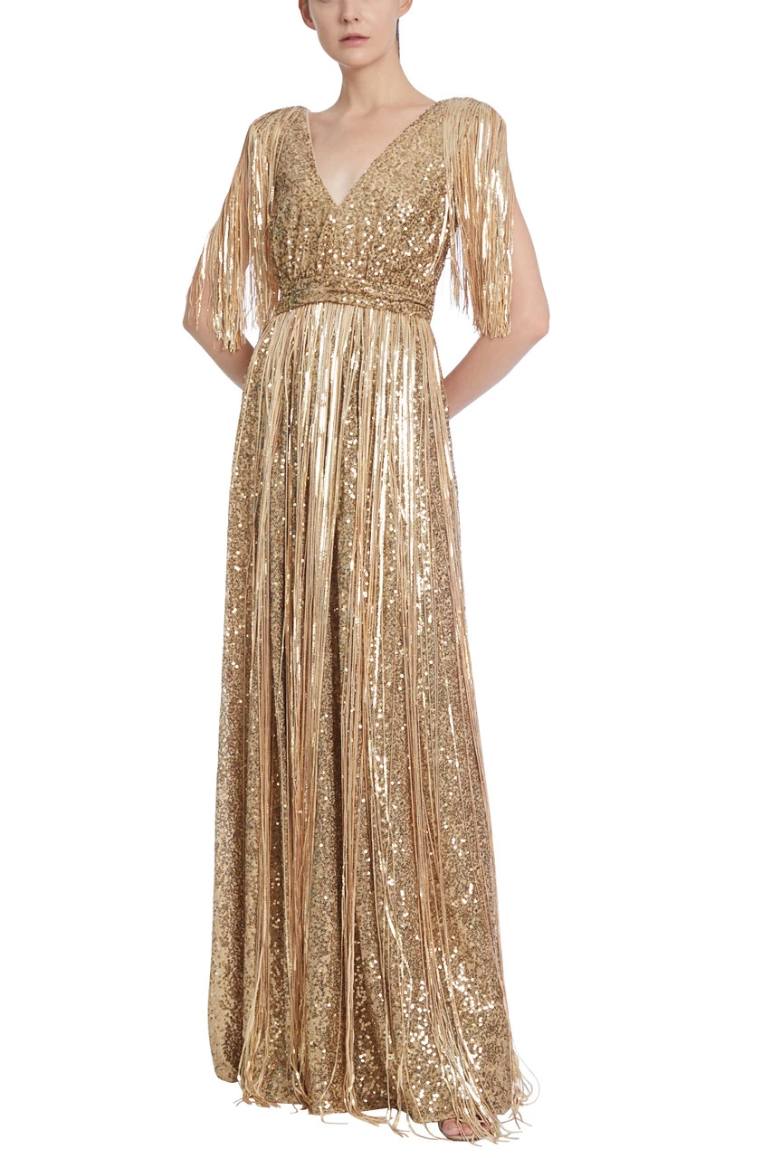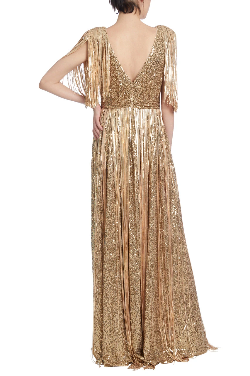 Sequins cover the entire gown, which flows to the floor in a fluid column shape. The fringes draping from the shoulders and waistline add additional movement to its design, complementing the elegant V-shaped neckline which flows into an open back. The result is a glamorous dress that will dazzle on any occasion.
