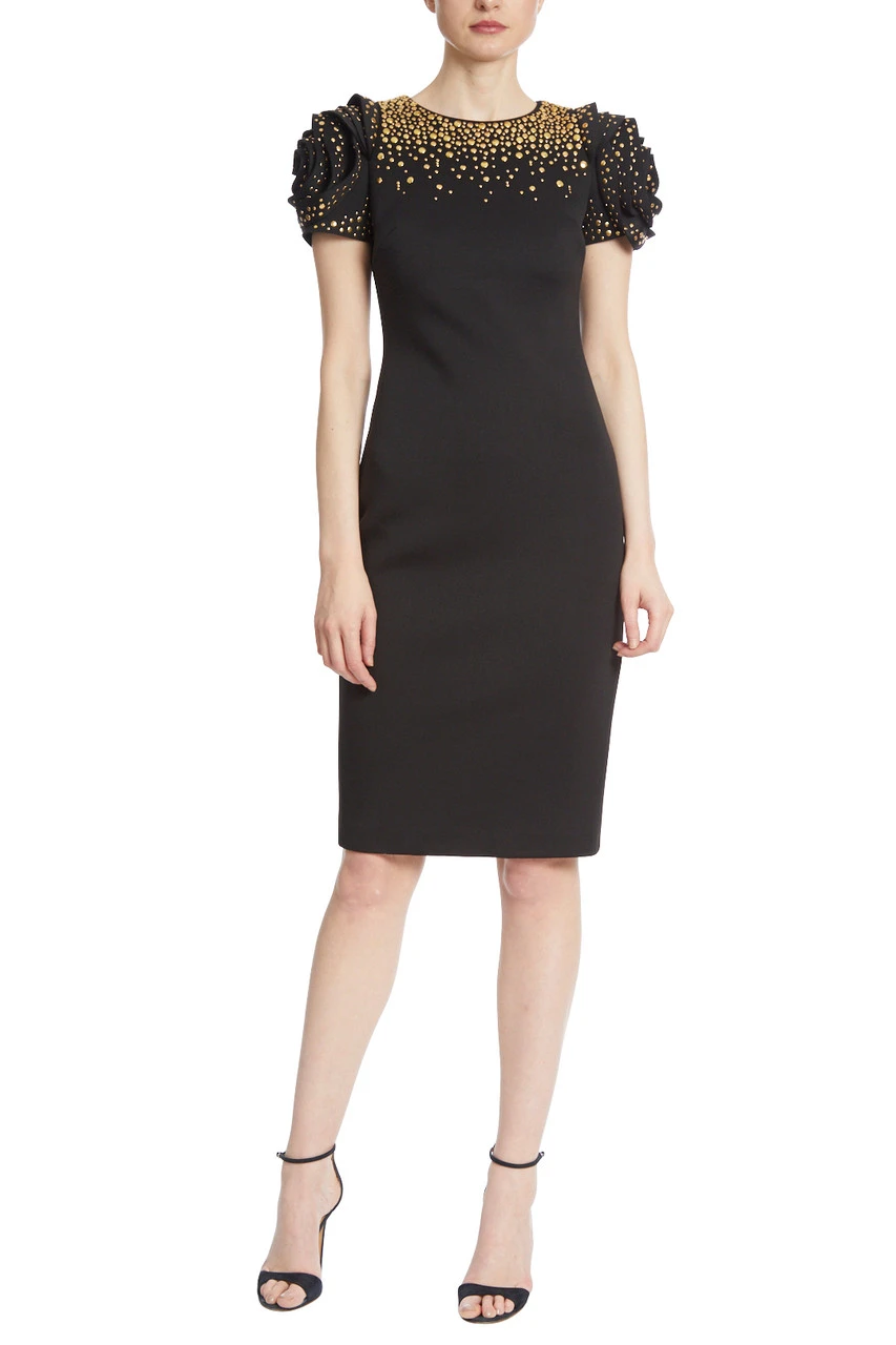 BSD4941 | Gold Studded Sheath Dress with Rosette Sleeves