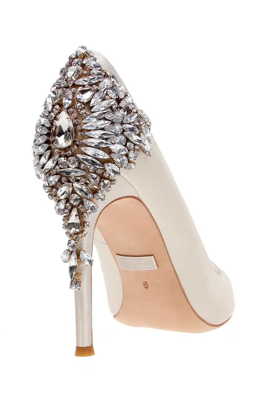 Clusters of sparkling crystals paired with a sleek pointed toe silhouette give the Badgley Mischka Gorgeous pointed toe pump sophisticated glamor. These lovely ivory satin pumps make beautiful bridal shoes and pair perfectly with wedding gowns of all shapes and designs. They can also be worn as wedding guest shoes and women’s evening shoes for events of all kinds.