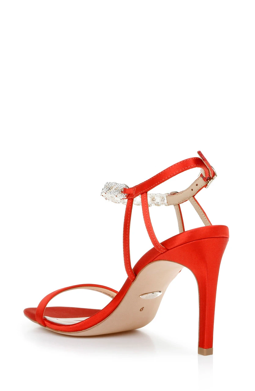 Kai lengthens the leg with her thin, stiletto heel. Her bejeweled ankle straps and smooth satin fabric look beautiful together. With her subtle height, you’ll feel taller, stronger, and more sensational. For a similar look with a medium wedge heel, see Kaelyn.