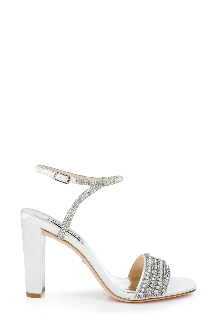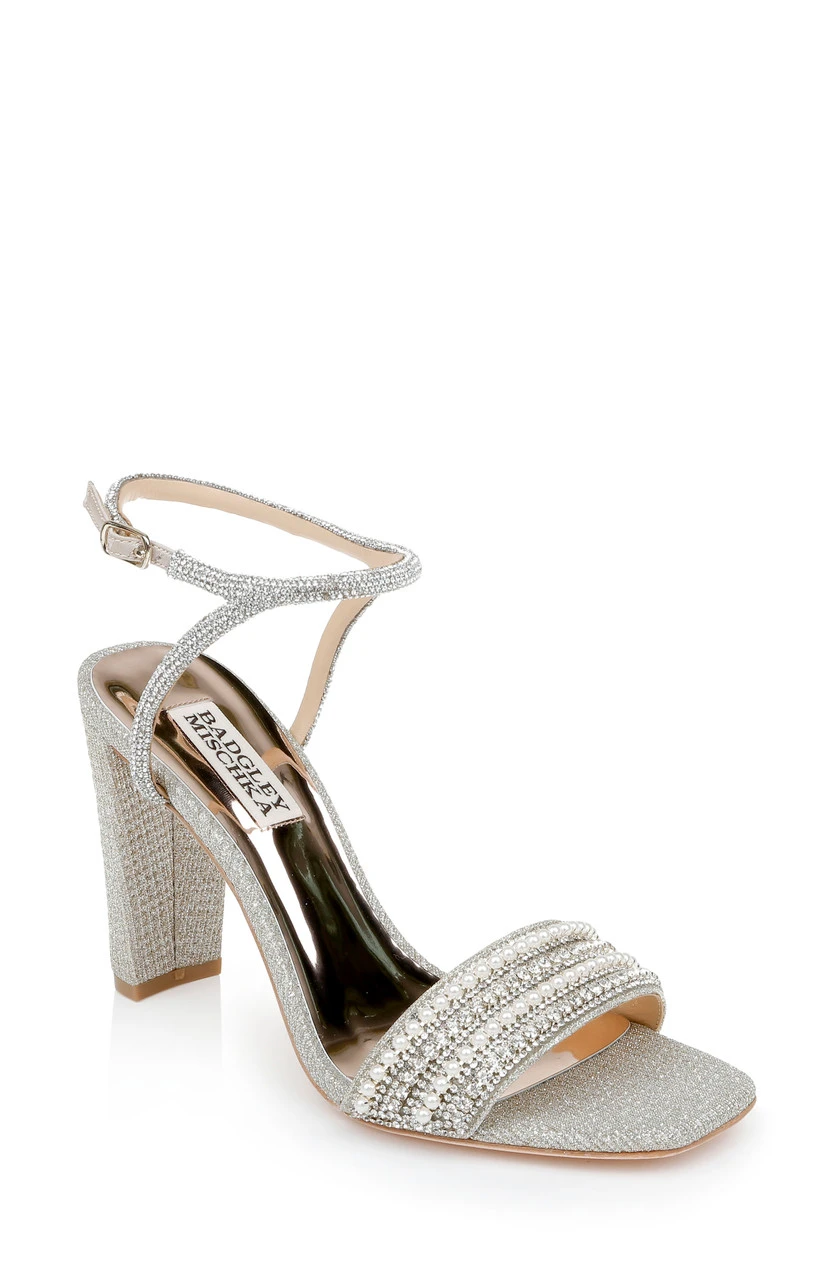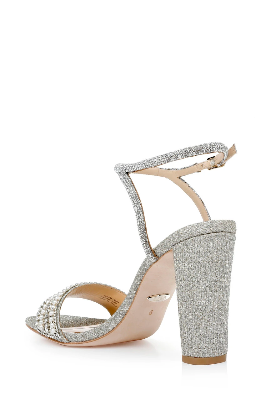 Kari showcases glamour with her pearl and jewel detailing and tall, block heel. She promises elevation in height, elegance, and style. See Kameryn for a similar look with a stiletto heel.