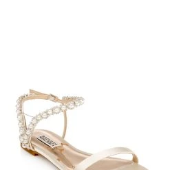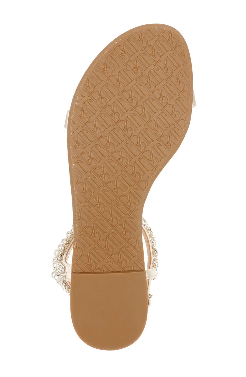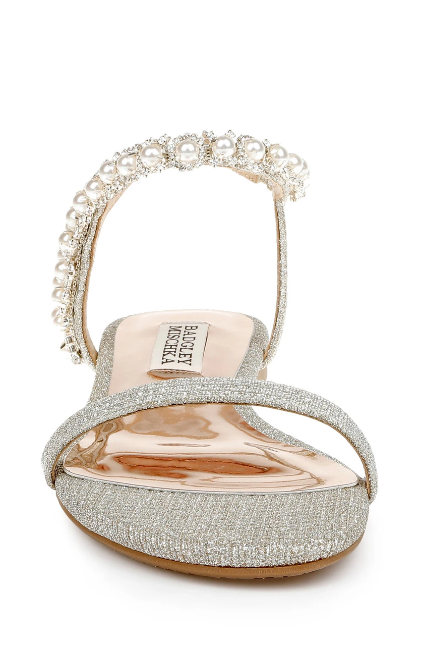 This simple flat sandal is elevated with a pearl and rhinestone adorned ankle strap, and delicate buckle fastening. For a block heel in a similar style, see Korina, and for a sophisticated stiletto with pearl persuasion, see Kris.