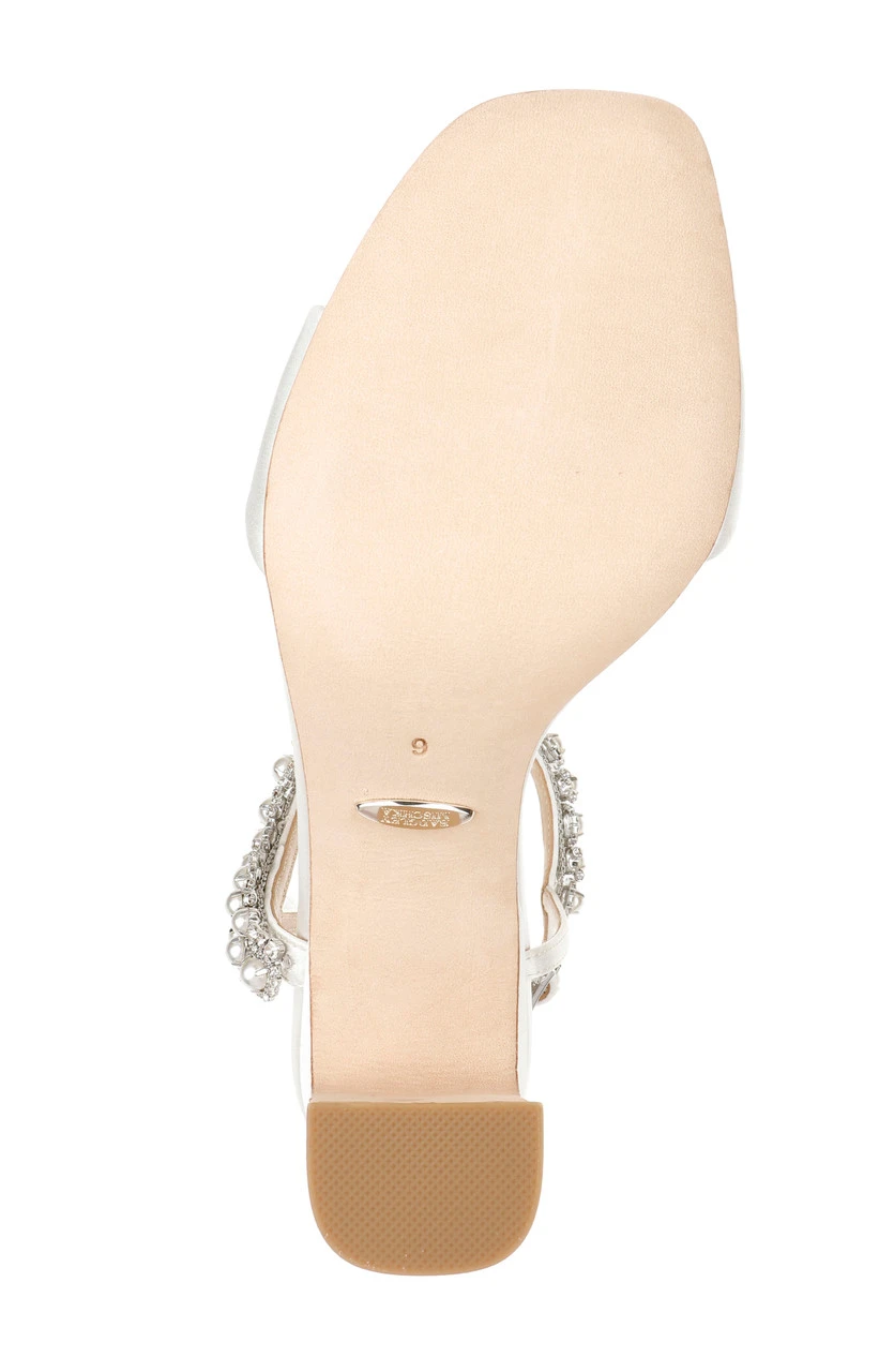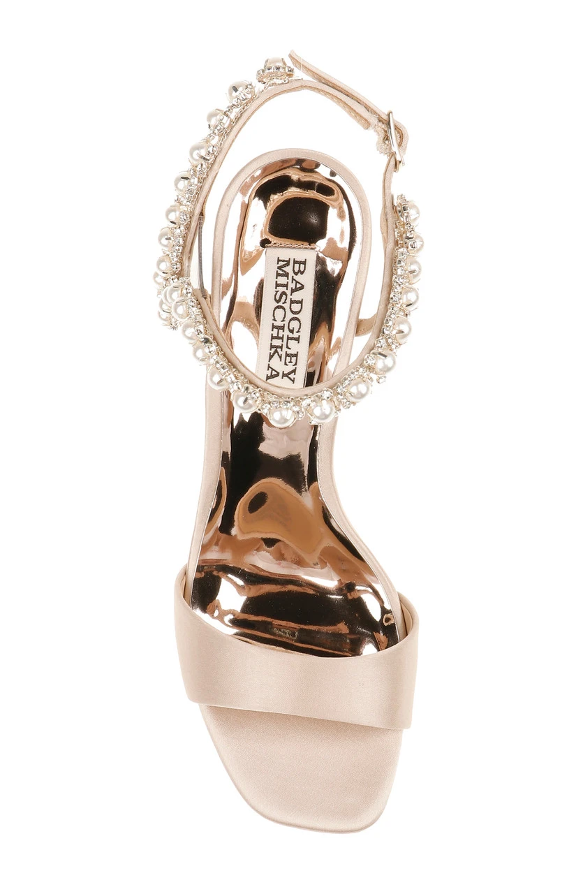 This look encourages you to dance, with a block heel and an open toe to keep you cool. Stunning pearls and rhinestones support your precious ankles and add detail to this design. For a flat sandal in a similar style, see Klare.