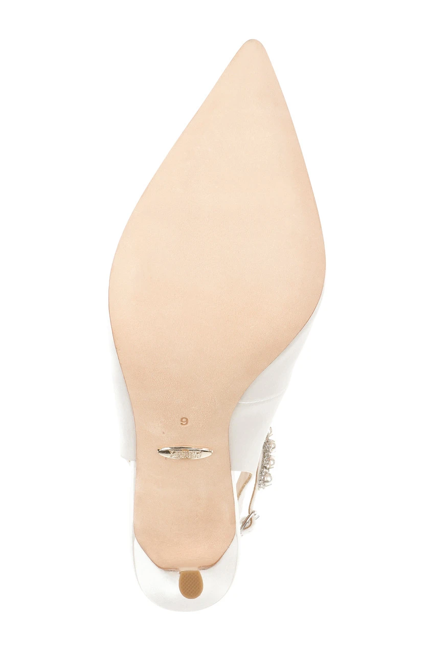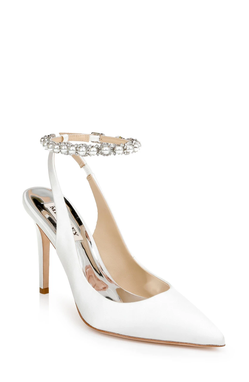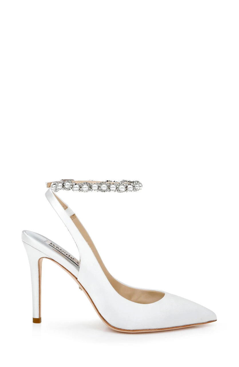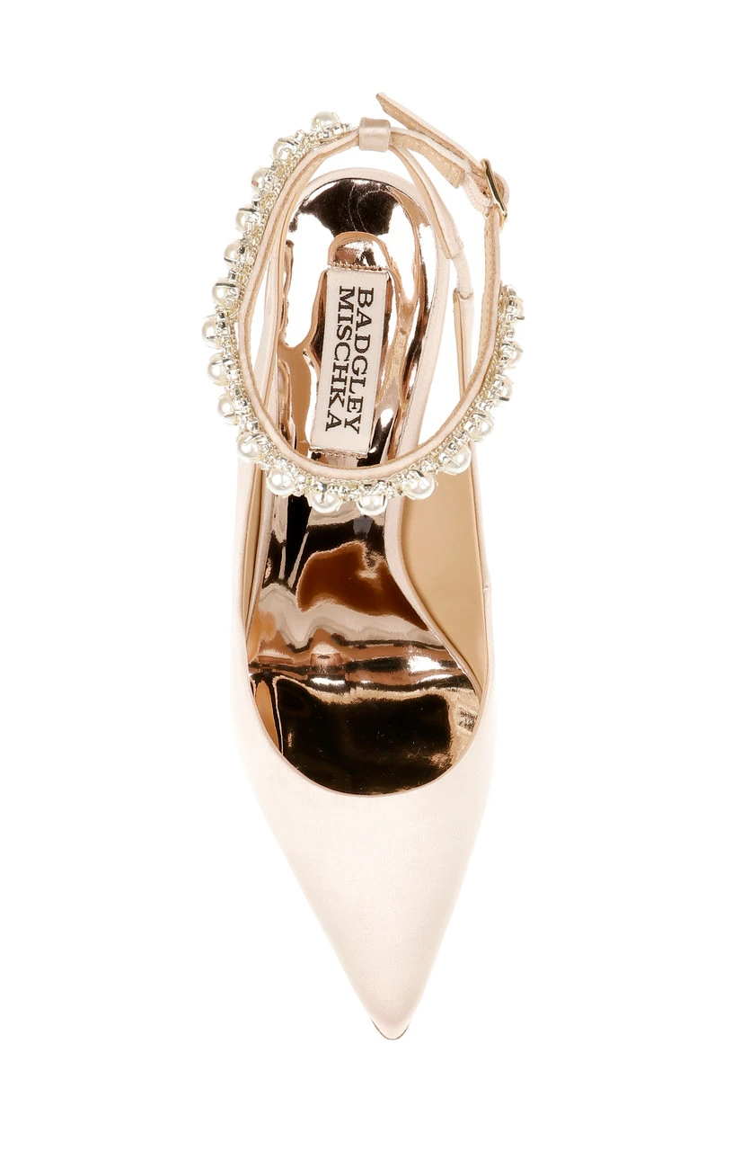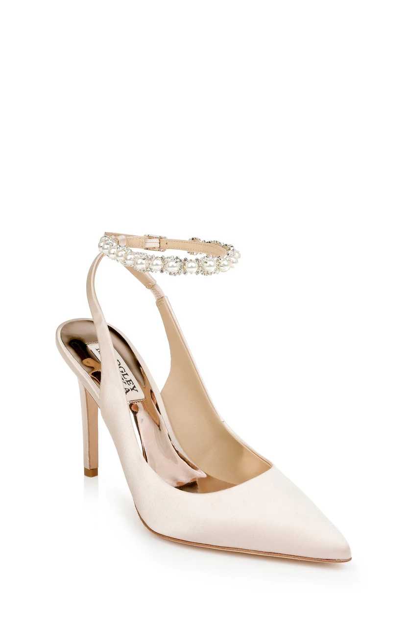 A luxurious look in sleek satin. The classic stiletto is elevated with a delicate ankle strap, adorned with rhinestones and pearls. For an open-toe take on this look, see Koko.