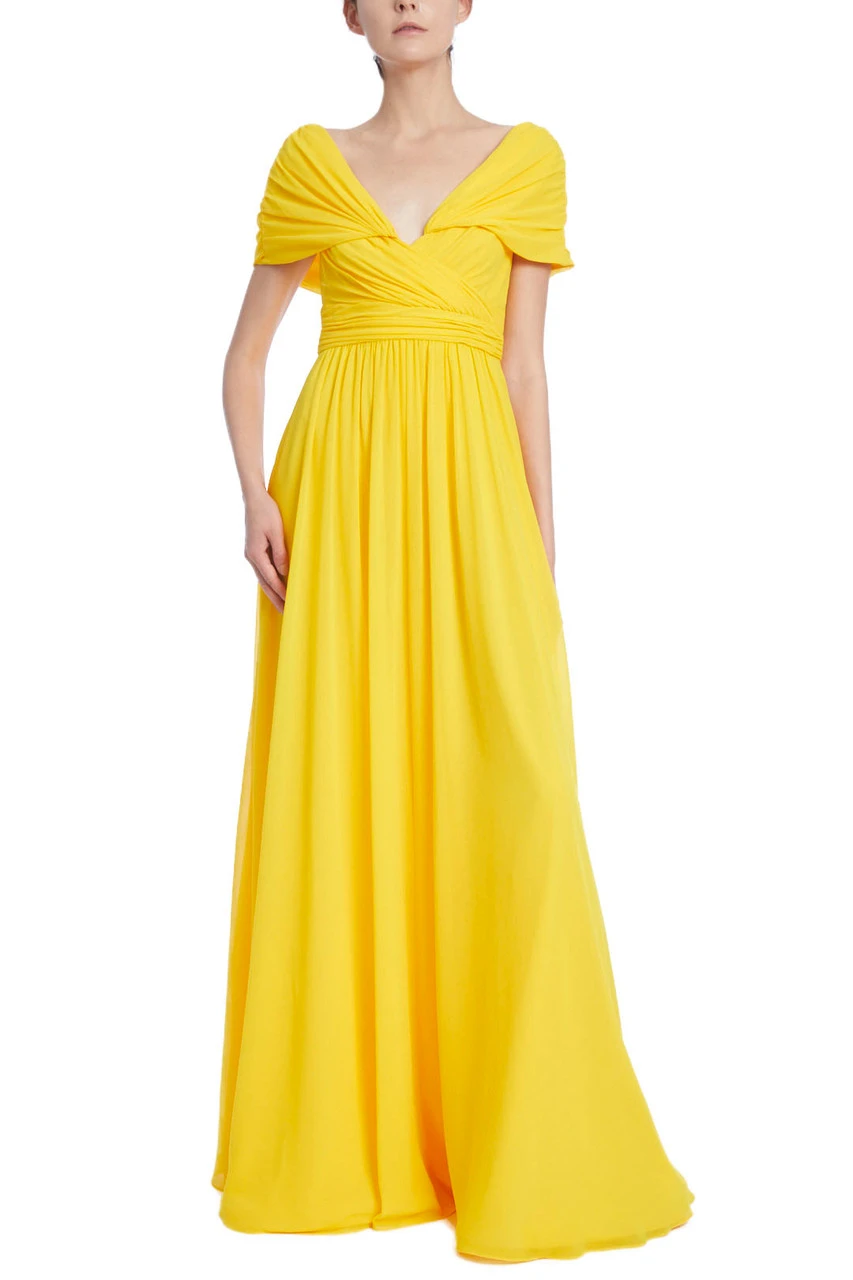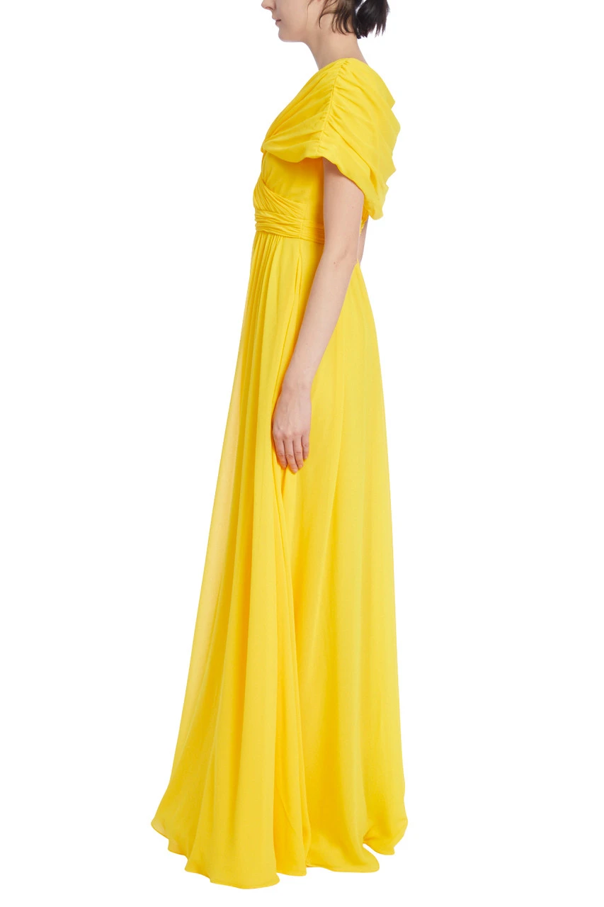 EG3832 | Lemon-Yellow Pleated Evening Gown with Ruched Bodice