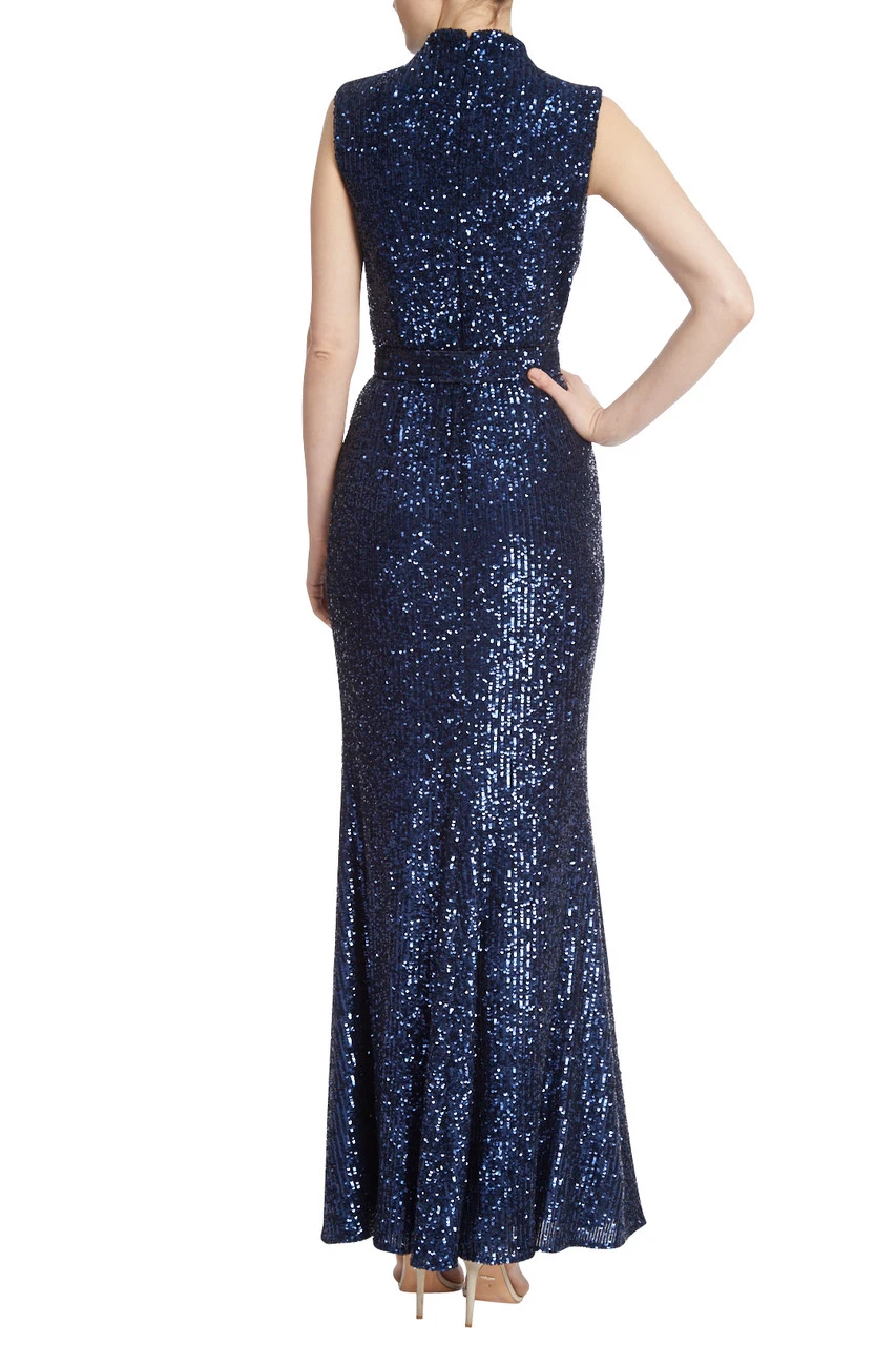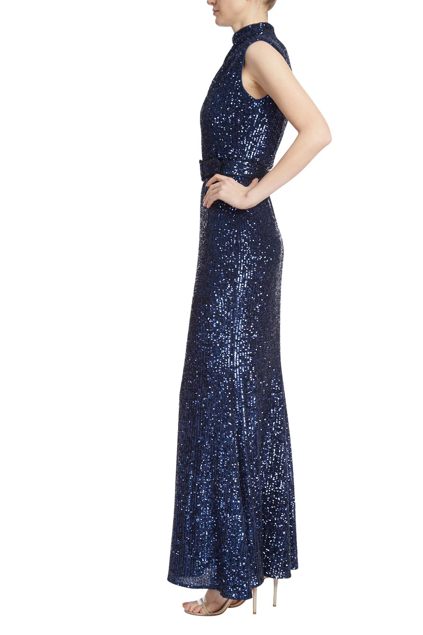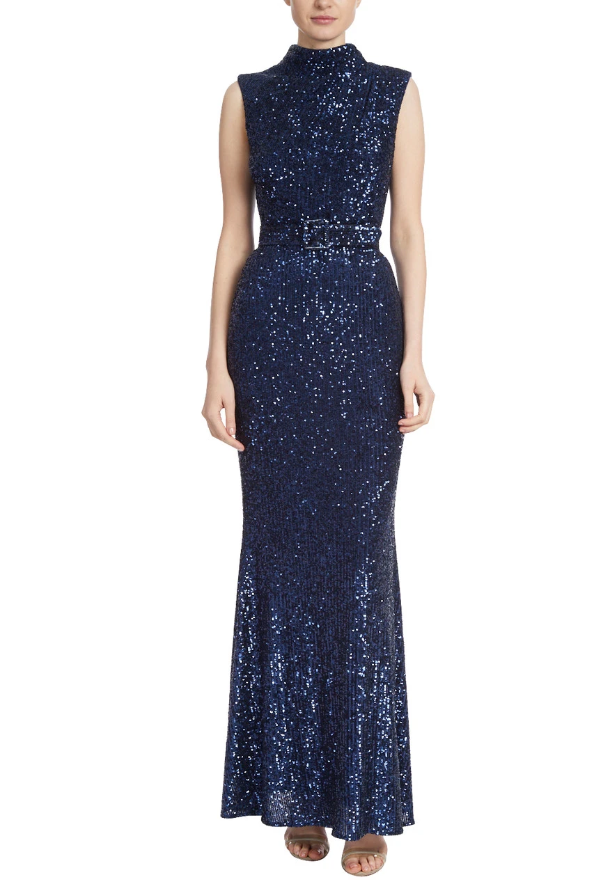 Adorned with the shiniest of sequins, this gown will make you the center of attention at any upscale event. The floor length hem and draped mock neck add classic elegance to this beautiful dress, while a belt cinches the waist for a flattering silhouette that enhances your figure.
