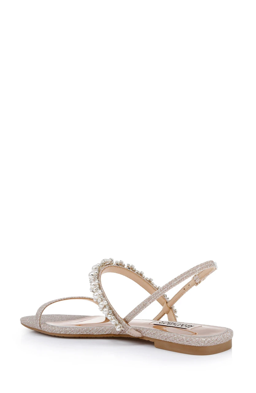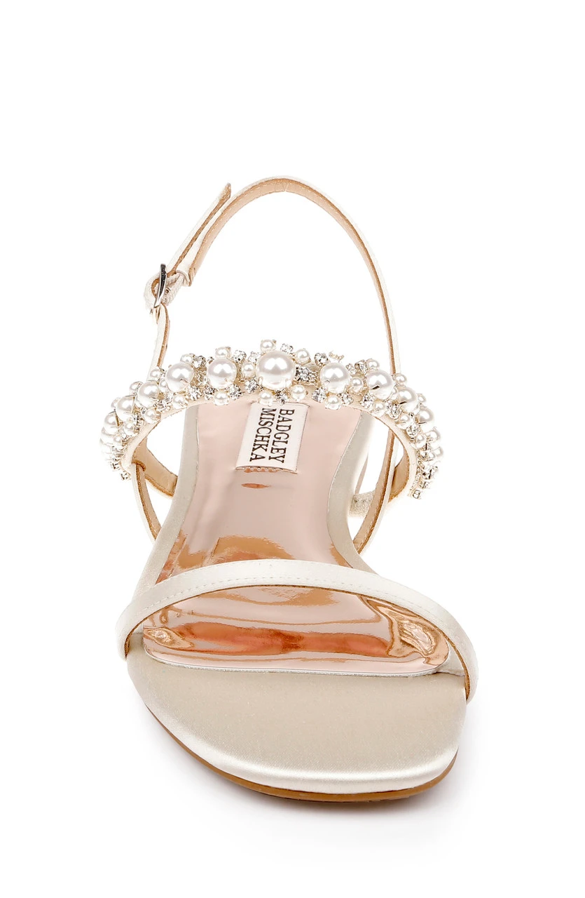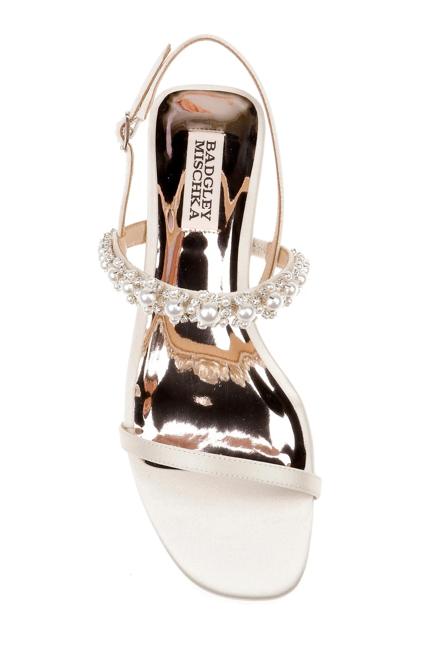 Muted metallics, neutrals, shimmer, and satin infuse luxury into every step. The delicate back strap and vamp are lovely but the adornment, featuring pearls and crystals, is the star of this look.