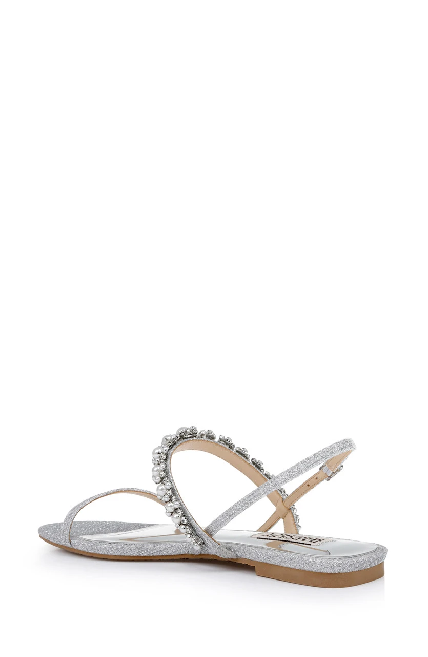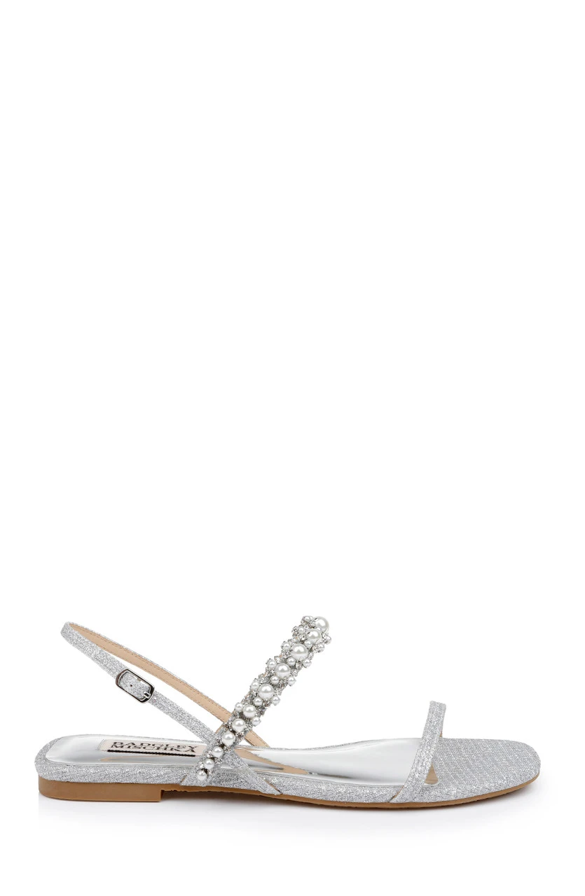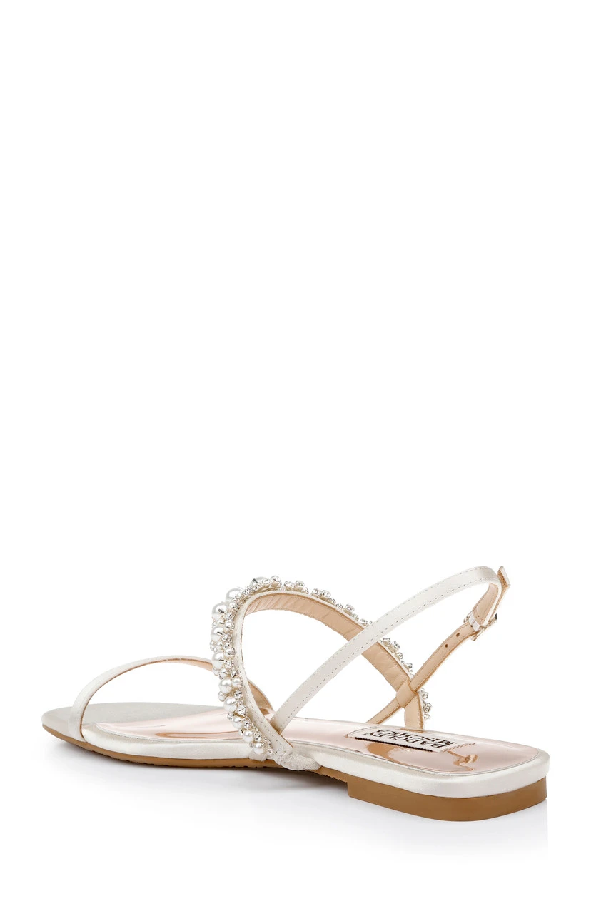 Muted metallics, neutrals, shimmer, and satin infuse luxury into every step. The delicate back strap and vamp are lovely but the adornment, featuring pearls and crystals, is the star of this look.