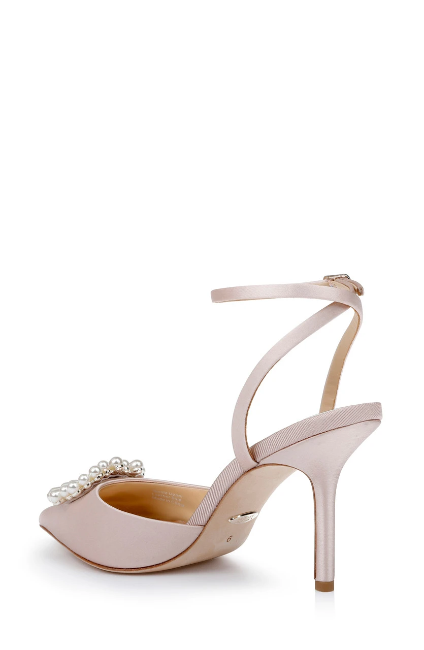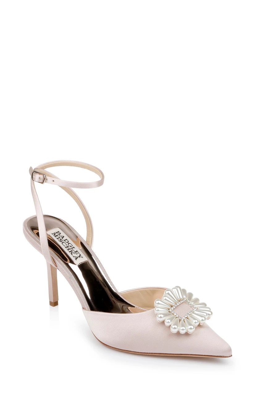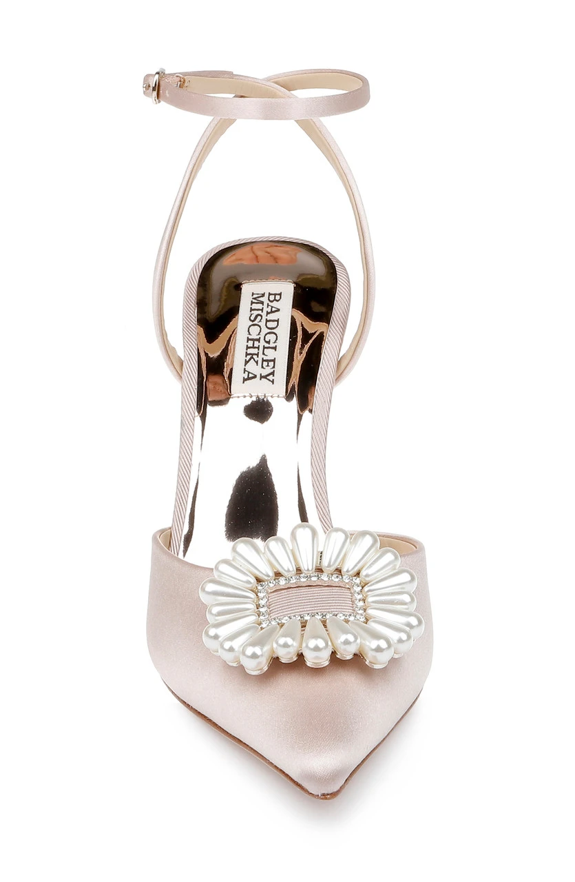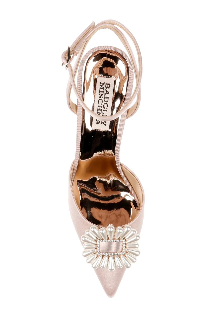 Tap into your femininity with a stiletto that elongates the leg and boosts your confidence at the same time. A pretty pearl adornment sits majestically atop the pointed toe, and delicate straps frame your ankles.