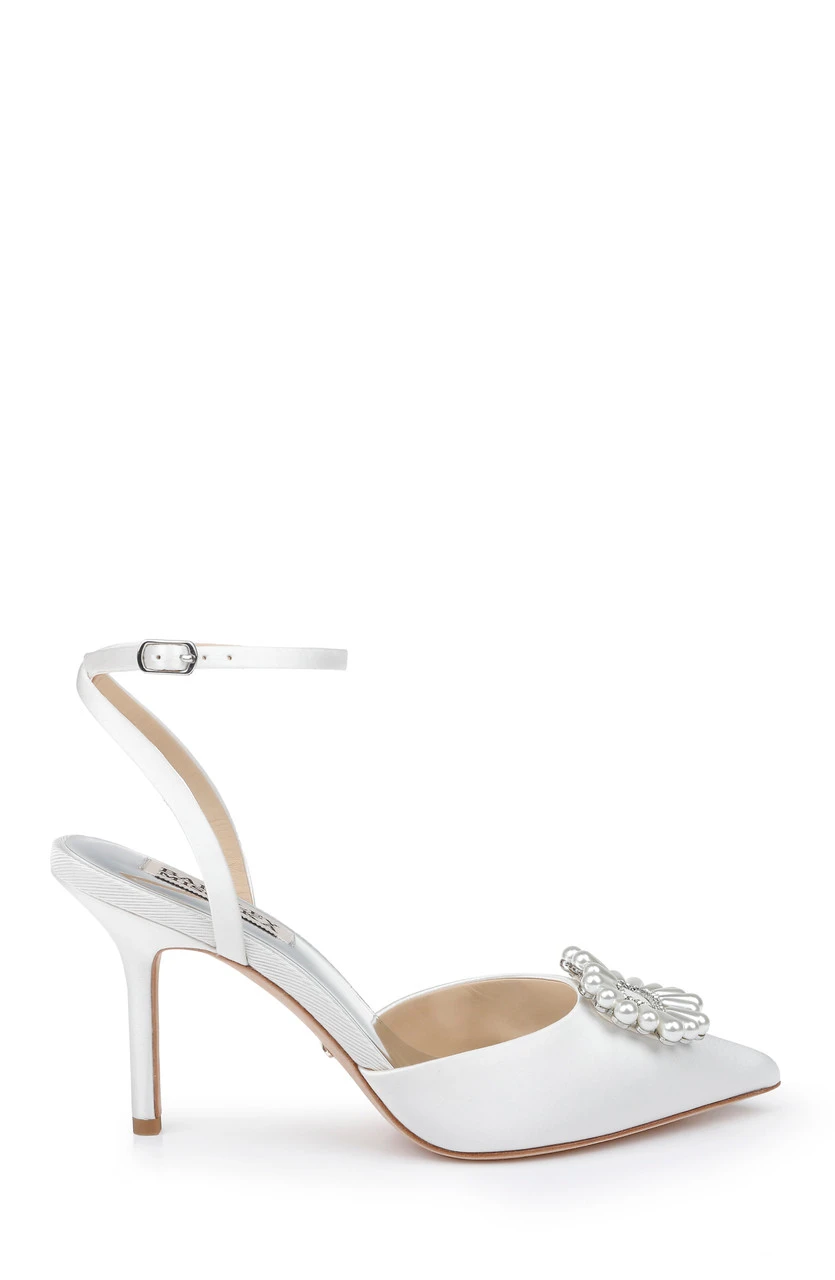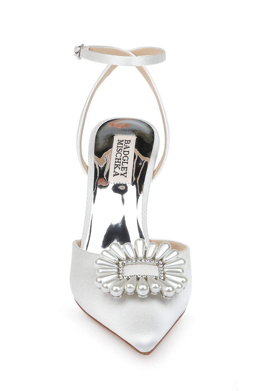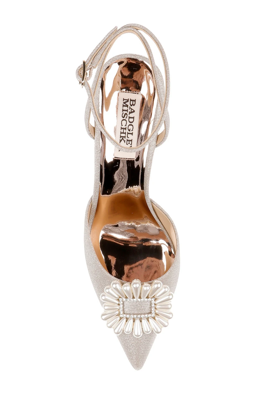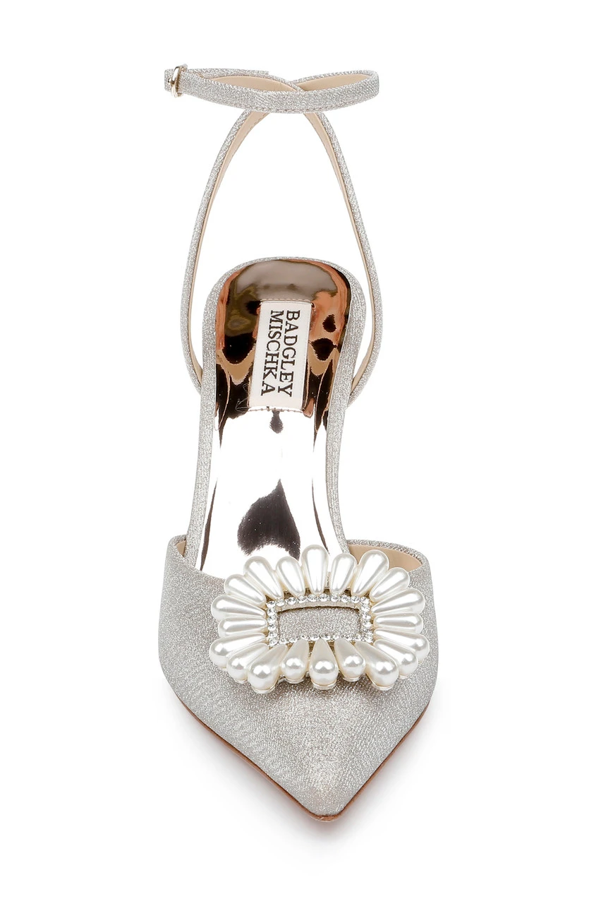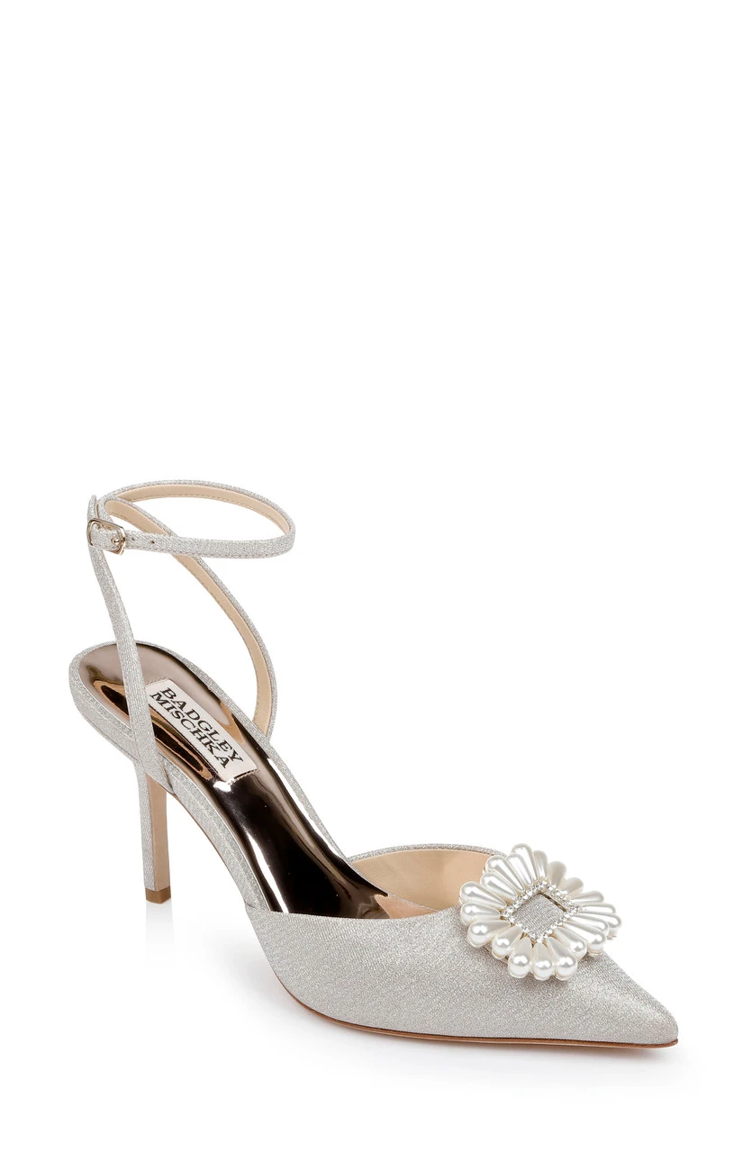 Tap into your femininity with a stiletto that elongates the leg and boosts your confidence at the same time. A pretty pearl adornment sits majestically atop the pointed toe, and delicate straps frame your ankles.
