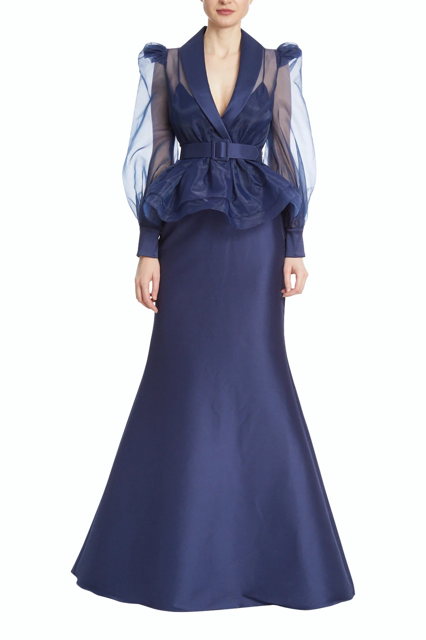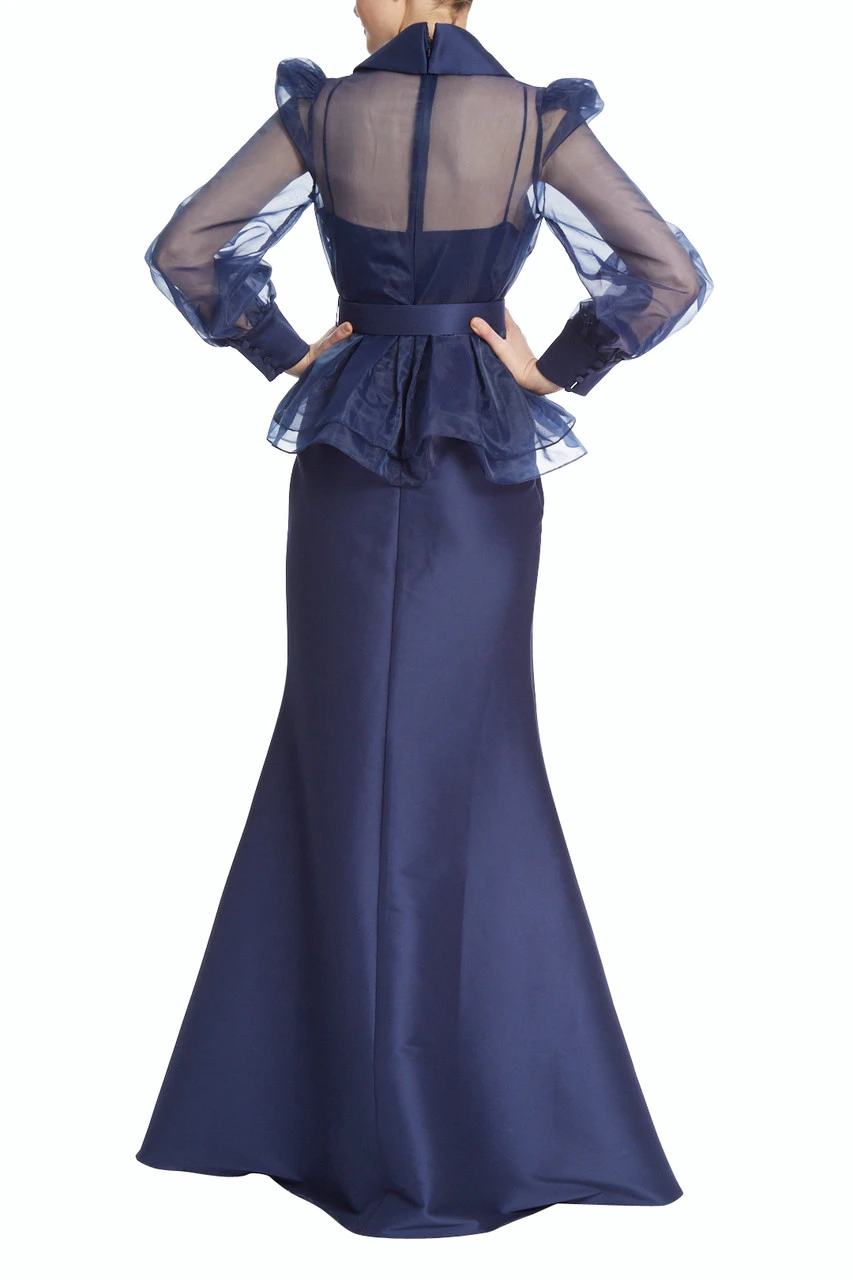 This gown’s peplum bodice is made from organza, which gives way to a flattering layered effect. Long sleeves and a belted waist further enhance the elegance of this design, making it the perfect choice for any formal occasion.