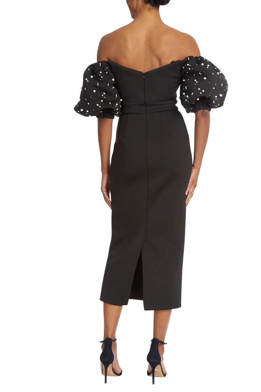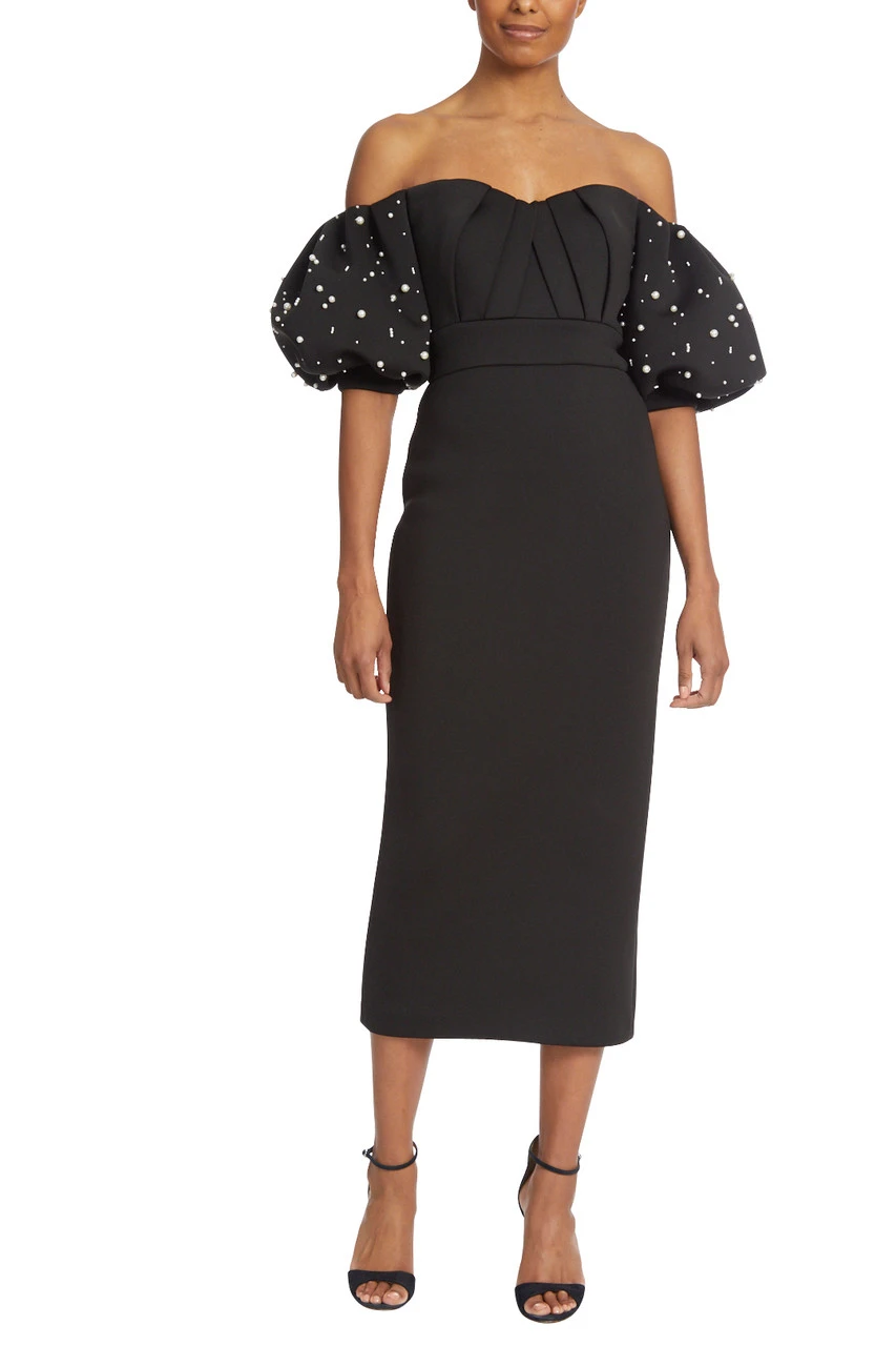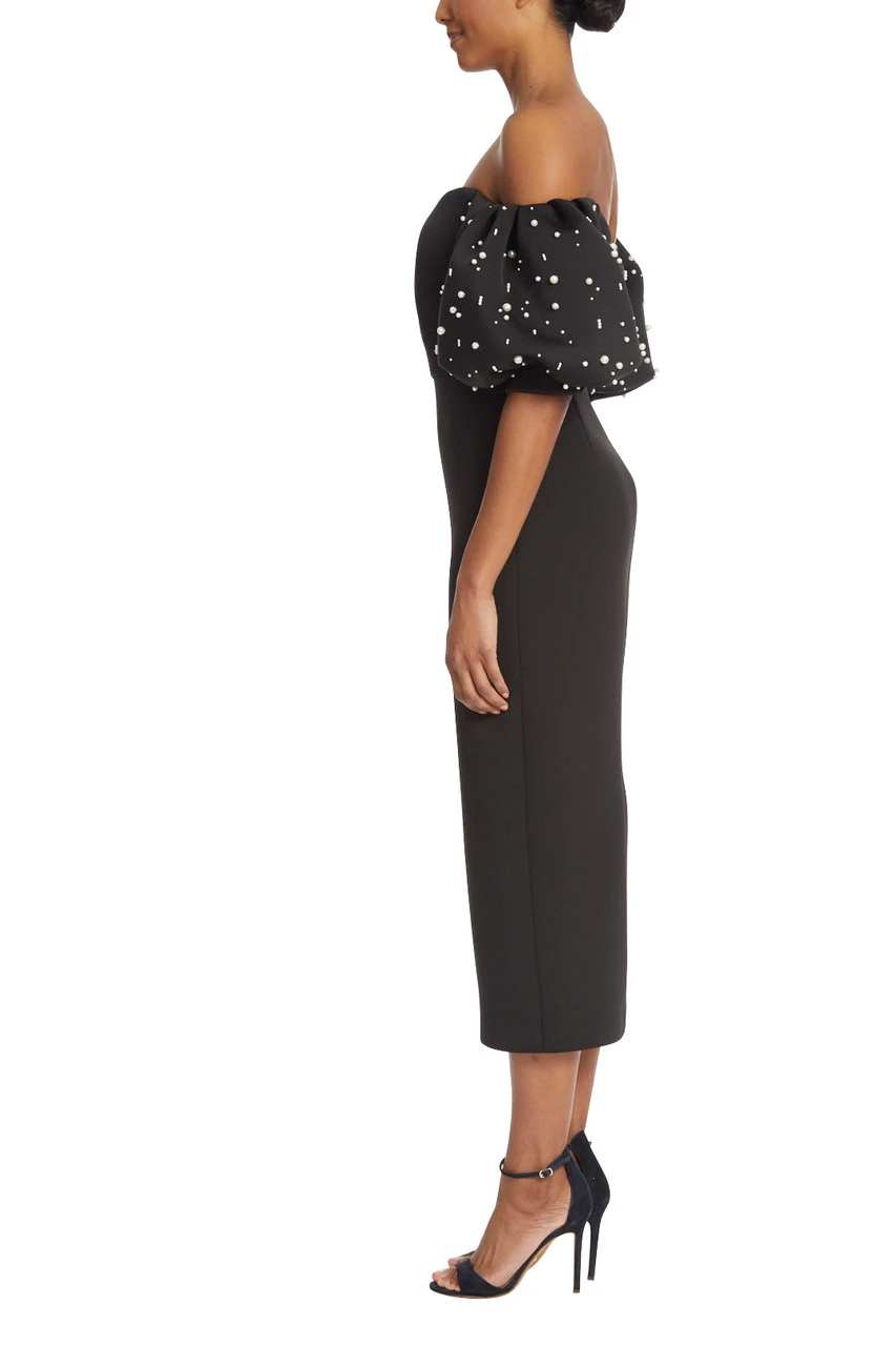 This sleek sheath dress, with its fitted silhouette and below-the-knee hemline, is sure to make a statement. Pleating at the bodice adds elegance and interest to this otherwise simple silhouette, and pearls on the puff sleeves give a nod to feminine glamour. The scuba fabric hugs your body for an ultra-flattering fit while still feeling comfortable all night long.