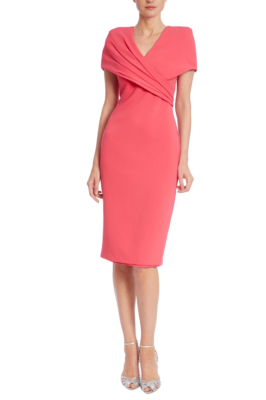 The classic sheath dress is back and better than ever. This time, we’ve given it a modern, chic spin with wide short sleeves and a faux pleated wrap in the front. Dress it up or down depending on your occasion, and let this dress take you from daytime to nighttime with ease.