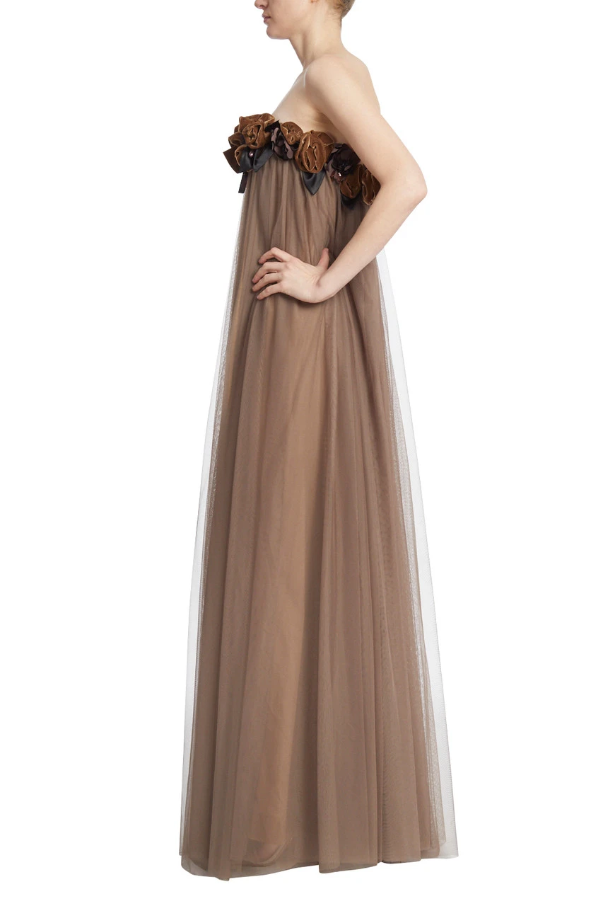 This strapless gown is stunning, yet simple, from the crown of velvet flowers at the chest to the effortless sway of the tulle skirt. The effect is as dramatic as it is romantic.