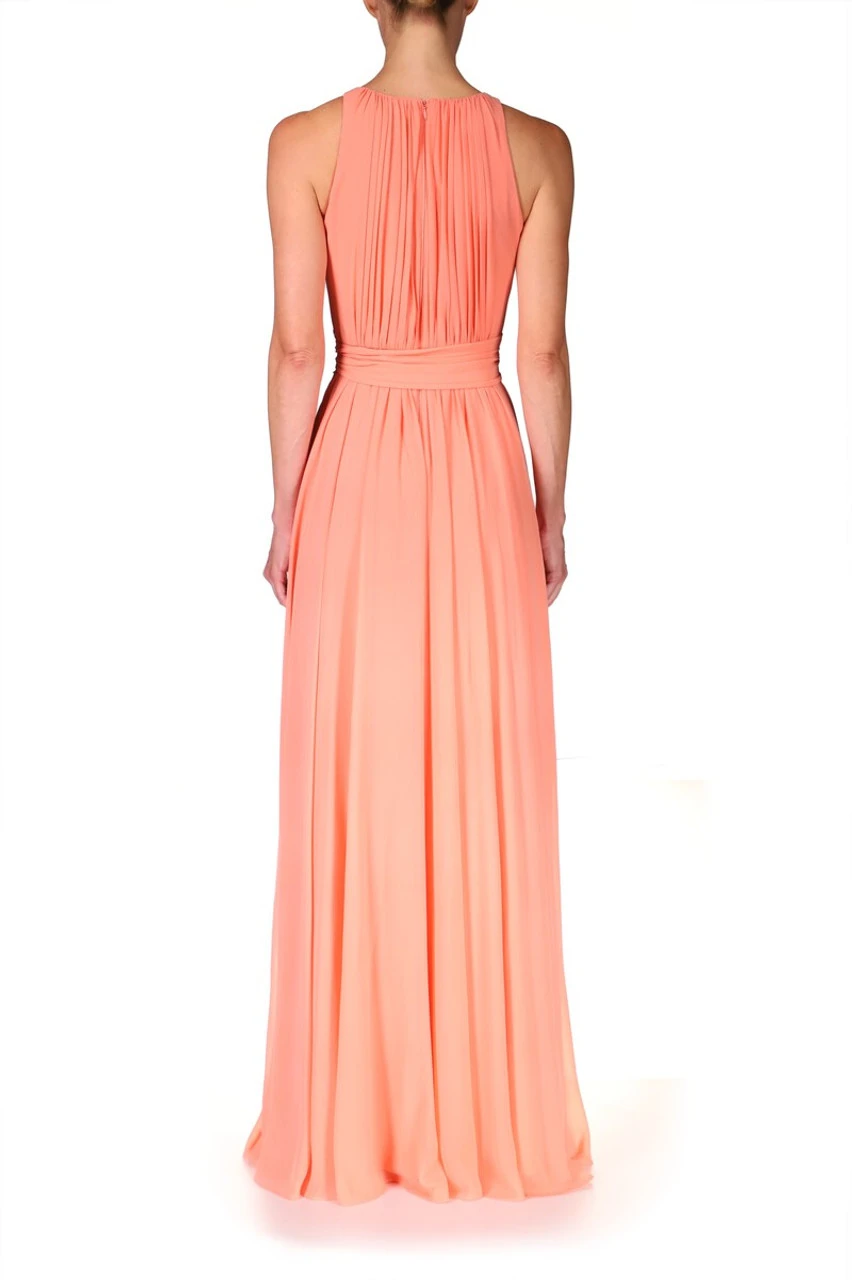Pleats perfectly detail this gown, from top to toe. Georgette falls in perfect formation at your feet, and a sash tie highlights your waist.