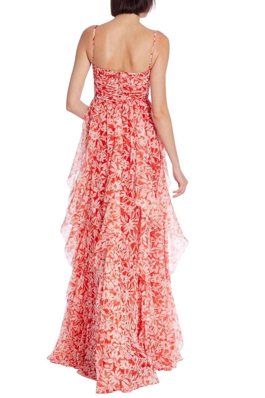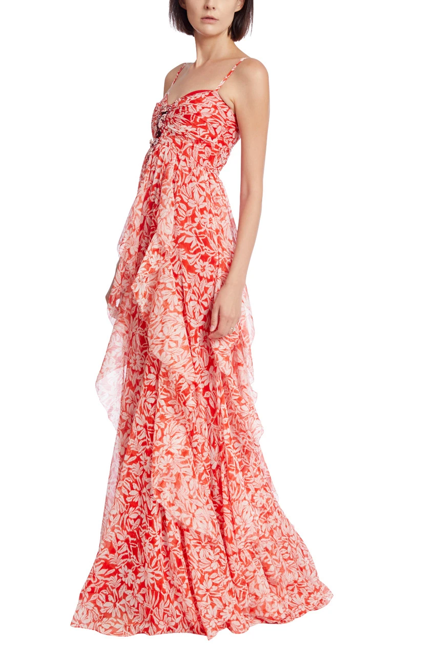 The sleeveless silhouette and sweetheart neckline of this stunning gown are accented by sparkling embellishments along the breastbone, adding an unexpected touch of glamour. The cascading layers of floral-printed fabric falling below it complete this exquisitely feminine silhouette and make it one you’ll be reaching for time and time again.