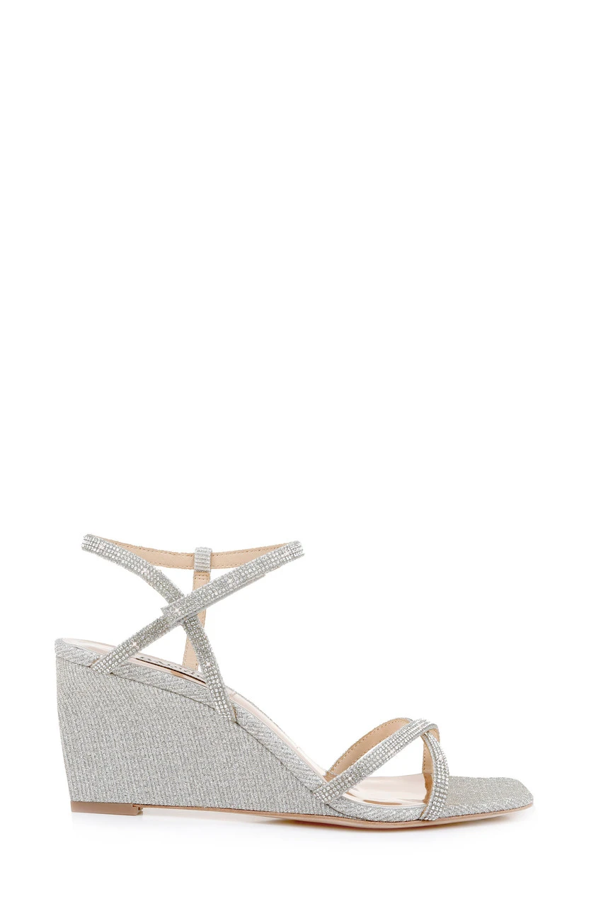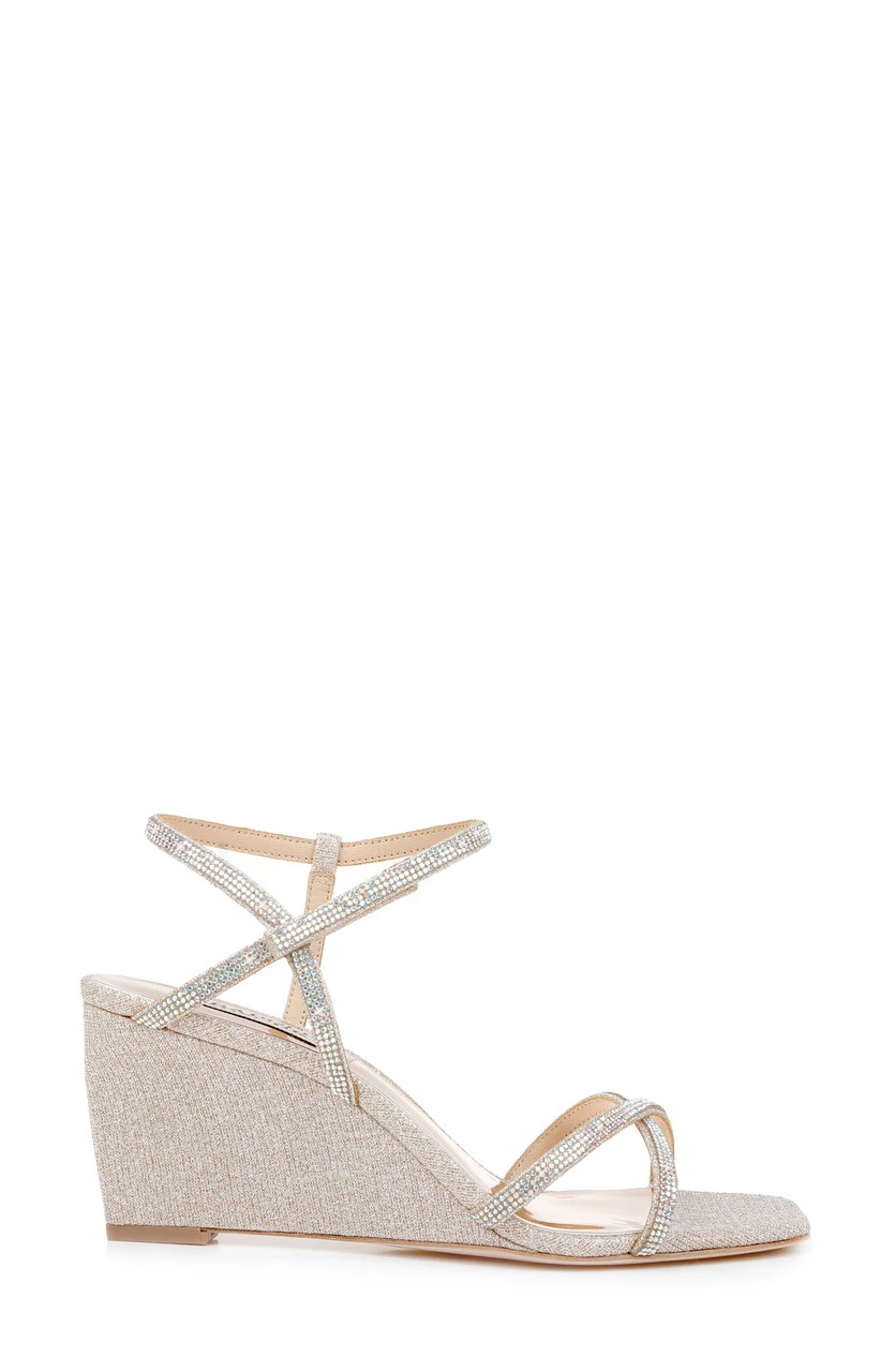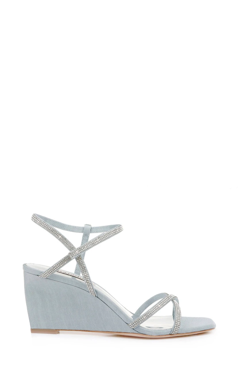 The Reagan wedge heel comes in three subtle colors to match any outfit: whisper blue, pale gold and platinum. These wedge heels are detailed with delicate straps, crisscrossing the toe and ankle area.Â