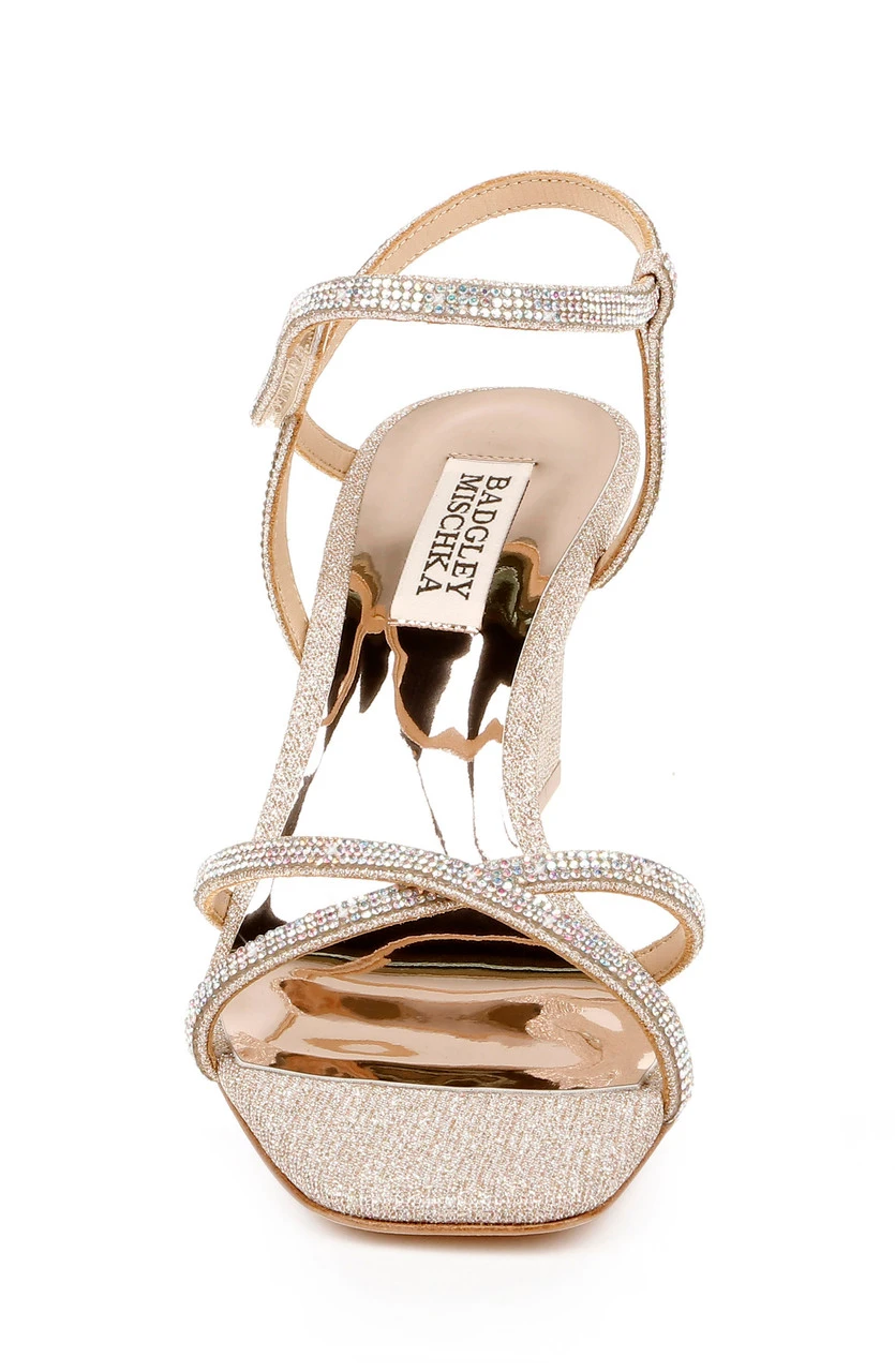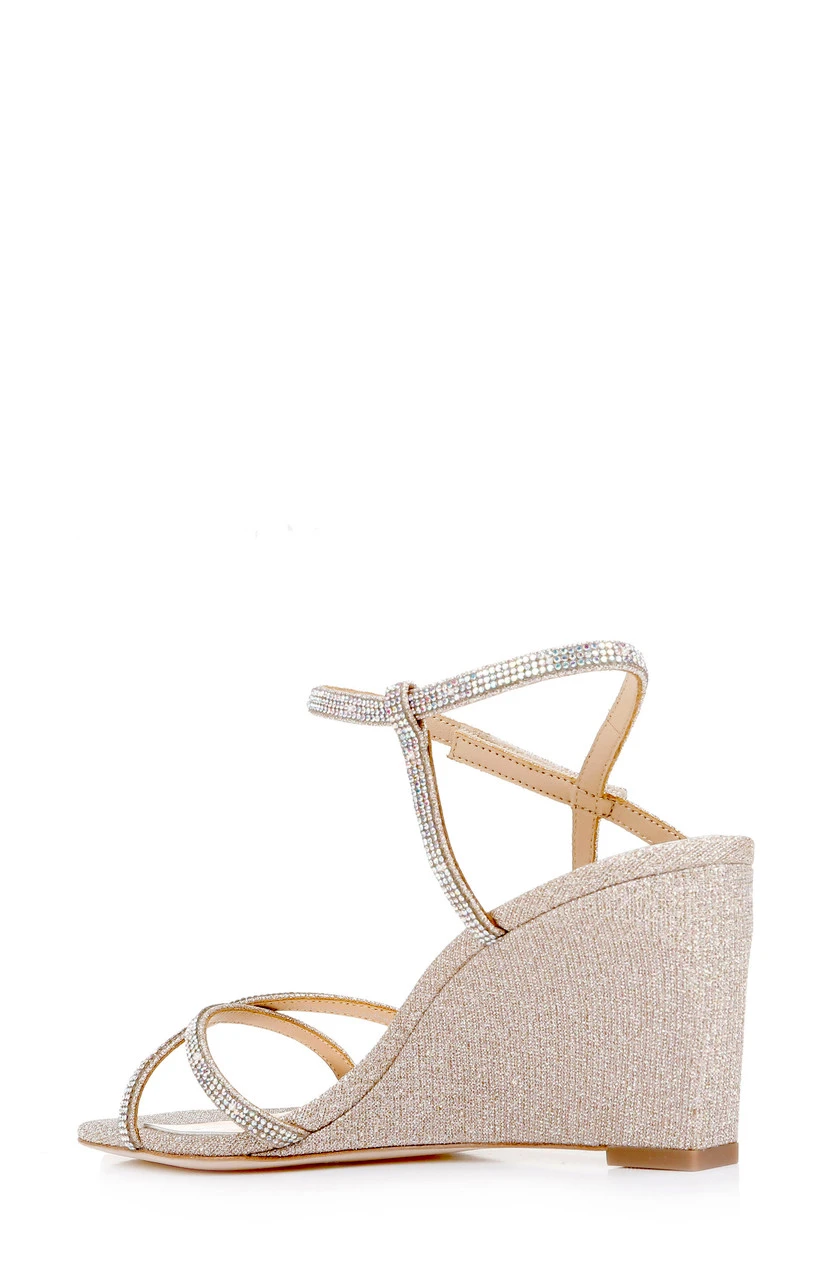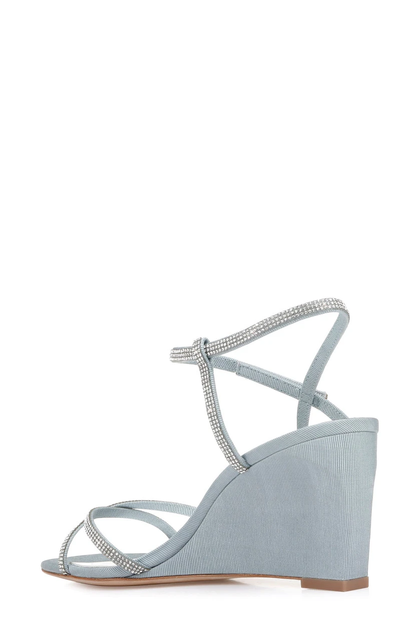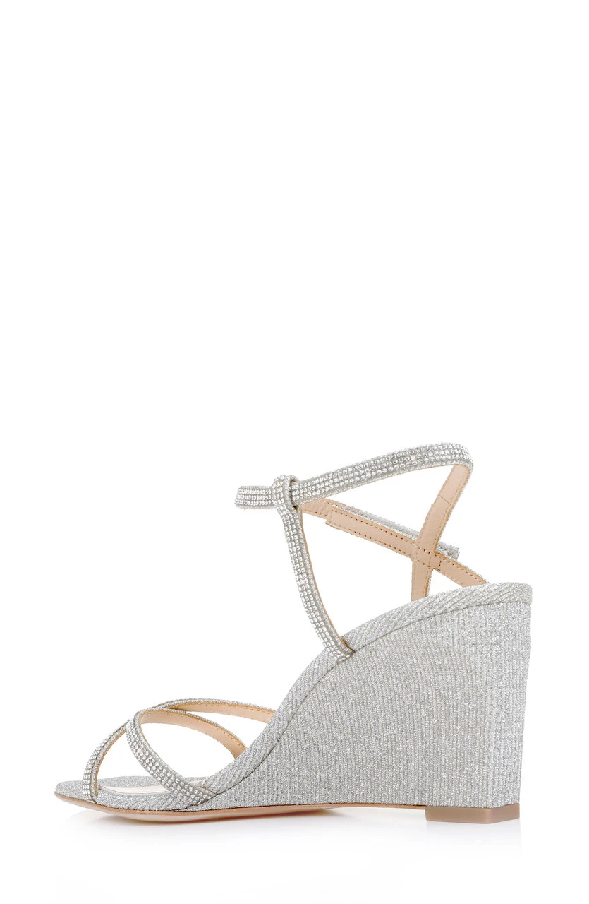 The Reagan wedge heel comes in three subtle colors to match any outfit: whisper blue, pale gold and platinum. These wedge heels are detailed with delicate straps, crisscrossing the toe and ankle area.Â