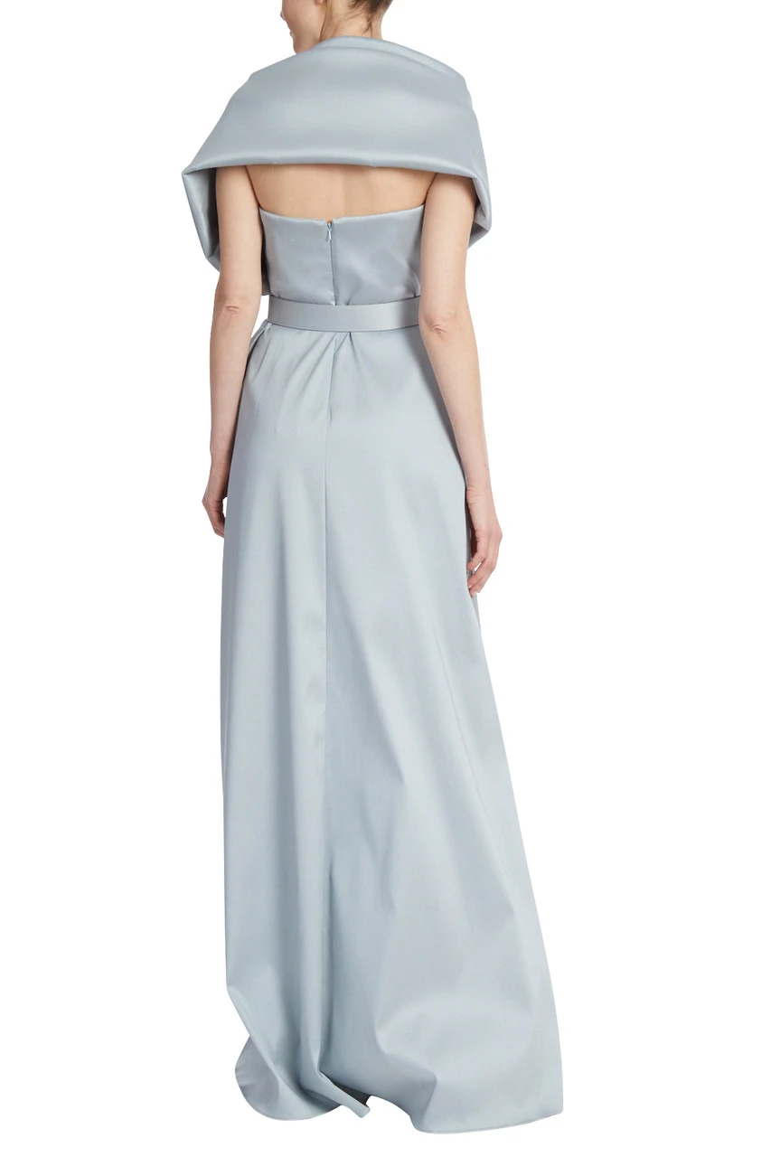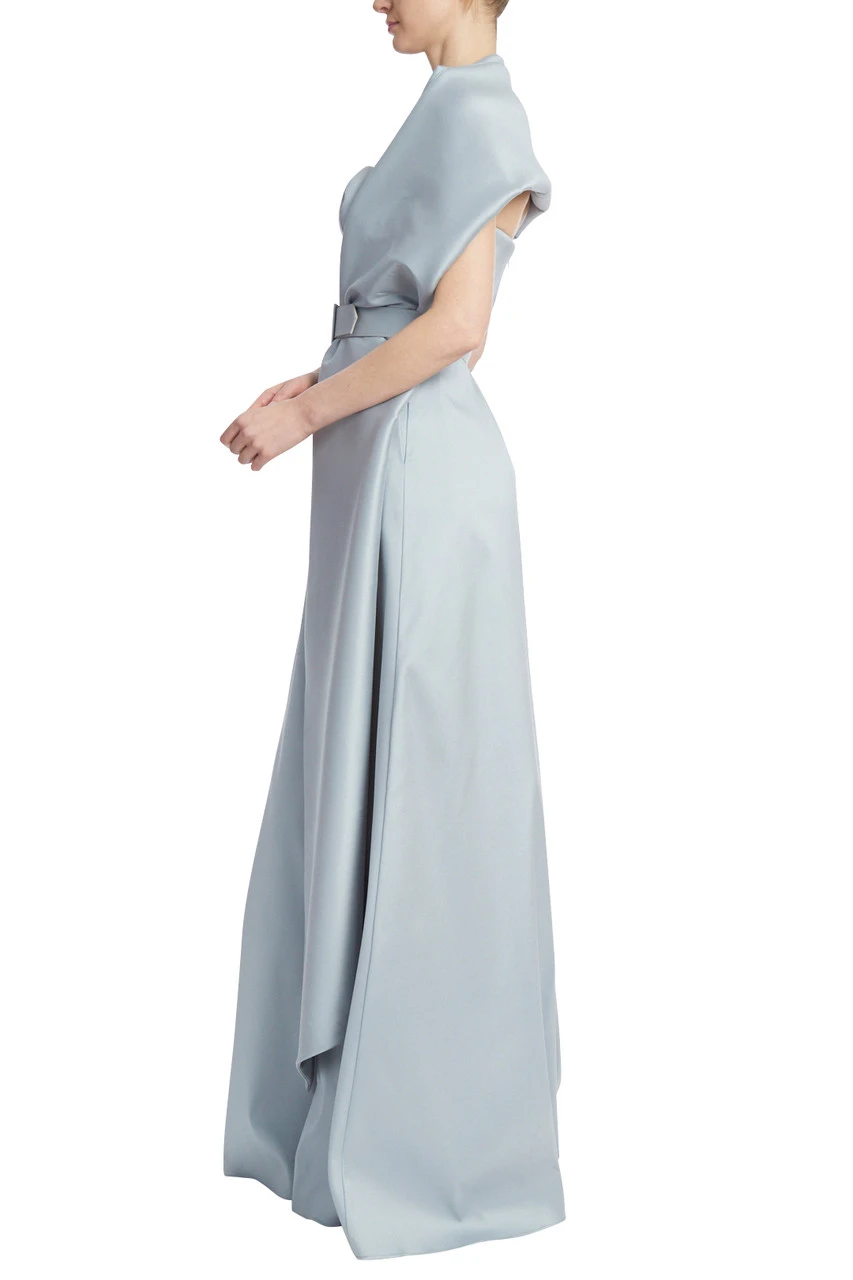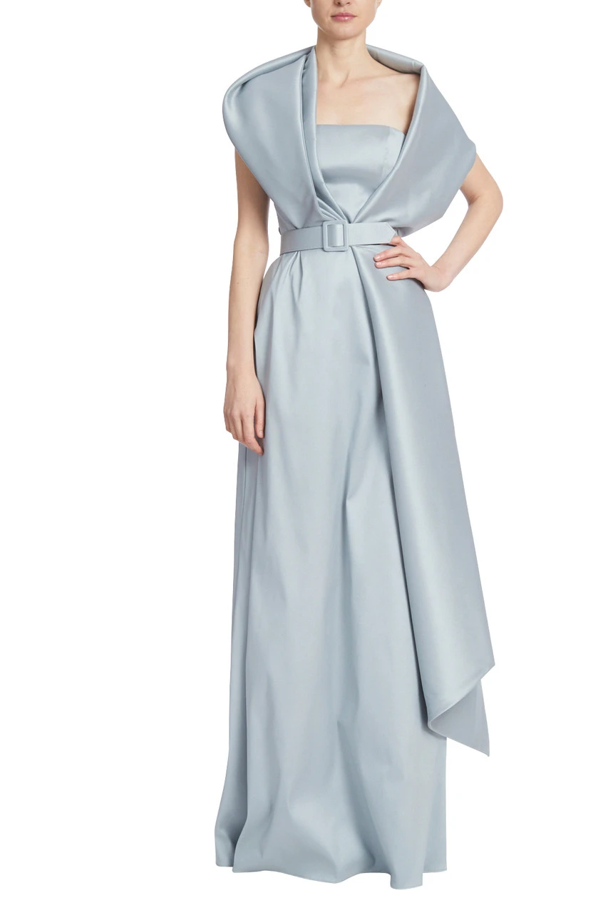 This gown envelopes your form in the most sumptuous Mikado fabric. Get playful with the wrap, which is attached at one side, and wear it asymmetrically, looped through the belt, or over both shoulders for a gracious, regal look.